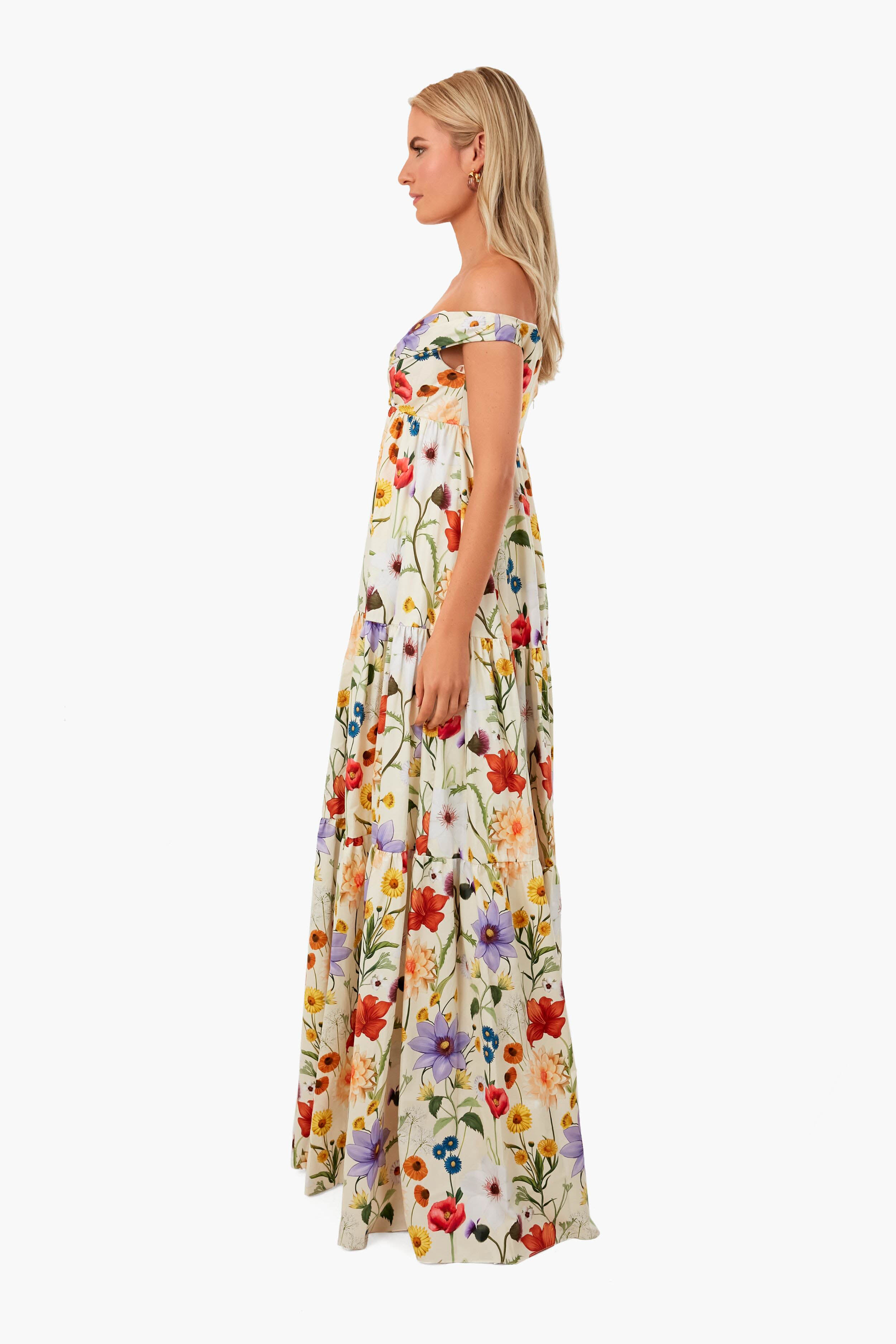 The Ravello Cream Athena Cotton Dress is a tribute to strength. confidence. and femininity. With an off the shoulder fit. a gentle v-neckline. and a glorious large floral print. this silhouette is sure to be a favorite piece in any closet. Sophisticated and stunning. this is a dress to make an entrance in. Style with heels and a clutch for formal occasions of any kind.