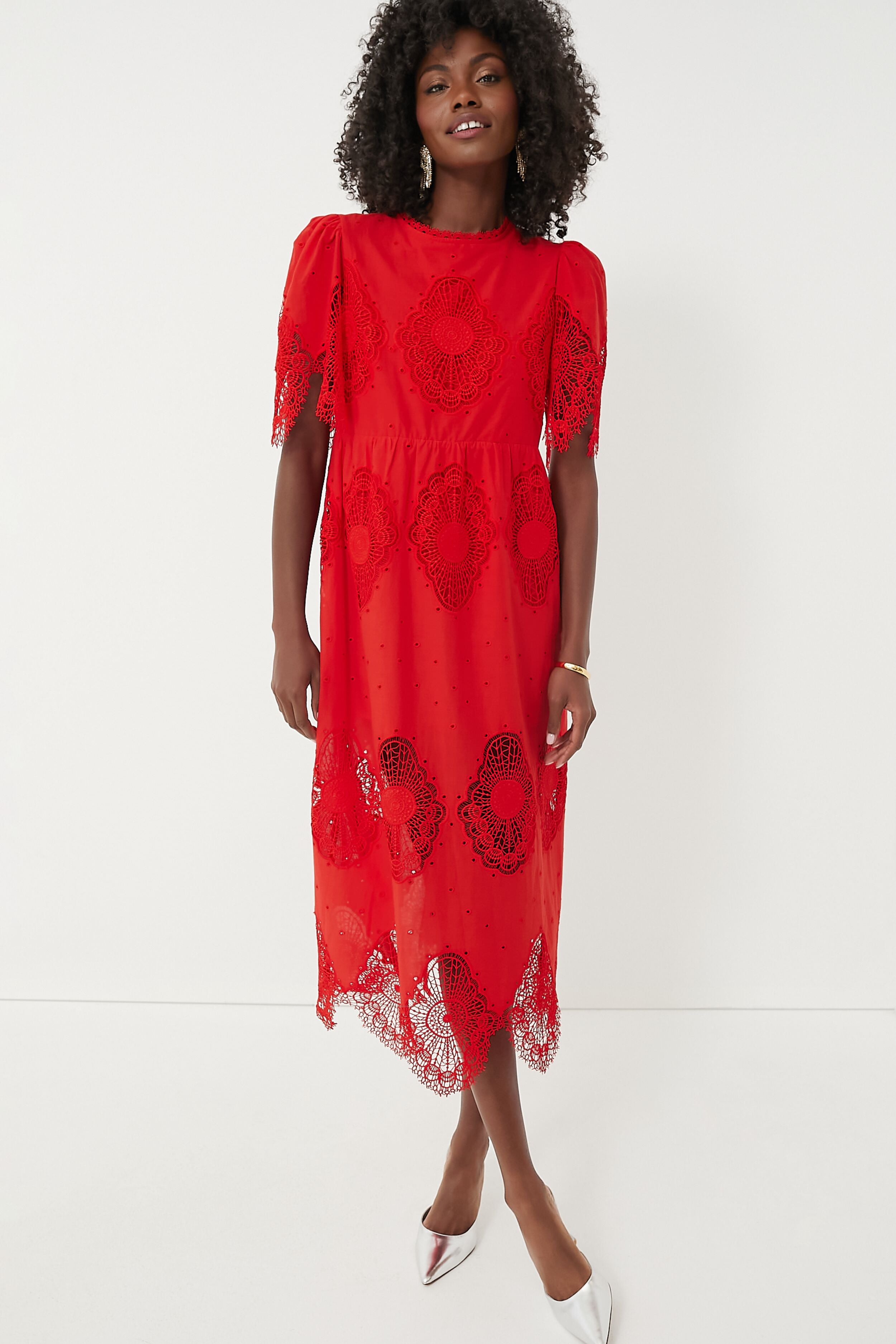 Bold femininity is achieved in the striking and flirty midi moment that is the Catalina Dress. Delicate lace cutouts adorn the bodice and hemline in oversized shapes to bring a touch of abstract and authenticity to this classic concept dress. Finished off in a bright red hue that we love for party-ready dressing year-round. this relaxed yet romantic silhouette packs a punch while keeping it polished and pretty. Just add metallic heels and a clutch for a look that is sure to earn you some compliments!