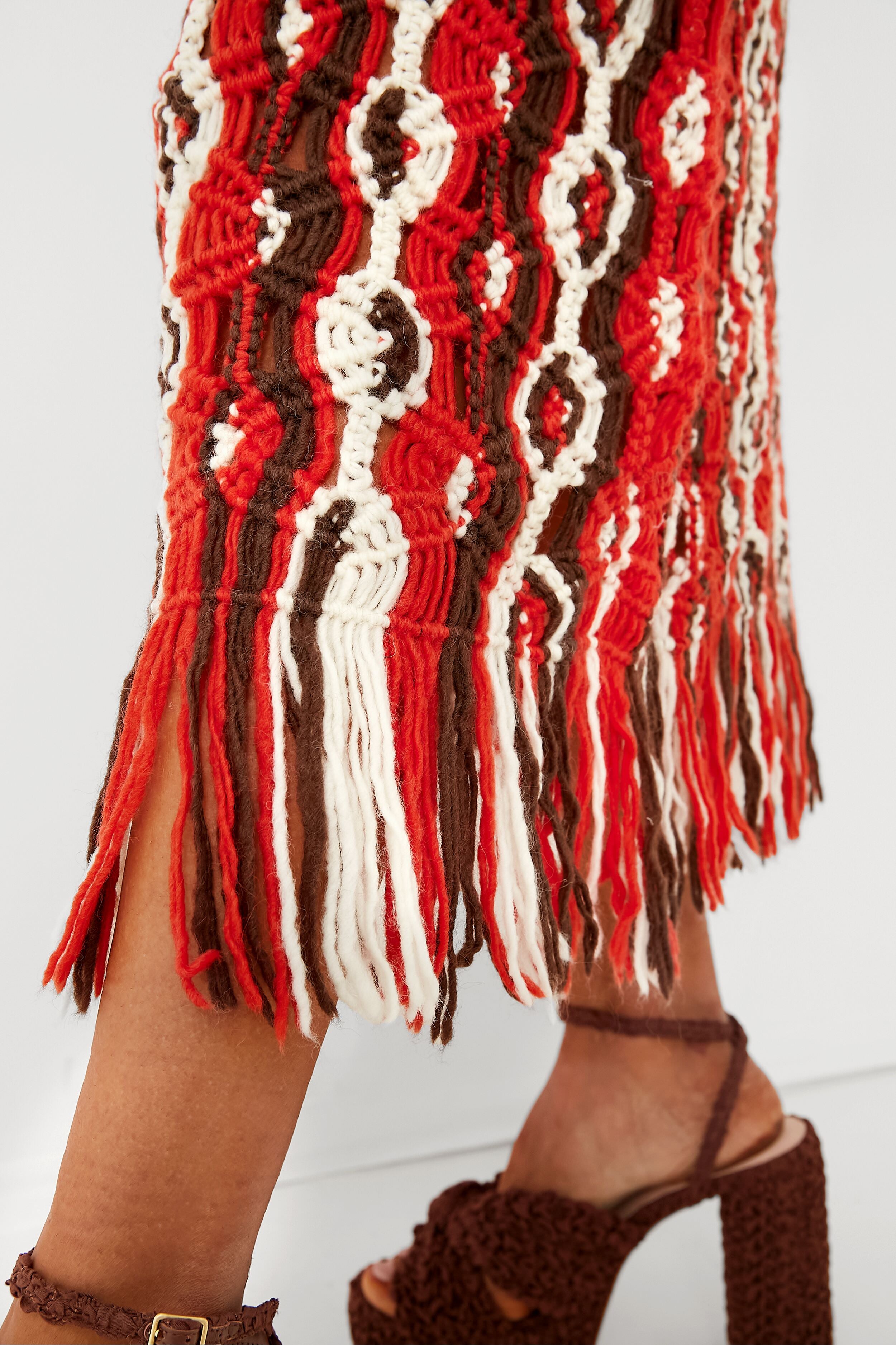 The spirited Drew Skirt is a crowd pleaser and it's all in the details! Made with hand crochet macrame and a fiery red hue. this multi colored knit skirt is the ultimate addition to your wardrobe. Spice up any outfit with this midi by styling with a cropped white tee and strappy sandals for on-the-go or pair with the matching top for an iconic set moment.