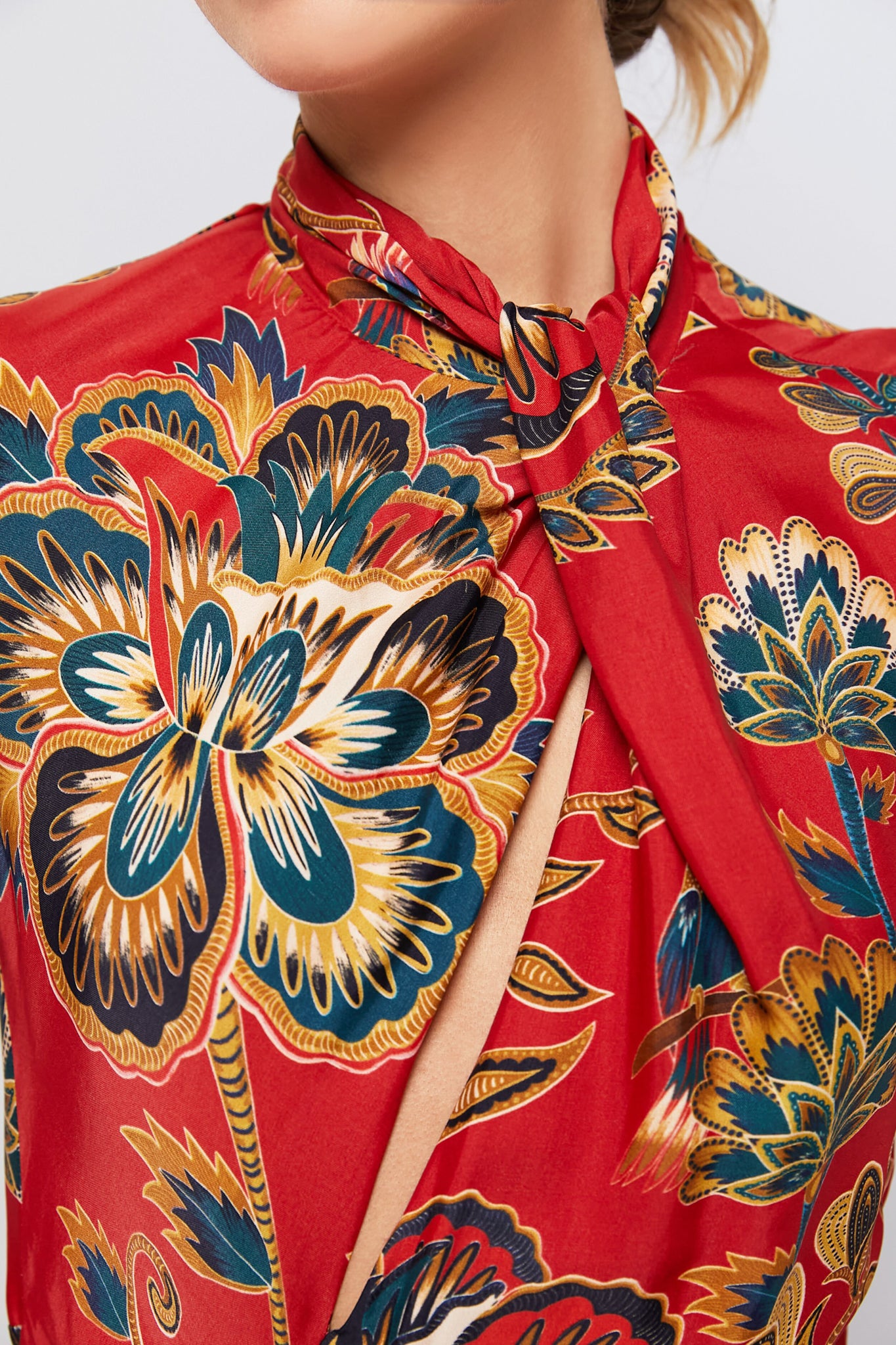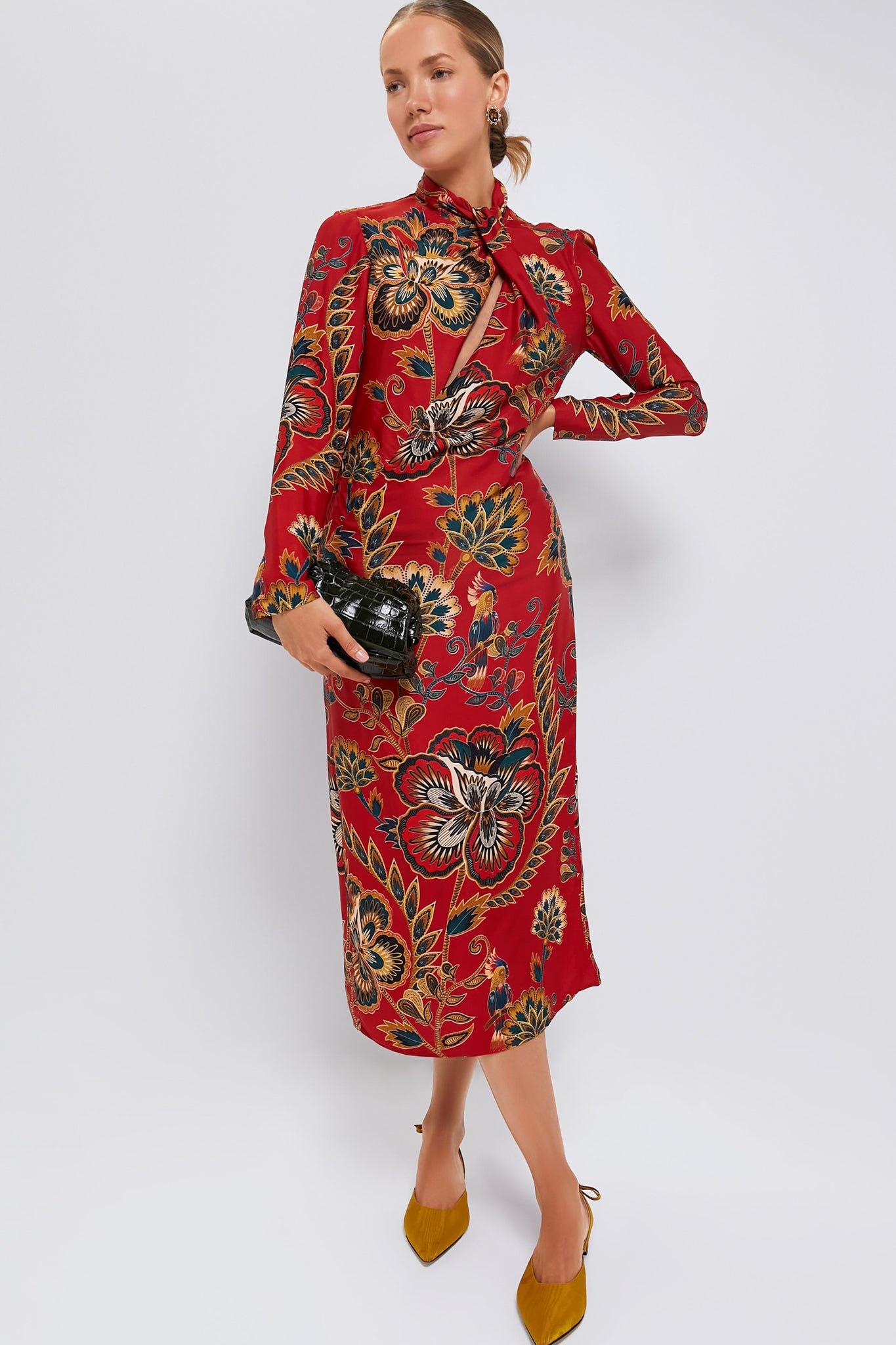 Discover the enchanting allure of the Red Floral Cutout Long Sleeve Midi Dress. The high neckline gracefully flatters. while an unexpected back cutout infuses a graceful touch. The lush. botanical print is seasonless is design. making it a perfect year-round event dress with heels and a gold clutch!