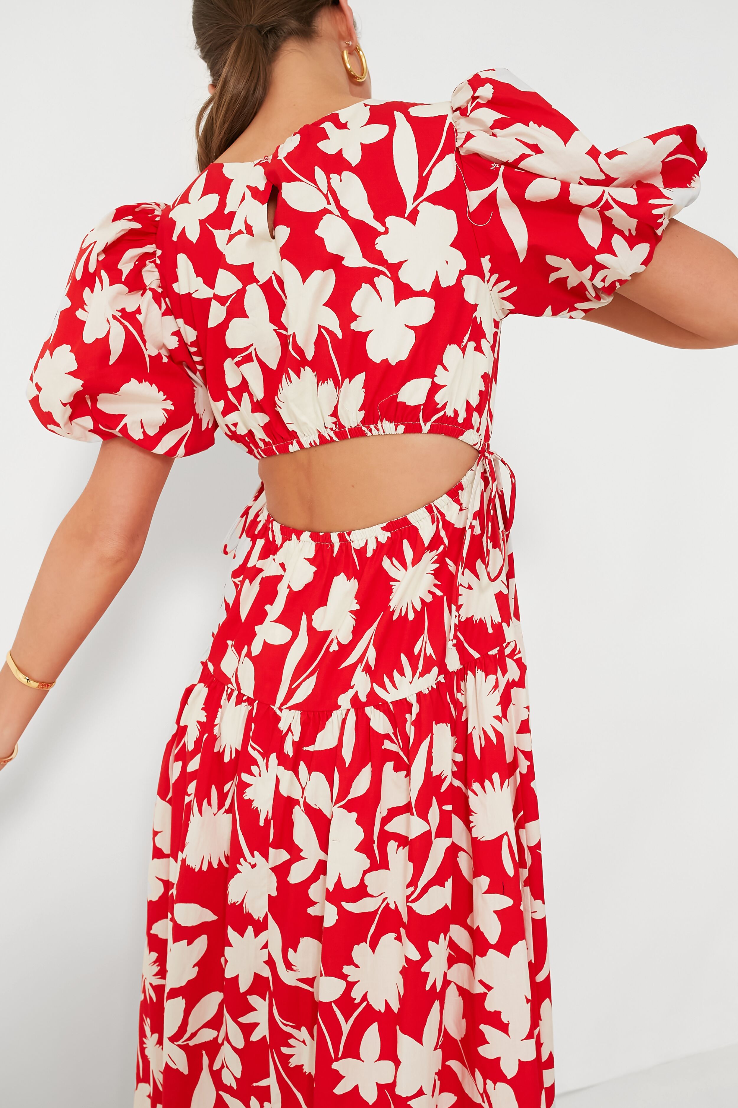 Spicy and chic. the Red Floral Maxi Dress is perfect for every occasion on your calendar this summer. This maxi is constructed with short puff sleeves. ties at the waist. and an always on trend back cutout that lends itself to a flirty feel. From weddings to winery visits. this vibrant number is sure to turn heads.