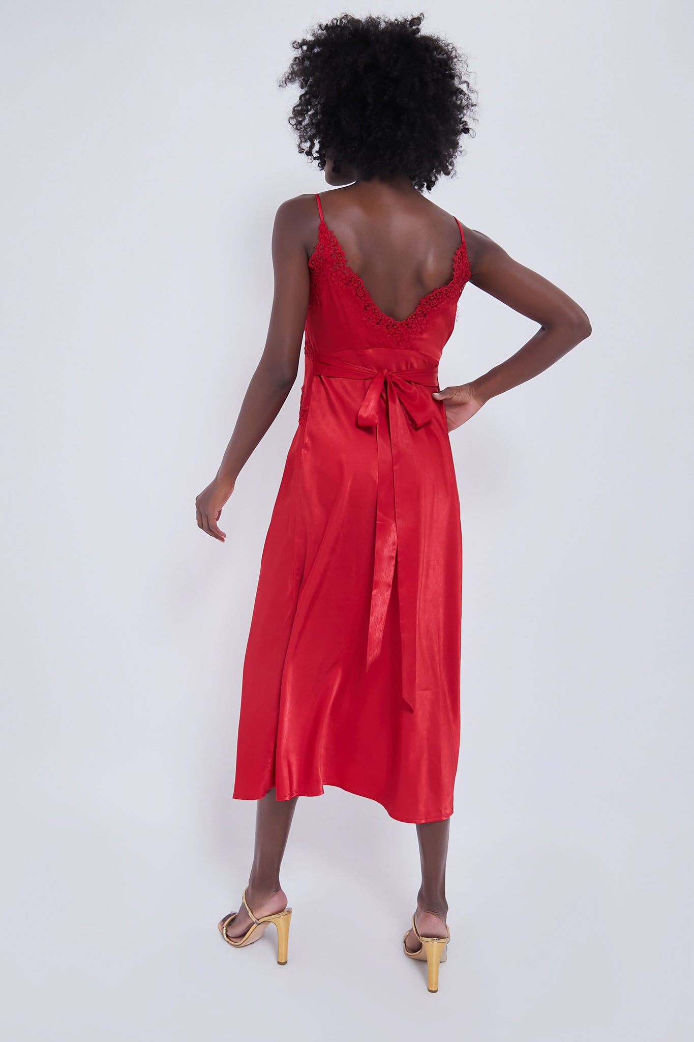 The Frankie Dress is a flirty satin slip with lace detailing and a back self-tie bow. Perfect for cocktail parties and special occasions. we are wearing it with boots and a chunky sweater for a pop of color or with strappy heels and a clutch for a romantic dinner.
