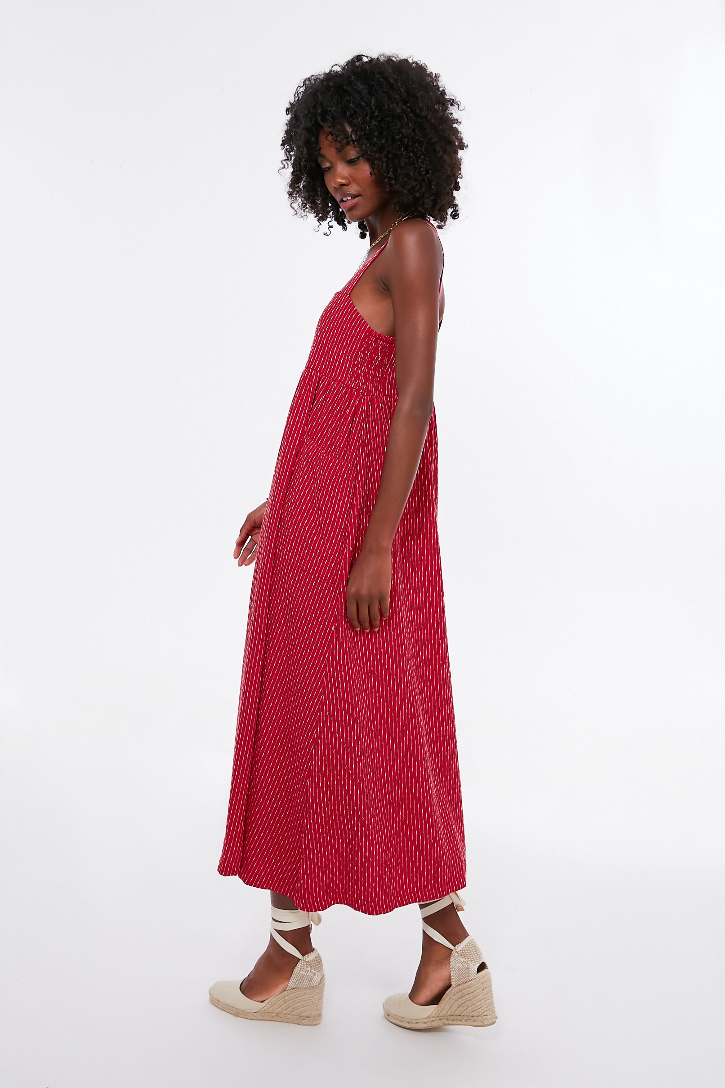 Dreaming of your next getaway? From vacation days spent exploring neighboring towns to lunch poolside to beach bars to romantic dinners under the stars. the Red Geneva Dress is working overtime. Featuring a square neckline. flattering empire waist. and patch pockets for your room card and phone. this maxi is the key to effortless feminine feels. Opt for espadrilles and raffia accessories for a chic and easy resort look for some fun under the sun.