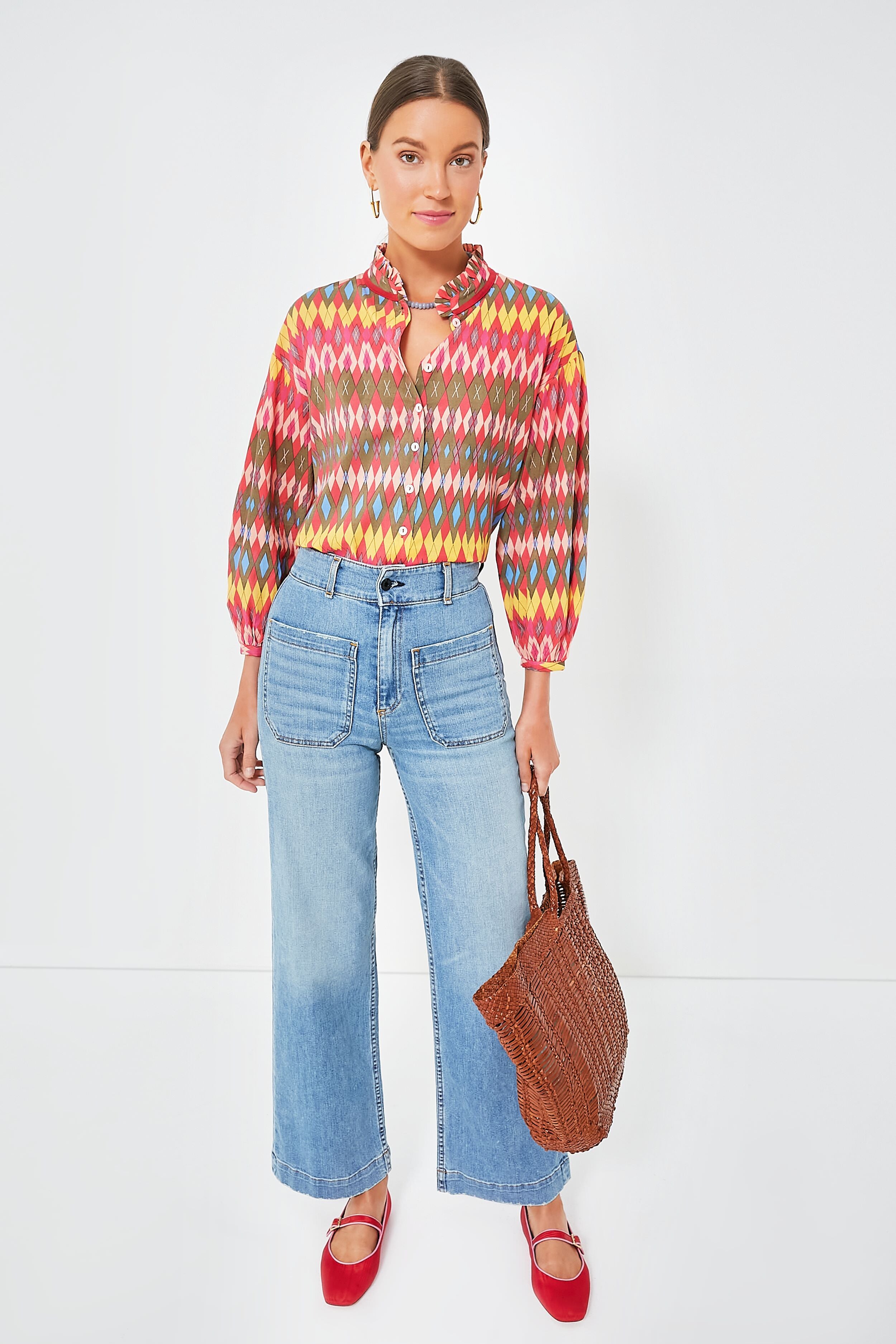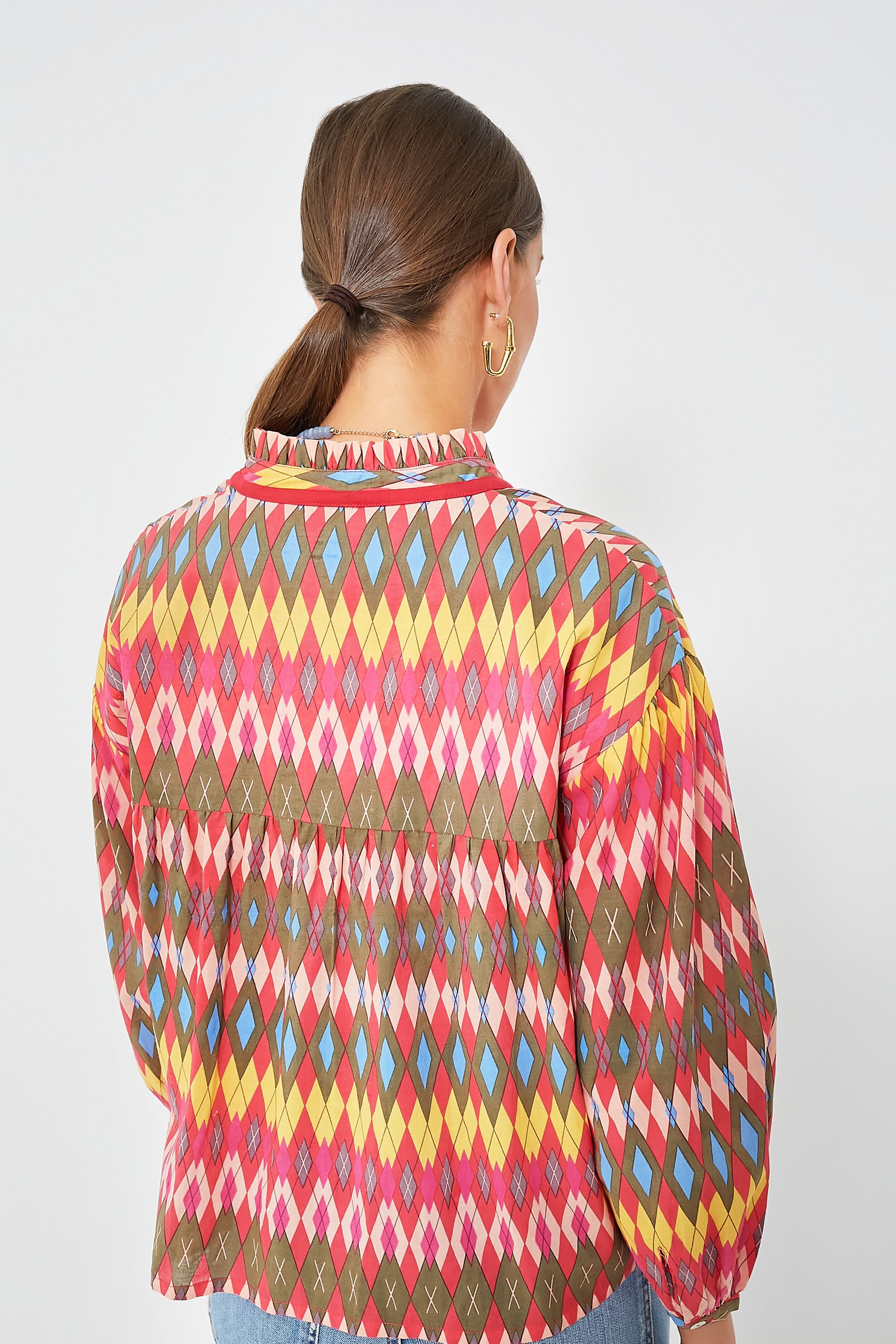 In a magnificent. multicolor argyle print that is sure to turn some heads. the Red Geraldine Jeremy Shirt is one of a kind. Featuring both feminine and flattering details like a ruffled stand collar. bracelet length blouson sleeves. and a button down front placket. this fantastic top is going to have you looking and feeling extra-special. Style with denim and flats for an elevated day look. or add heels and statement earrings for al fresco dining.