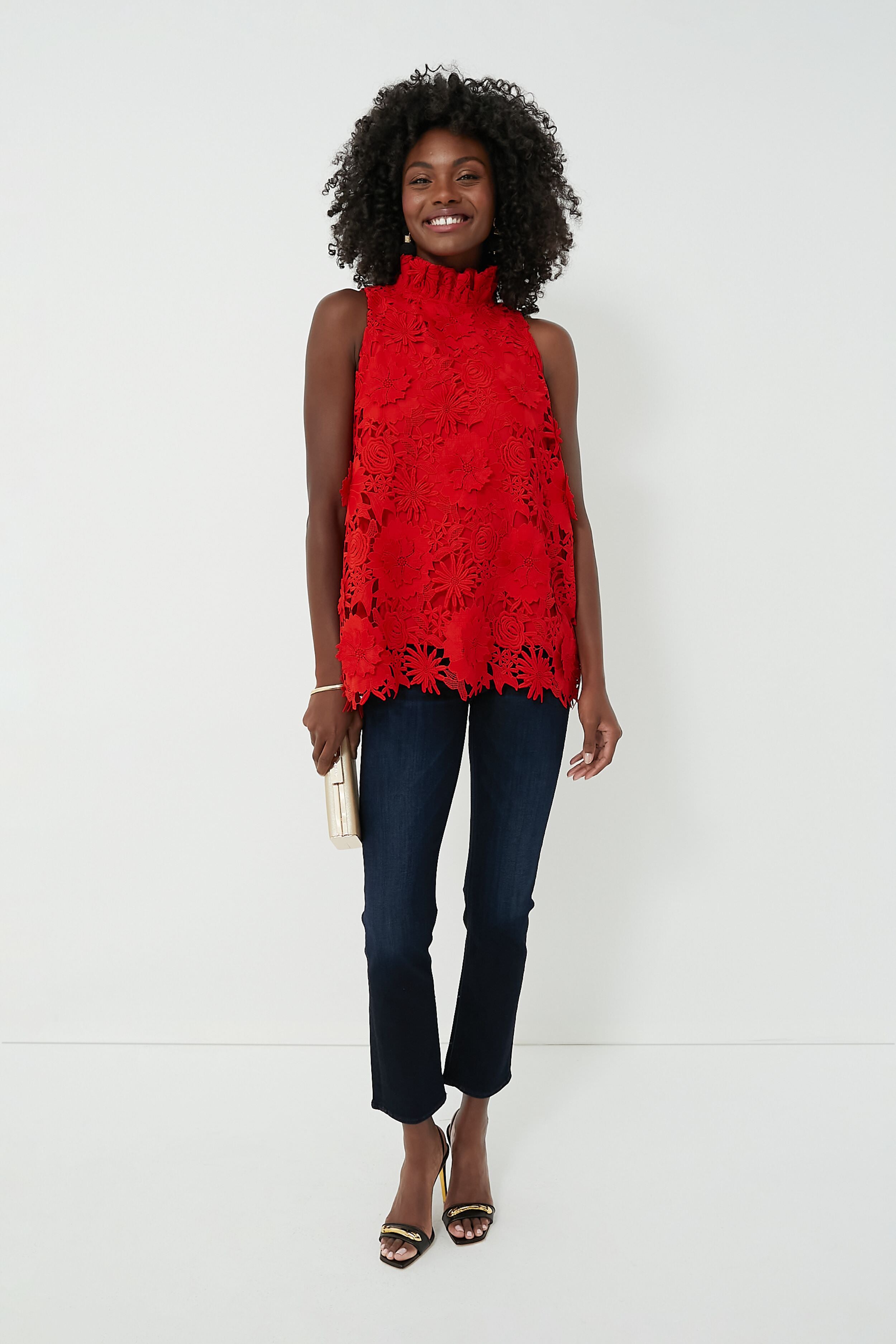 A Morningim style staple. the Mason is back and better than ever. Our design team spent months perfecting and testing our signature stand collar to get it just right. As Marvin Gaye once said: "Ain't no collar high enough." so bring on the ruffles and drama! Updated in a beautiful. fiery red. three dimensional lace fabric. this swing shape blouse reminds us of our favorite mod silhouettes from the 60s and 70s. Ready for al fresco dinners with family. cocktail parties with friends. and every social event on your calendar. the occasions are endless for this bow tie-back top!