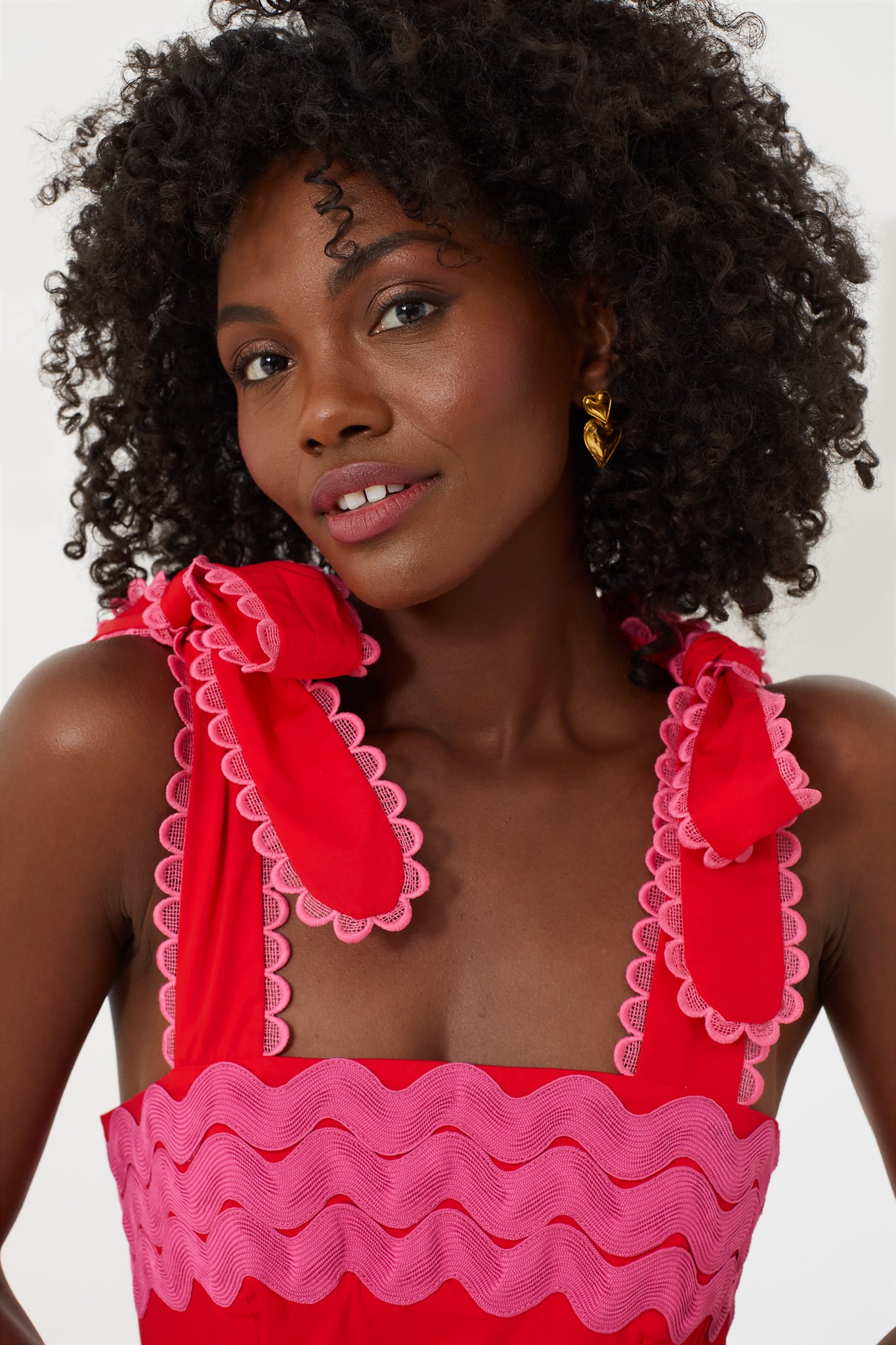 The Red Jade Dress is a vibrant statement piece unlike any other. With self-tie straps. embroidery detailing throughout. and a romantic A-line skirt. this elevated midi plays on texture. shape. and color to create a dreamy look. Pair with heels and statement jewelry for a dinner party. or with sandals for a playful daytime look.