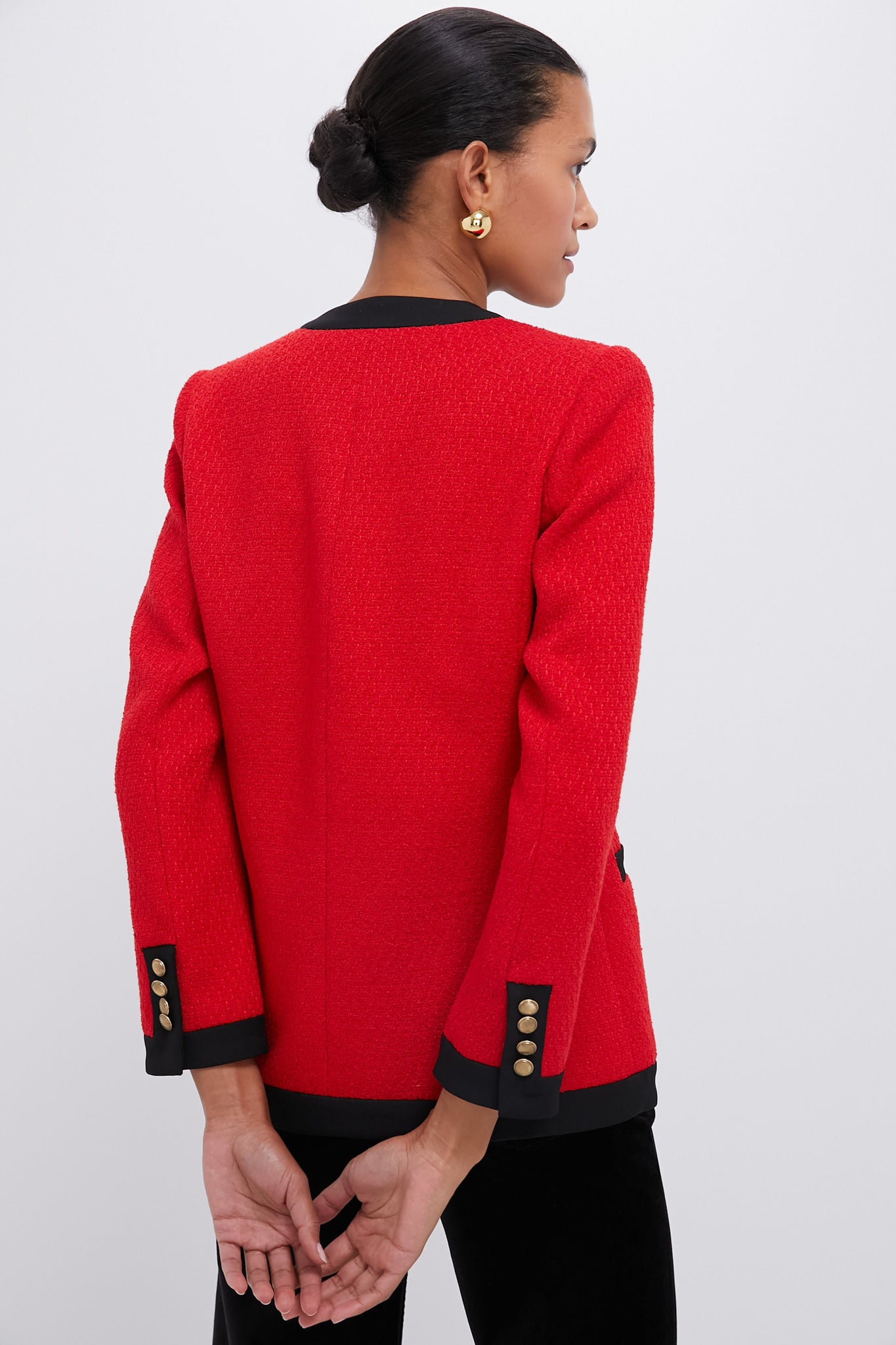 The bold and timeless Red Lenore Jacket is a statement piece. Boasting elegant details like contrasting hem and gold buttons. it is ideal for holiday soirées. office parties. or upscale dinners. Style it with velvet pants. tailored trousers. or a sleek pencil skirt for an effortlessly polished look.