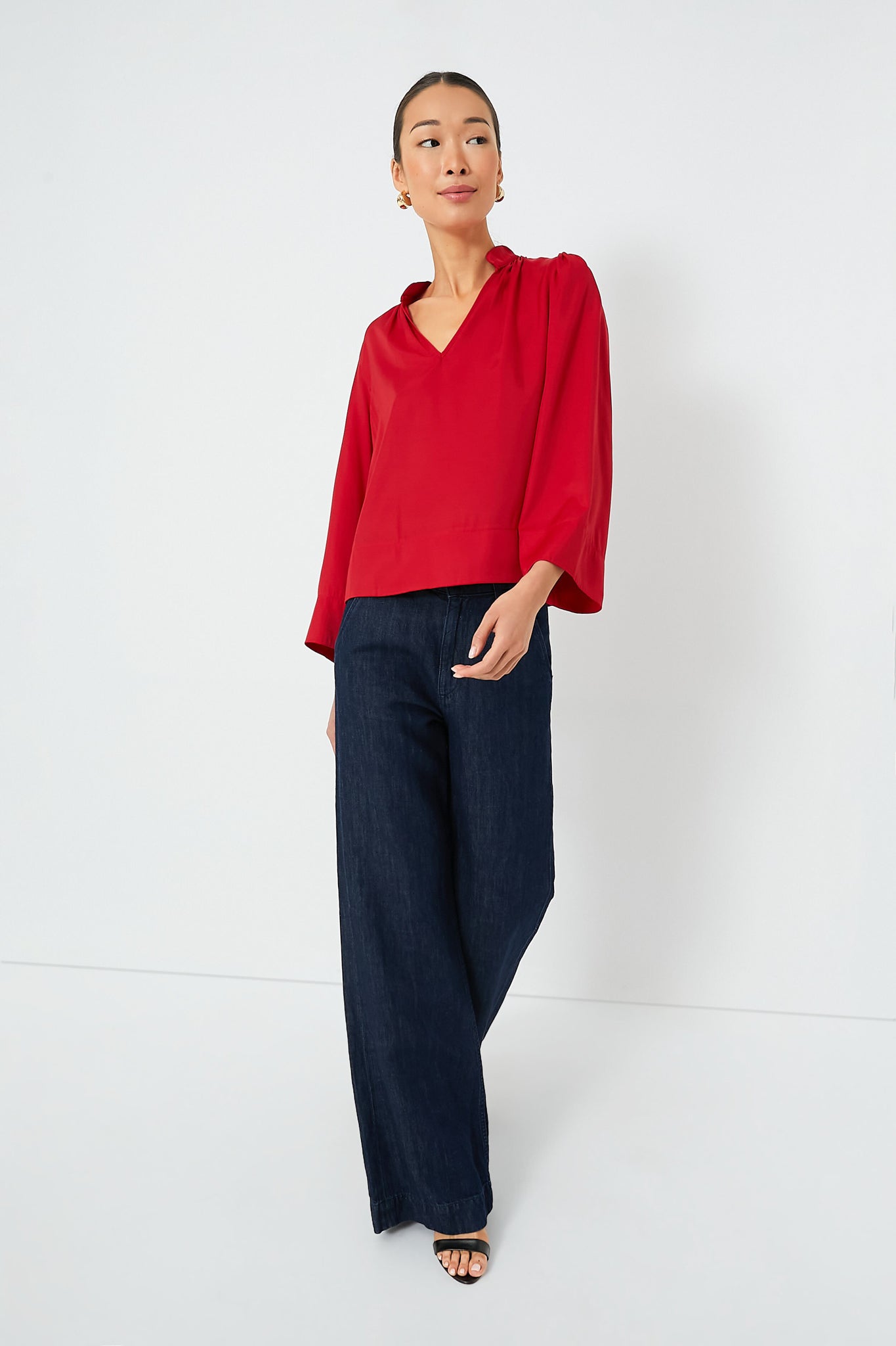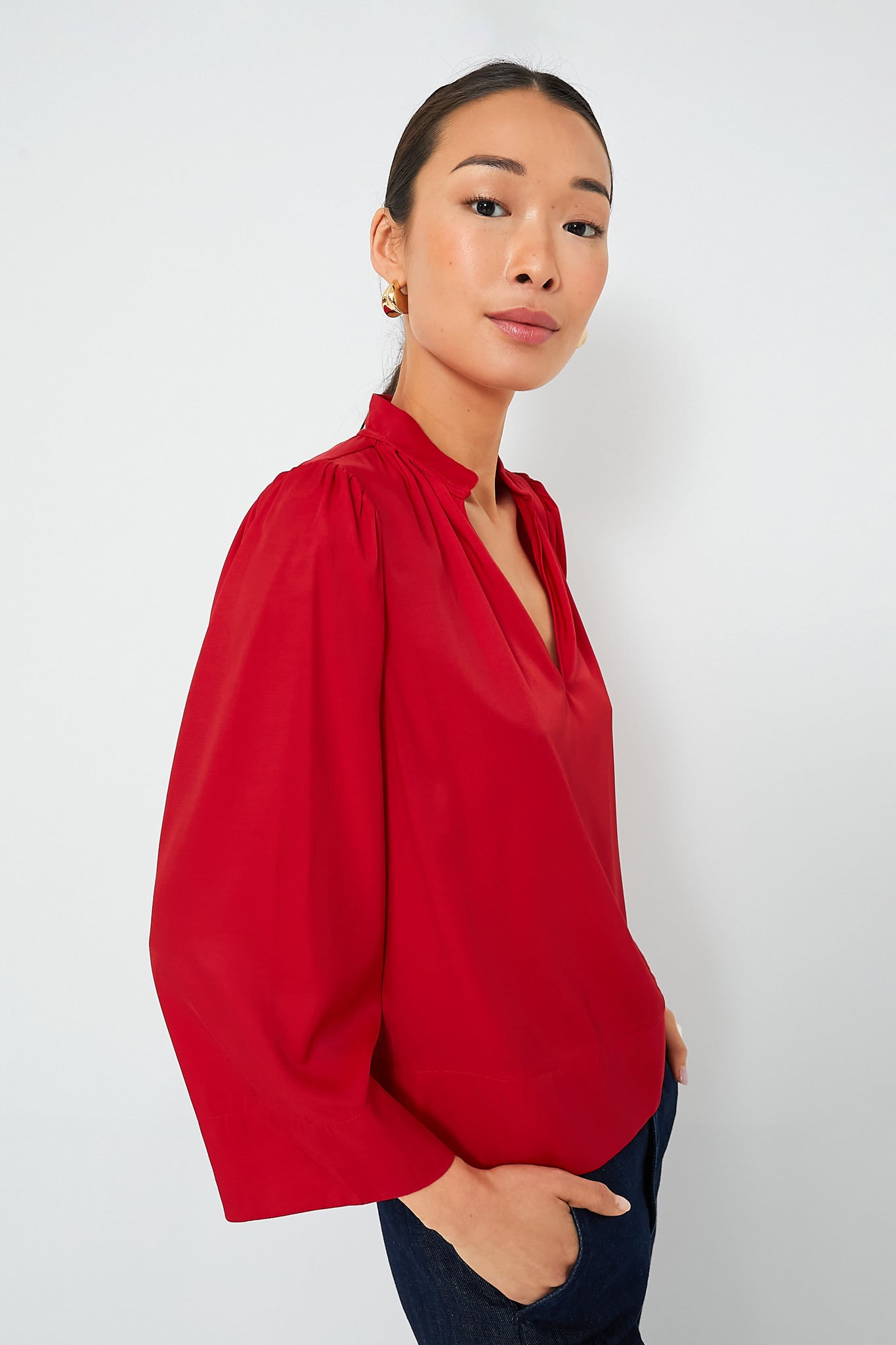 Effortlessly elevated. the Red Phillipa Blouse is a feminine silhouette that can be styled for countless occasions. This top drapes off the body in the most flattering way and features a stand collar with a gathered neckline. bracelet length sleeves. and a lightweight fabric that feels soft to the touch. Opt for dark wash denim and heels for date night and swap for trousers and flats for a day in the office.