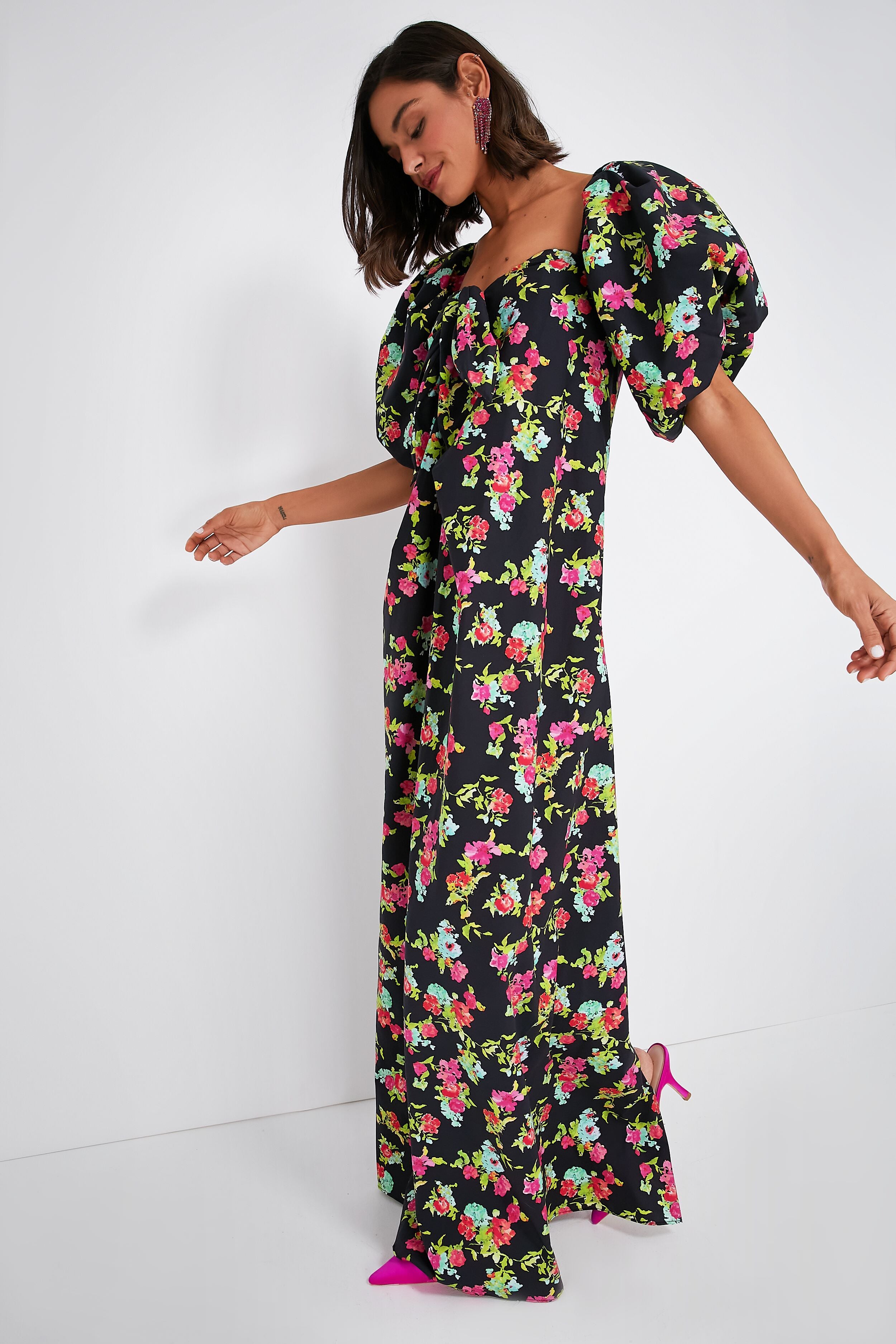 The Red Pink Noir Floral Reyna Dress is a floor length gown that'll turn heads on your next vacation getaway. Thanks to its eye-catching off-the-shoulder sleeves with a subtle puff. and an elegant column silhouette that's meant to loosely graze your figure. you're sure to be the best dressed. With a flirty tie at the top that adds a lovely draping detail to the bodice. we are wearing this cotton poplin number with chunky earrings and gold heels to let the maxi shine.