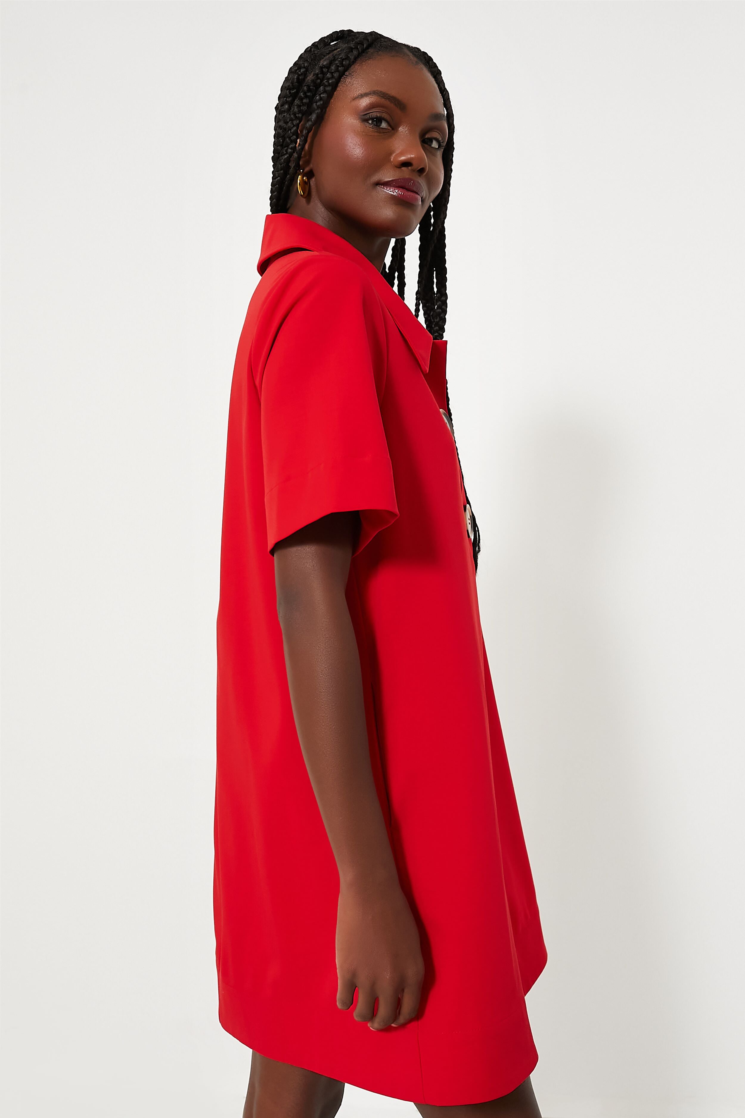 We love nothing more than an easy silhouette with bold detailing. The Red Scout Dress is chic and versatile. perfect to wear three seasons a year. This classic-with-a-twist number features an A-line silhouette with an oversized collar and statement button embellishments you're sure to love. Versatile enough. this sweet style can be dressed up or down. paired with heels or sandals. creating endless possibilities for this playful mini.
