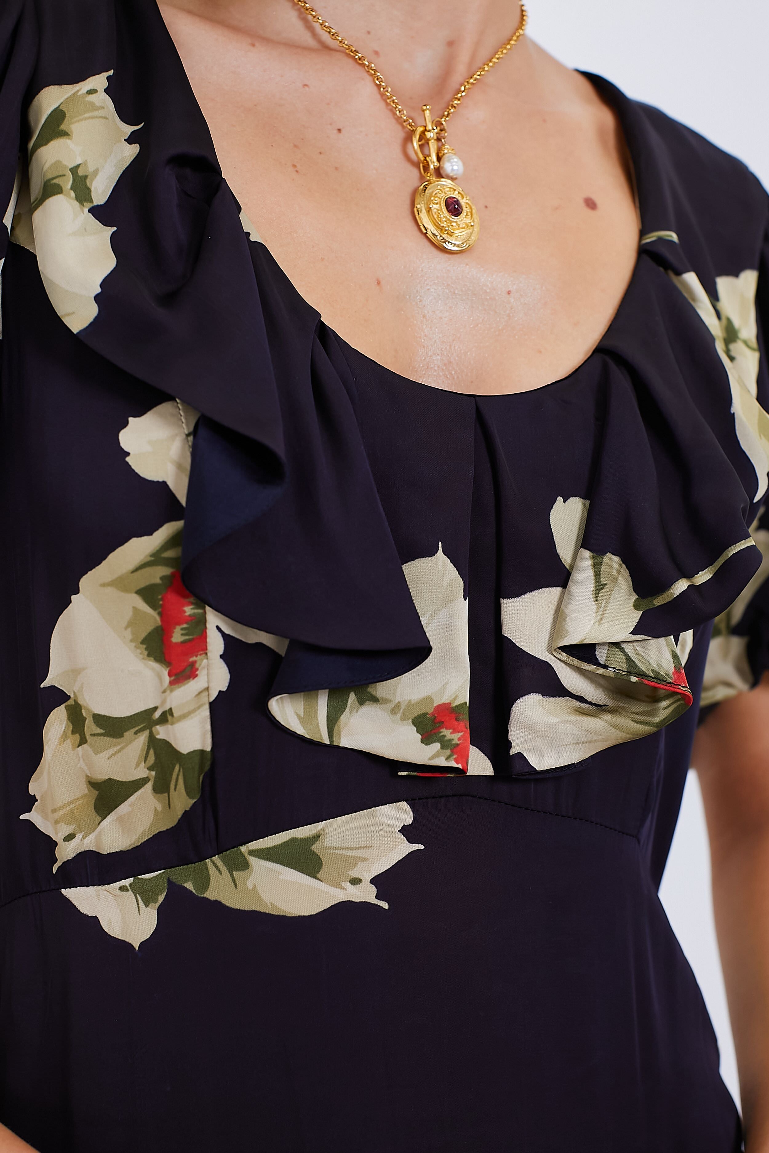 Featuring short puff sleeves with shirring. a low scoop neckline. and a slimming fit. this drapey viscose style is made in an elegant floral print. Its circle-cut skirt. finished with flouncy godets. adds movement with every step. Pair with suede boots and a belt for a winery visit. or with a chunky sweater and ballet flats for brunch.