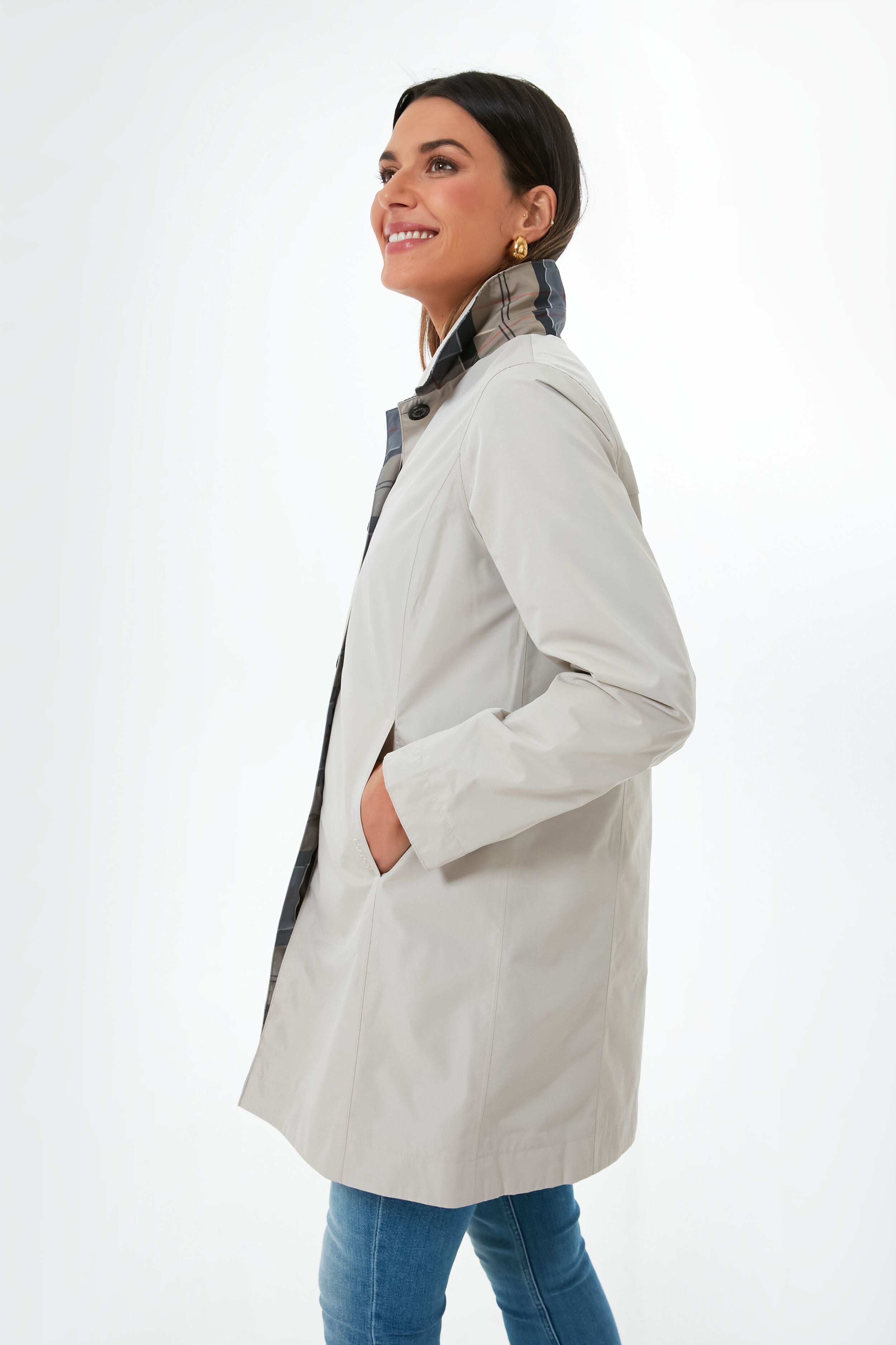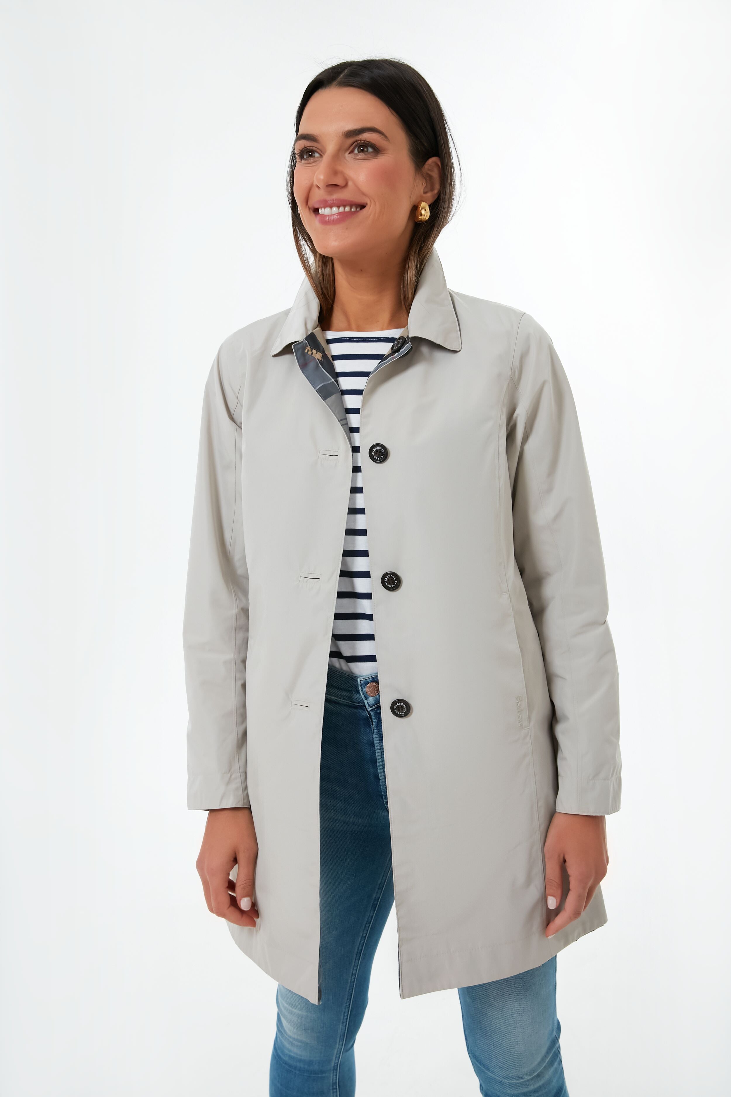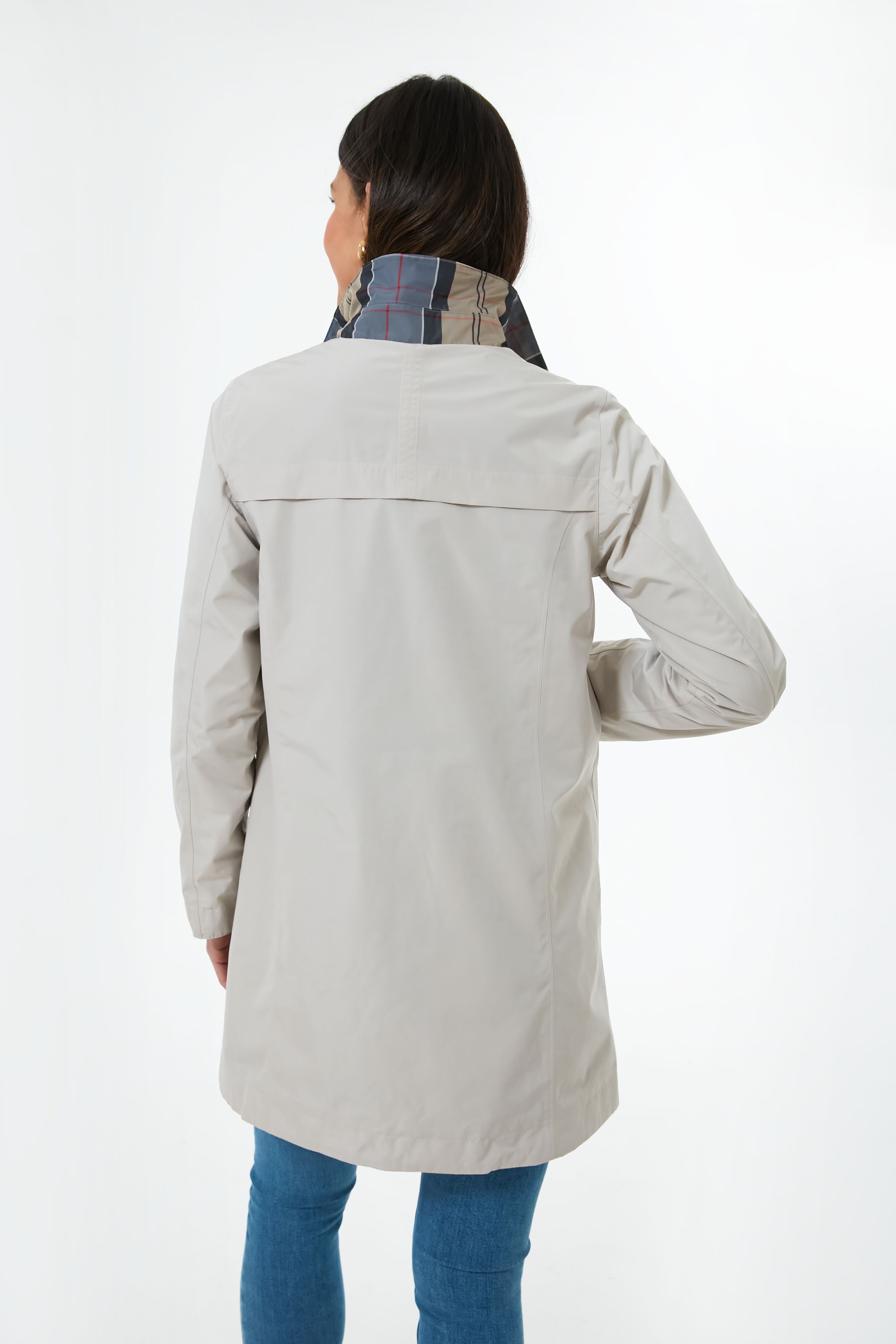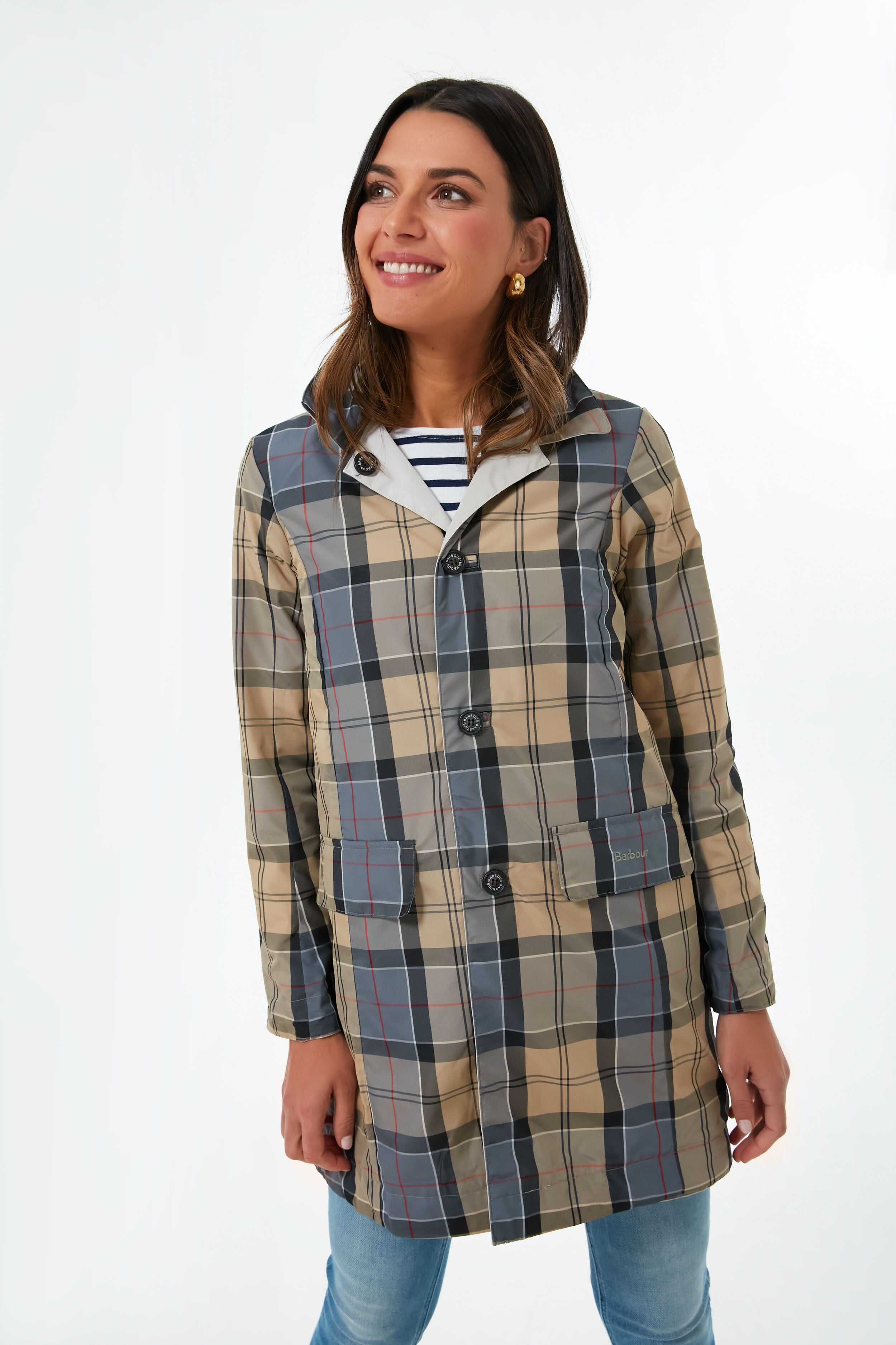 No stylish lady's wardrobe is complete without a chic raincoat. We are loving the Mist Babbity Jacket for this reason. as it is both practical and on-trend while giving you double the styling options. Reversible with a solid dove grey side. and a tartan plaid on the other. this style's point collar. large pockets. and button front make this piece of outerwear a real go-to that you will love for years to come. Pair with denim. oversized sunglasses. and a scarf for a showstoppingly elegant look that is unfazed by stormy skies.