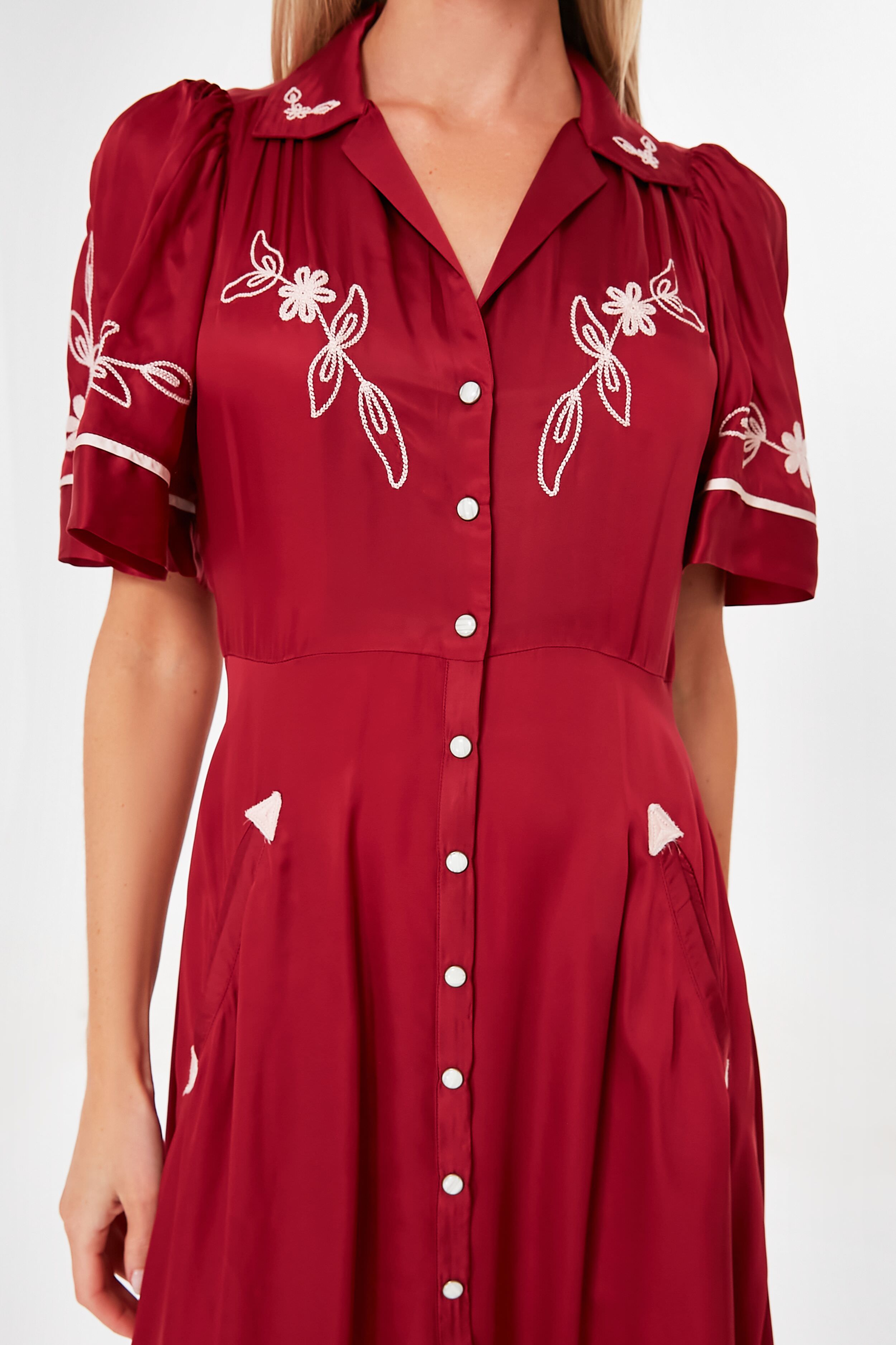 Inspired by 1940s western wear. the Rhubarb Bridge Dress is cut from a silky smooth viscose material and adorned with charming piping and embroidery. This thoughtfully designed midi has a notched spread collar. fluttery short sleeves. and pearl snaps that run down the length of the front. adding a feminine detail to this lovely silhouette with vintage vibes. We love this style dressed up or down with cowboy boots to lean into the look. or with subtle heels to bring a fresh new outlook.