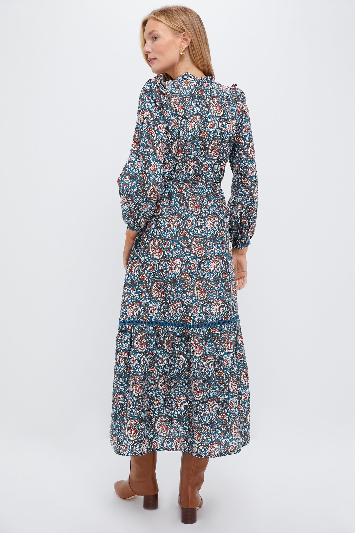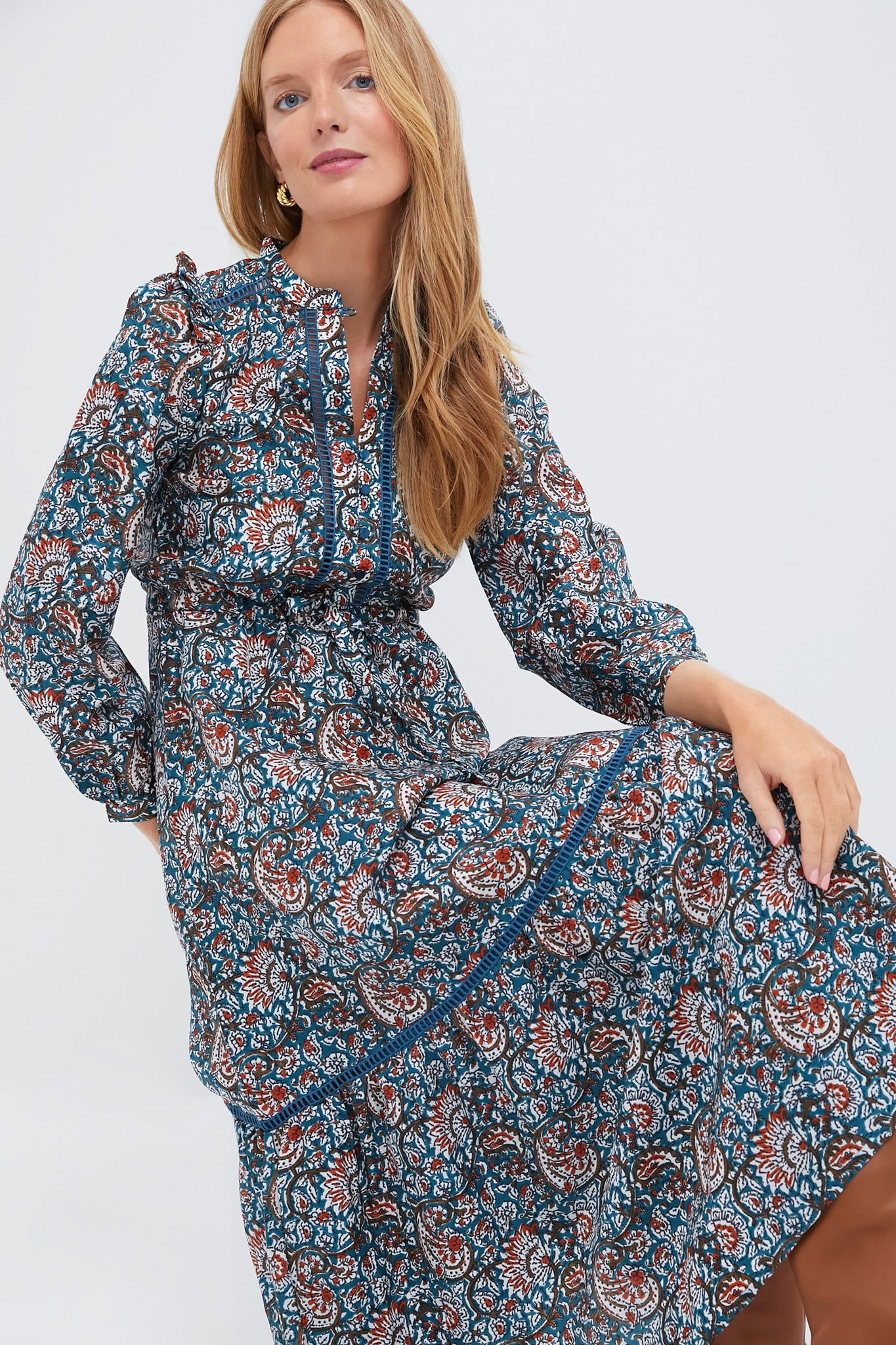 The Roma Silk Frances 4 Dress is an elegant maxi with feminine details such as ruffle trim. a drawstring waist. and a tiered hem. We are styling it with boots and a belt or with chunky heels for year-round occasions!
