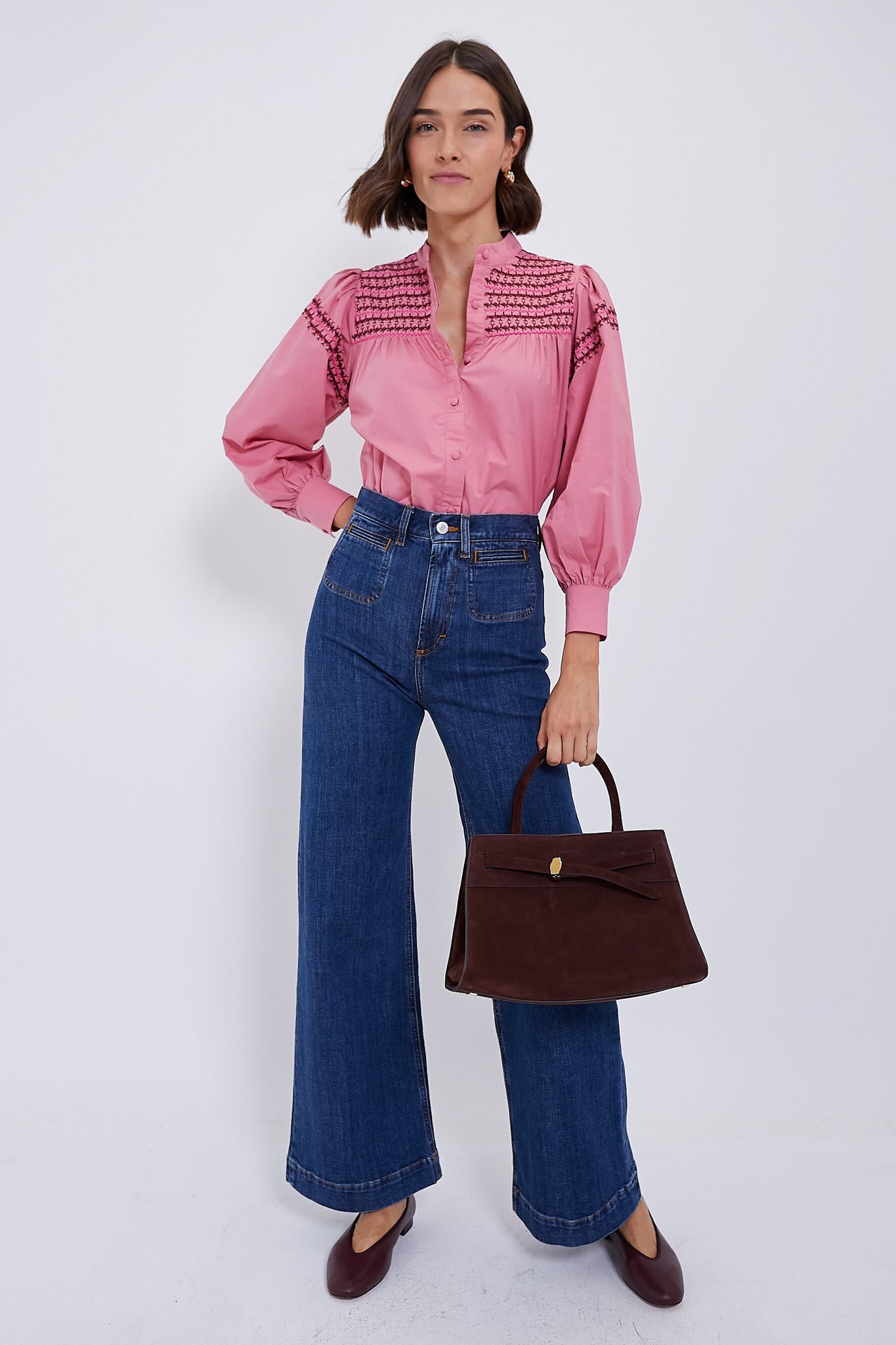 The Rose Saylor Shirt in a feminine pink color will soon be your favorite top. Perfect for everyday wear. pair with high waisted denim and a mary-jane ballet flat for a polished. put together look.