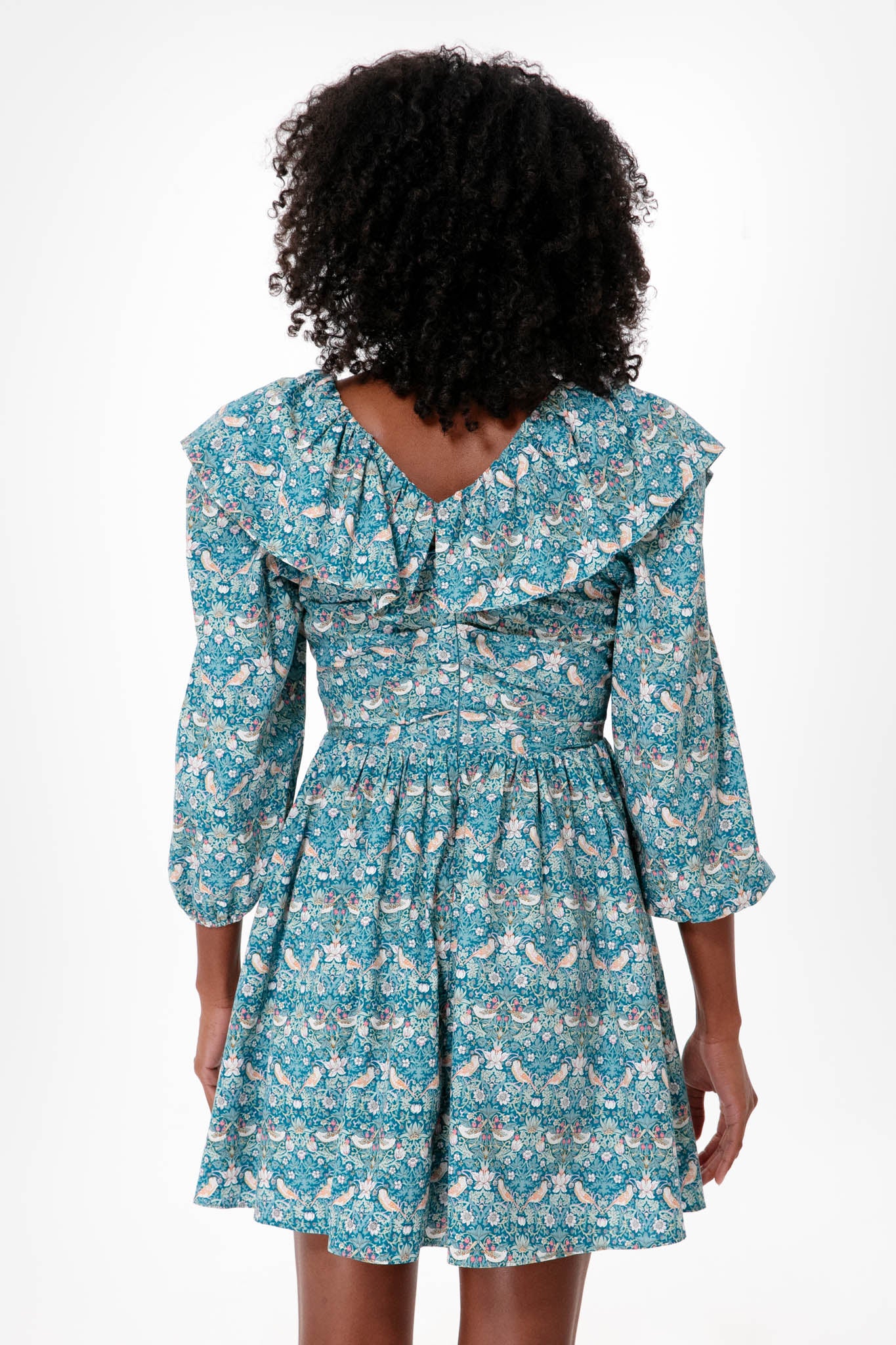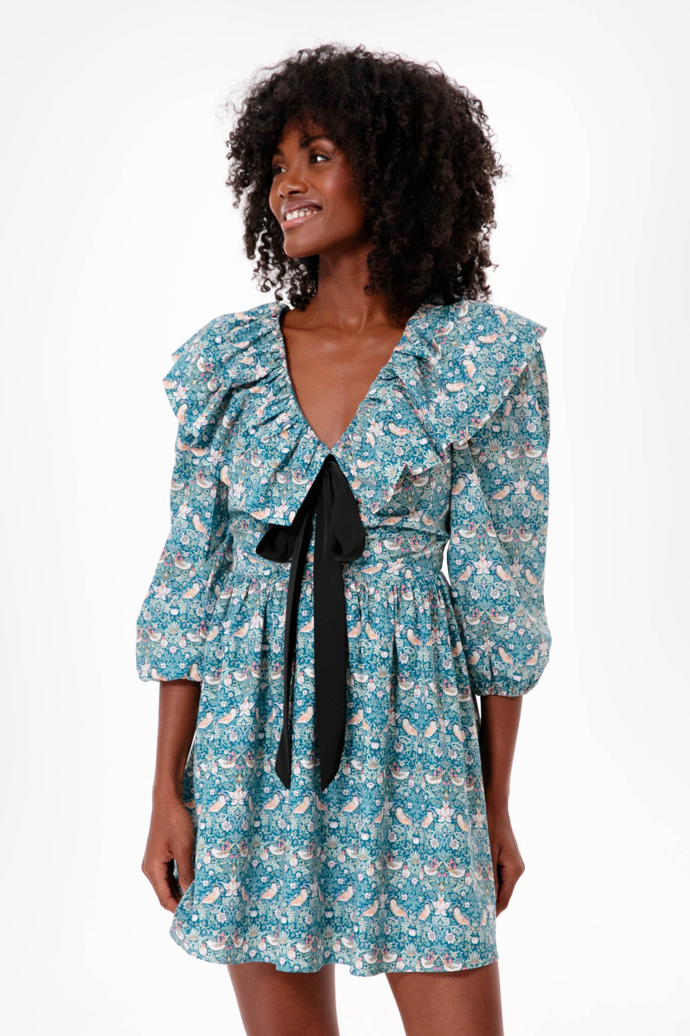 It's hard to pick our favorite detail of the Birdsong Mini Dress! Featuring an oversized ruffle collar. subtle but playful print. and black grosgrain bow. this mini is sure to be on repeat this season. Versatile as it is chic. we're pairing with platforms and a party clutch for your next soiree. or play it casual with espadrilles and a raffia bag for brunch with the girls!