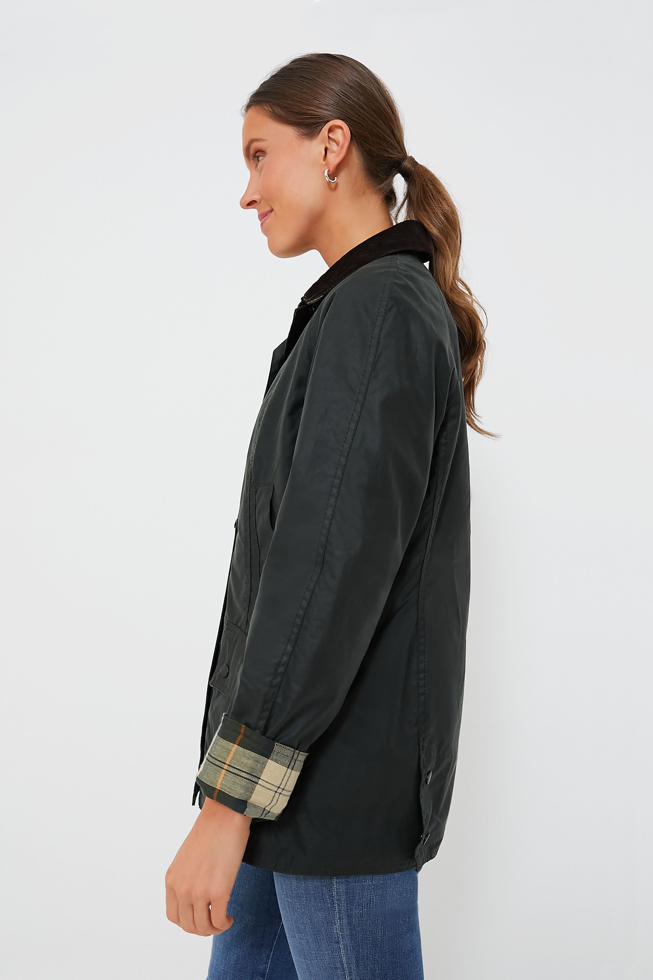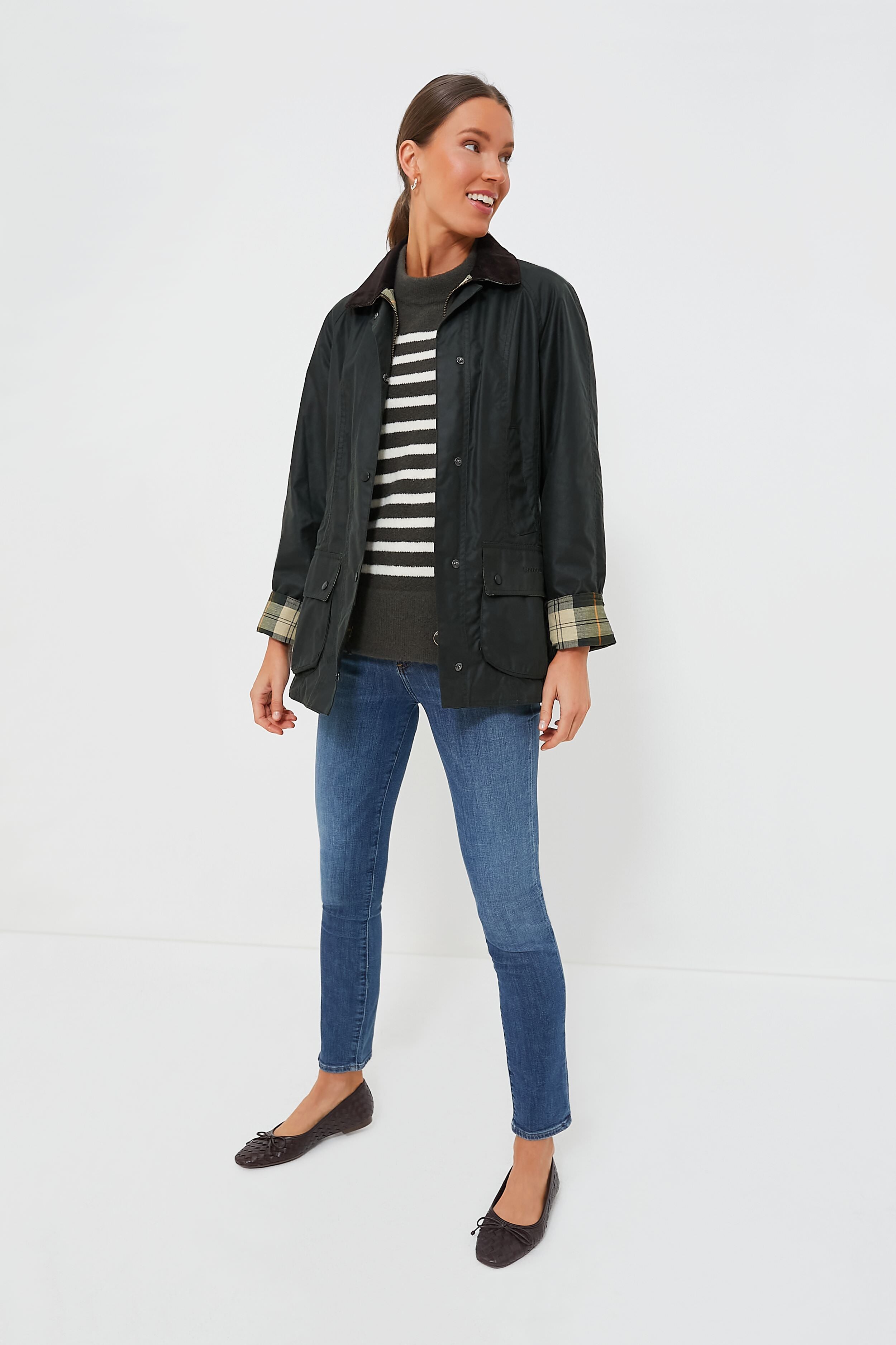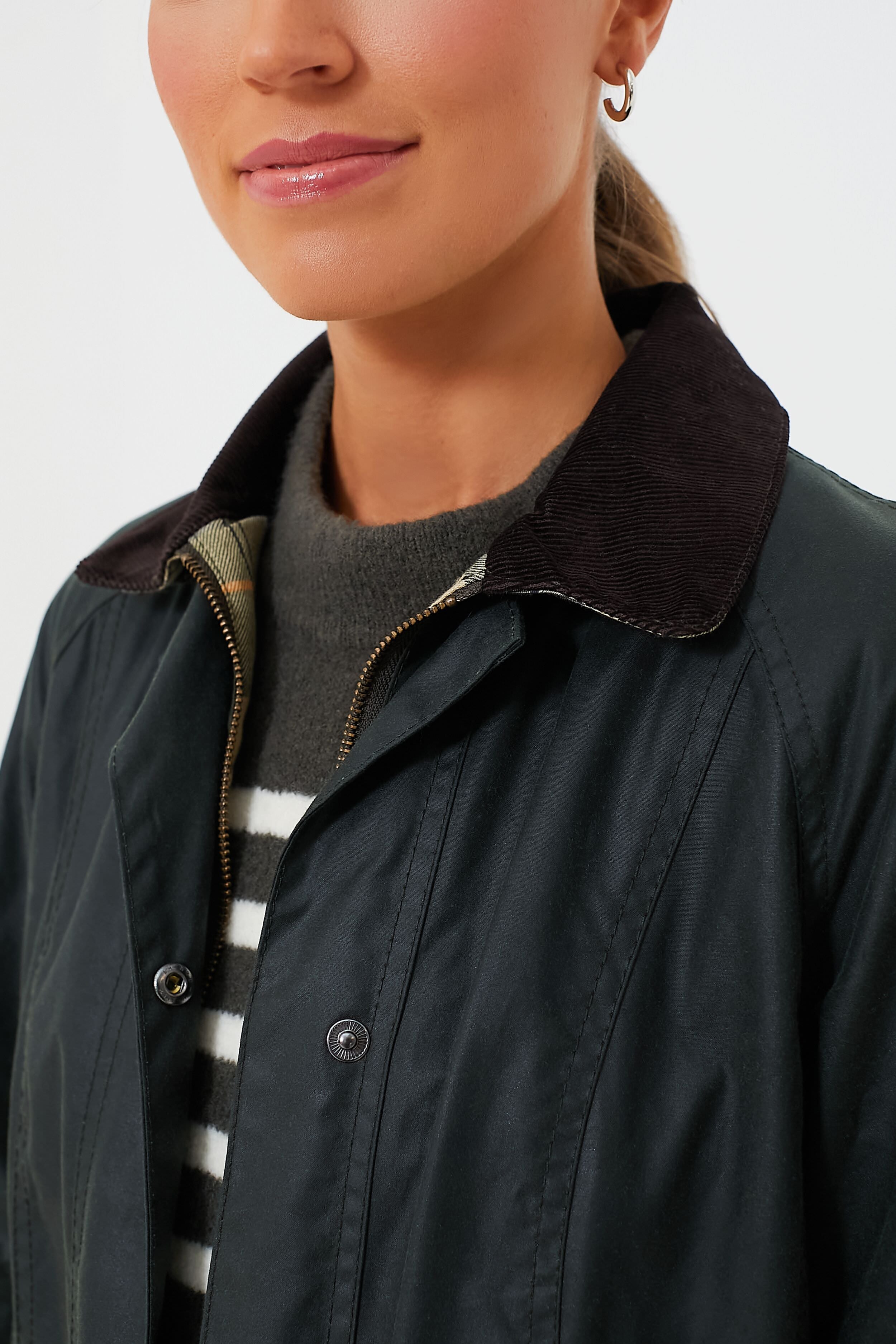 The Classic Beadnell is a year-round jacket lined with signature Barbour tartan. This style features a traditional corduroy collar. storm-fly front with rugged zipper and snaps. moleskin-lined hand-warming pockets. and snap-shut bellows pockets. Slimmer than the relaxed Bedale. the Beadnell has a more feminine. tailored fit. This is the perfect. high-quality. durable outer layer for town or country. Add a zip-in Betty liner or hood (not included) to add extra warmth or element protection. or wear it on its own as a versatile. all-season jacket.