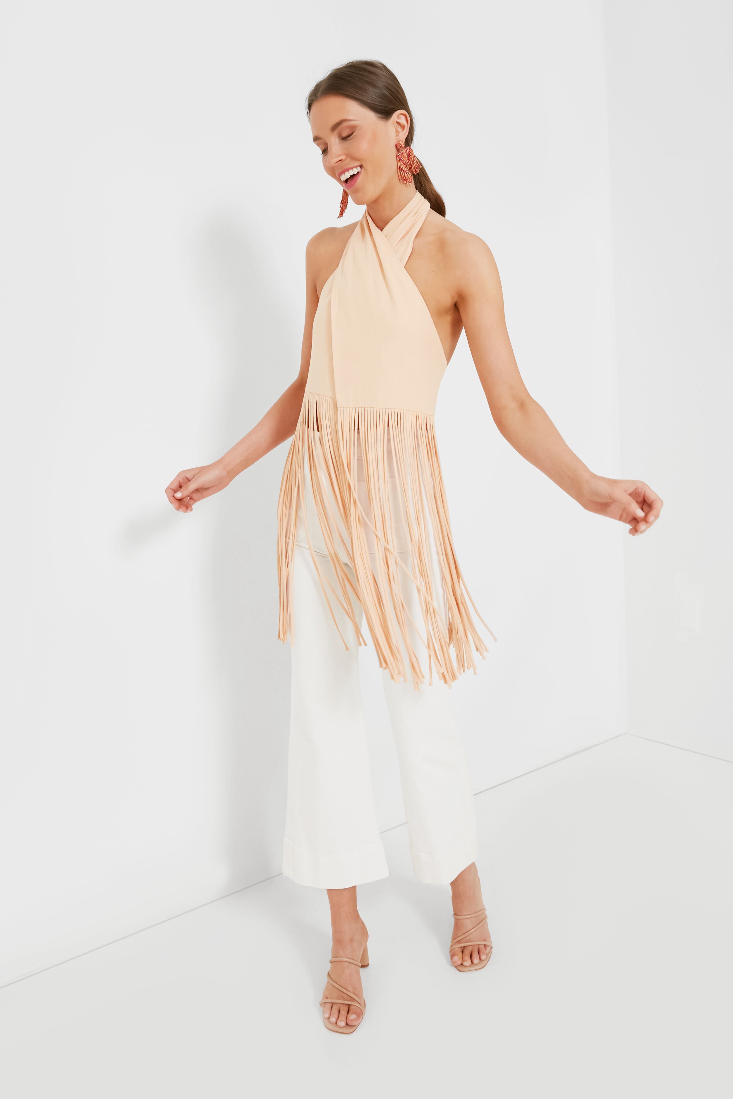 Be the life of the party in the Sand Cross Front Top. A neutral colorway balances out all of the fun and funky details of this silhouette. from its halter neckline to the open back to that incredible and dramatic fringed hem. Ultra eye-catching and full of whimsical movement. you'll be searching for any excuse to pull this fabulous style out of your closet — so pair with denim for a more casual styling perfect for dinner and drinks with your friends. or elevate it with a mini skirt and heels for special soirees.