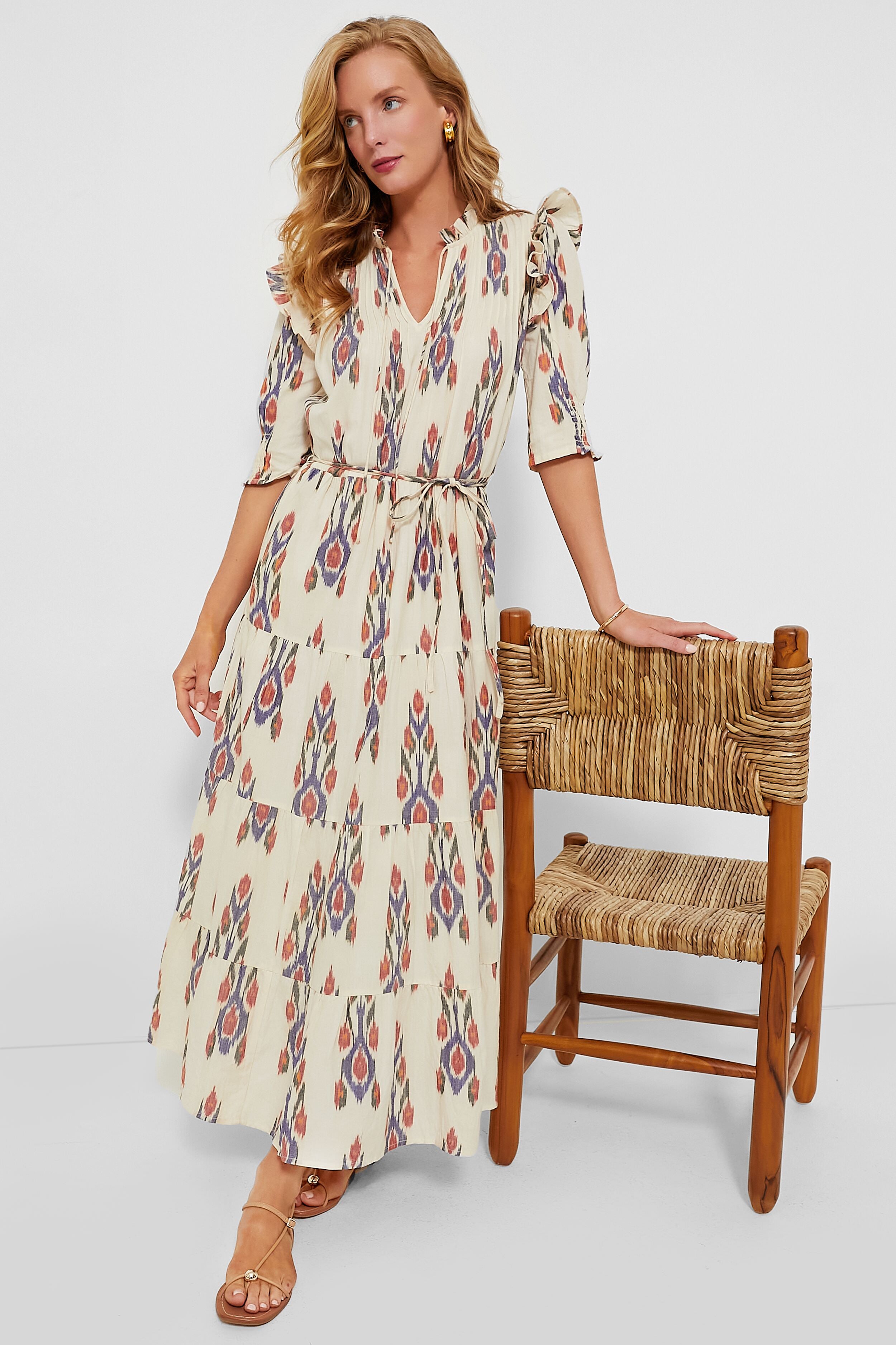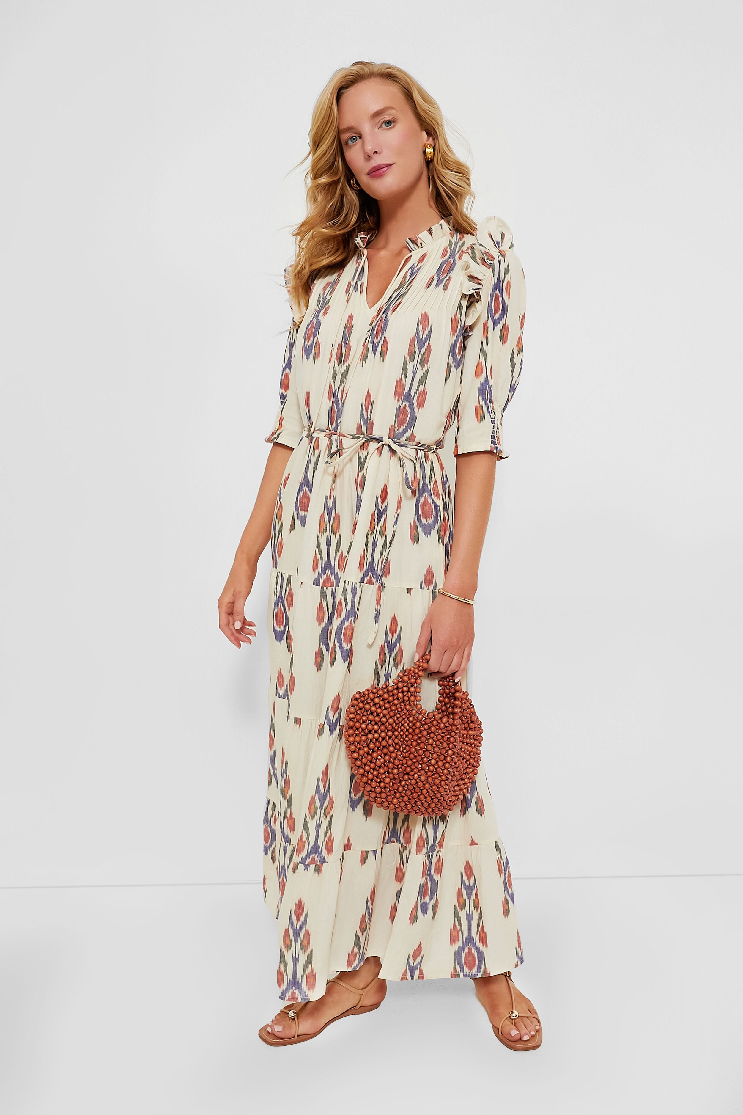 The Sanford Cream Cinched Pintuck Maxi Dress is a chic style with feminine details and an eye-catching print. This maxi features ruffle shoulders. half-length puff sleeves. and a tiered body. Pair with sandals and a tote for days spent wandering around town. or dress up with statement earrings and heels.