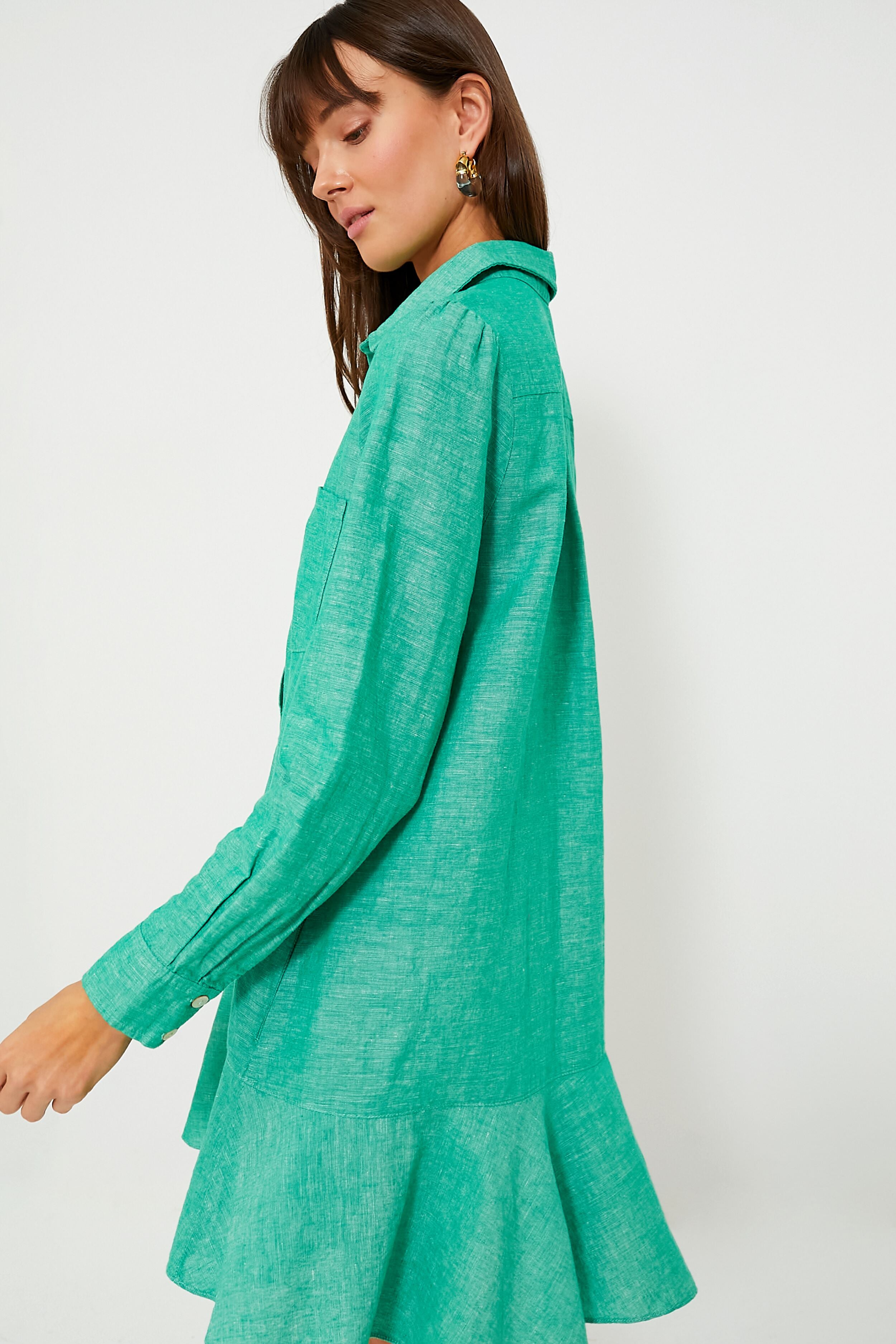 A little bit sweet but 100% chic. the Sea Green Callahan Dress perfectly merges classic and trendy. A play on the closet staple shirt dress. this mini features a swingy body with a ruffle hem. and collared neckline with a button-up half placket front. A season-less. throw-on-and-go style. we are pairing it with sneakers for running around town during the day. and switching to espadrilles for dinner with friends!