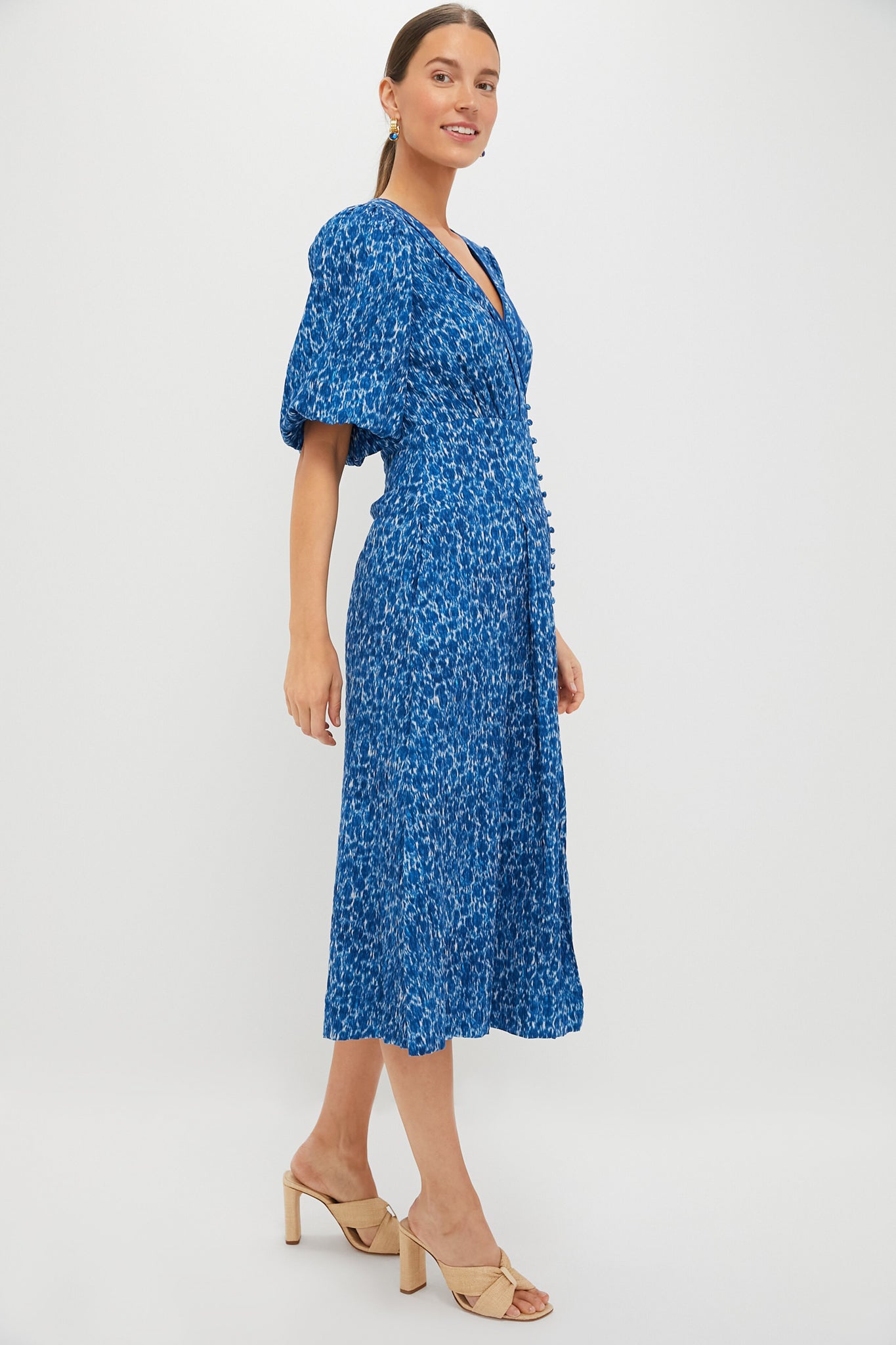 The Seaport Blue Dana Dress features a midi dress in a gorgeous blue hue. With a flattering fitted bodice. V-neckline. balloon sleeves. and side seam pockets. this dress is not only ultra flattering. but functional. Pair with heels or flats. a clutch. and a coordinating blue earring with the perfect versatile dress for the office. afternoon drinks with the girls. or celebratory occasions alike!
