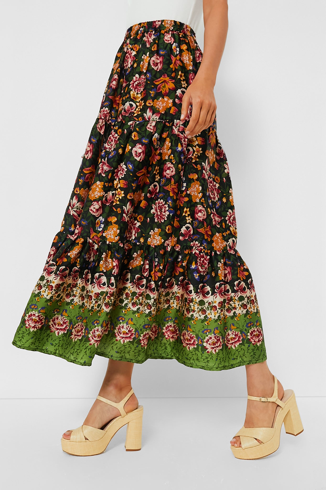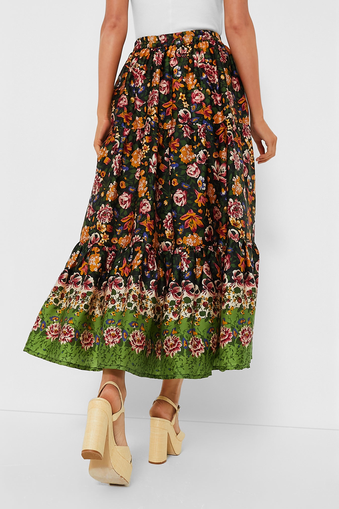 Add some secret garden vibes to your fall wardrobe with the Paola Skirt! Crafted from soft. satin finish viscose fabric. this tiered midi offers elastic waist for all-day comfort. and is playful addition to any look. Style it with a matching Secret Garden Jolie Top to embrace your inner flower child and twirl your way through the season.