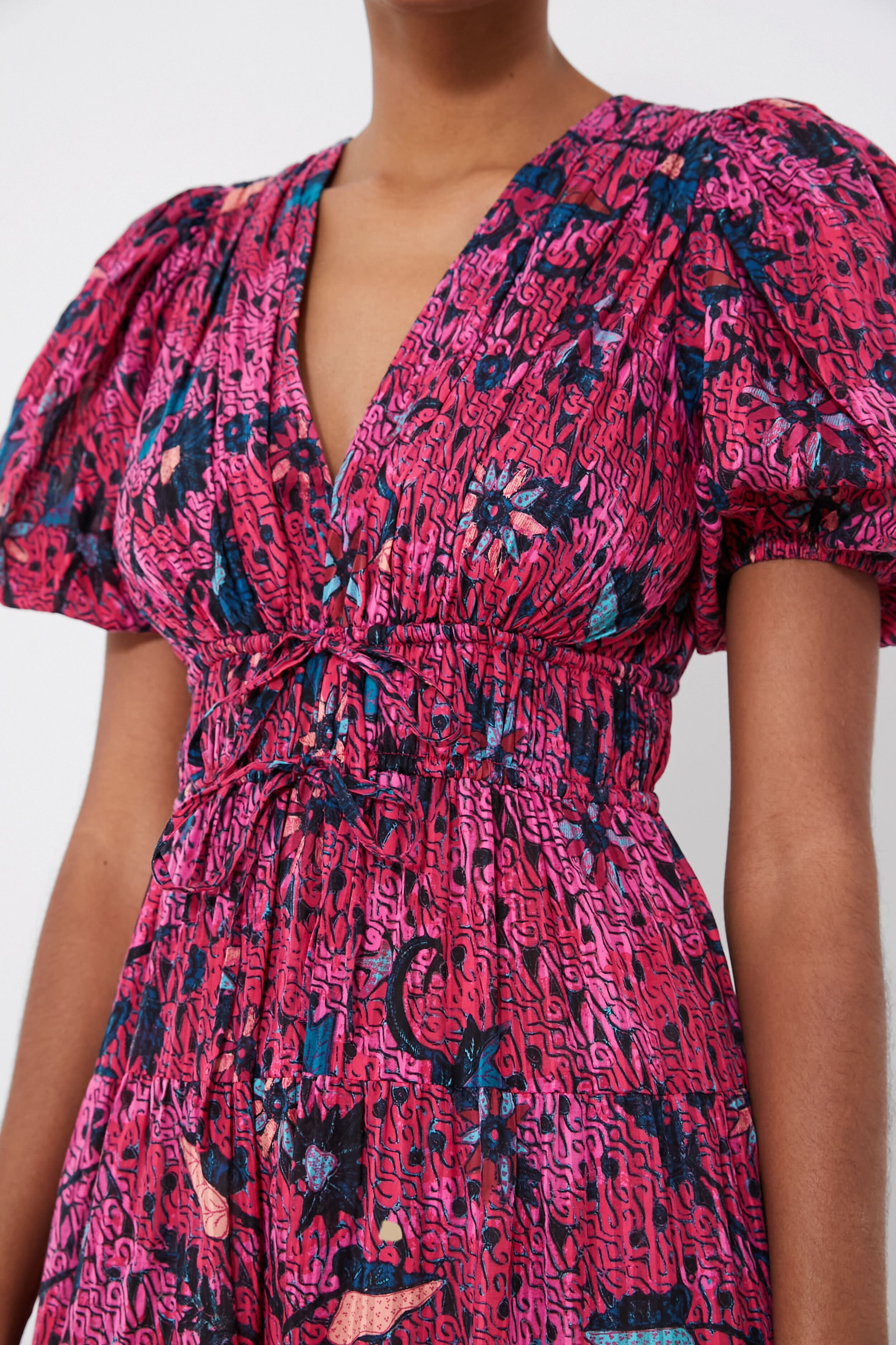It's that time of year again. where you need a sweet yet chic sundress for seemingly every event. The Snapdragon Thelma Dress is here to make things easy with its elegant V-neckline. flirty puff sleeves. and comfortable drawstring waist. Finished with a vibrant print upon a lightweight cotton-viscose material. this midi is a sure-fire way to get plenty of compliments at your next garden party or al fresco dinner. Just add heels and some simple gold hoops for a lovely look.