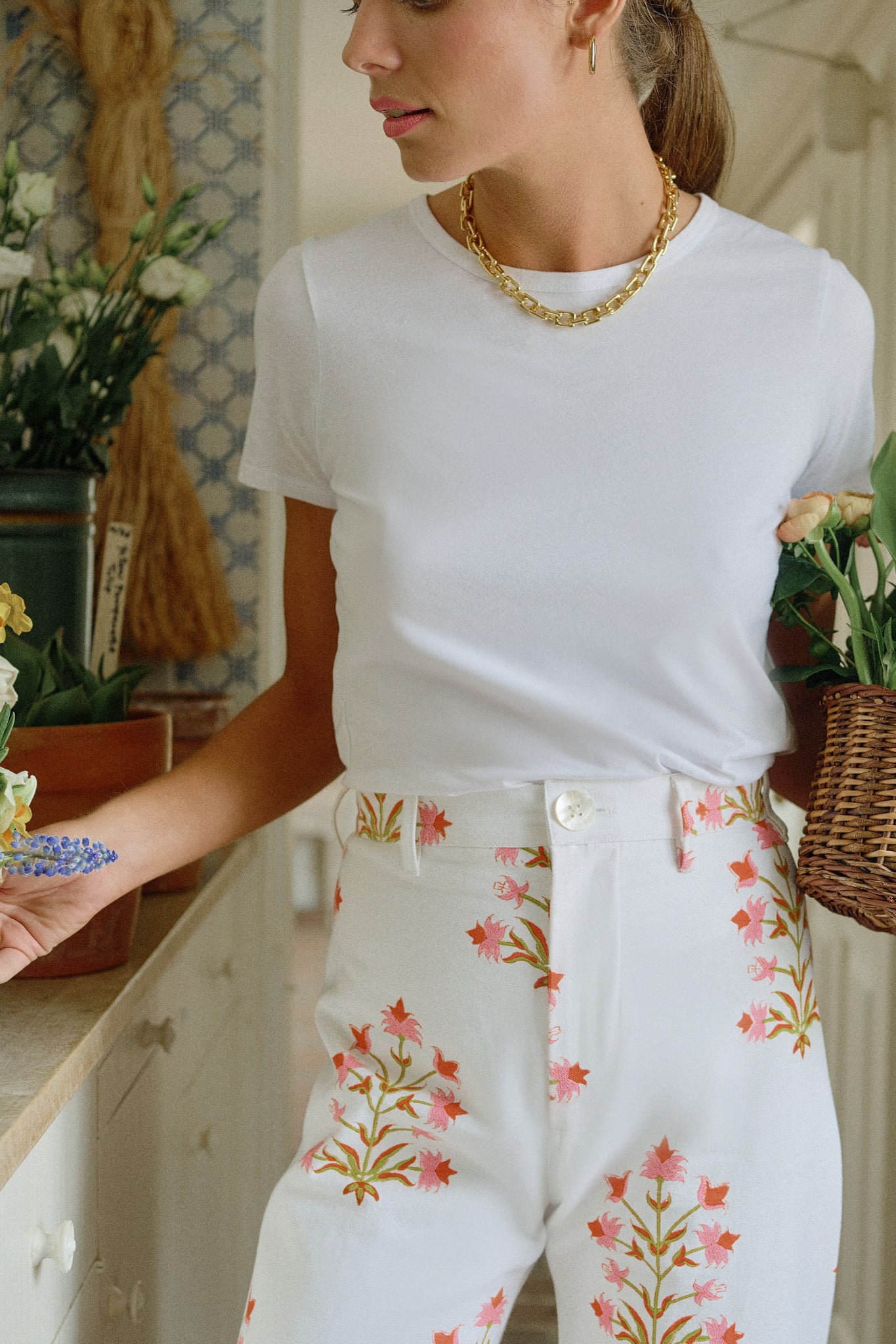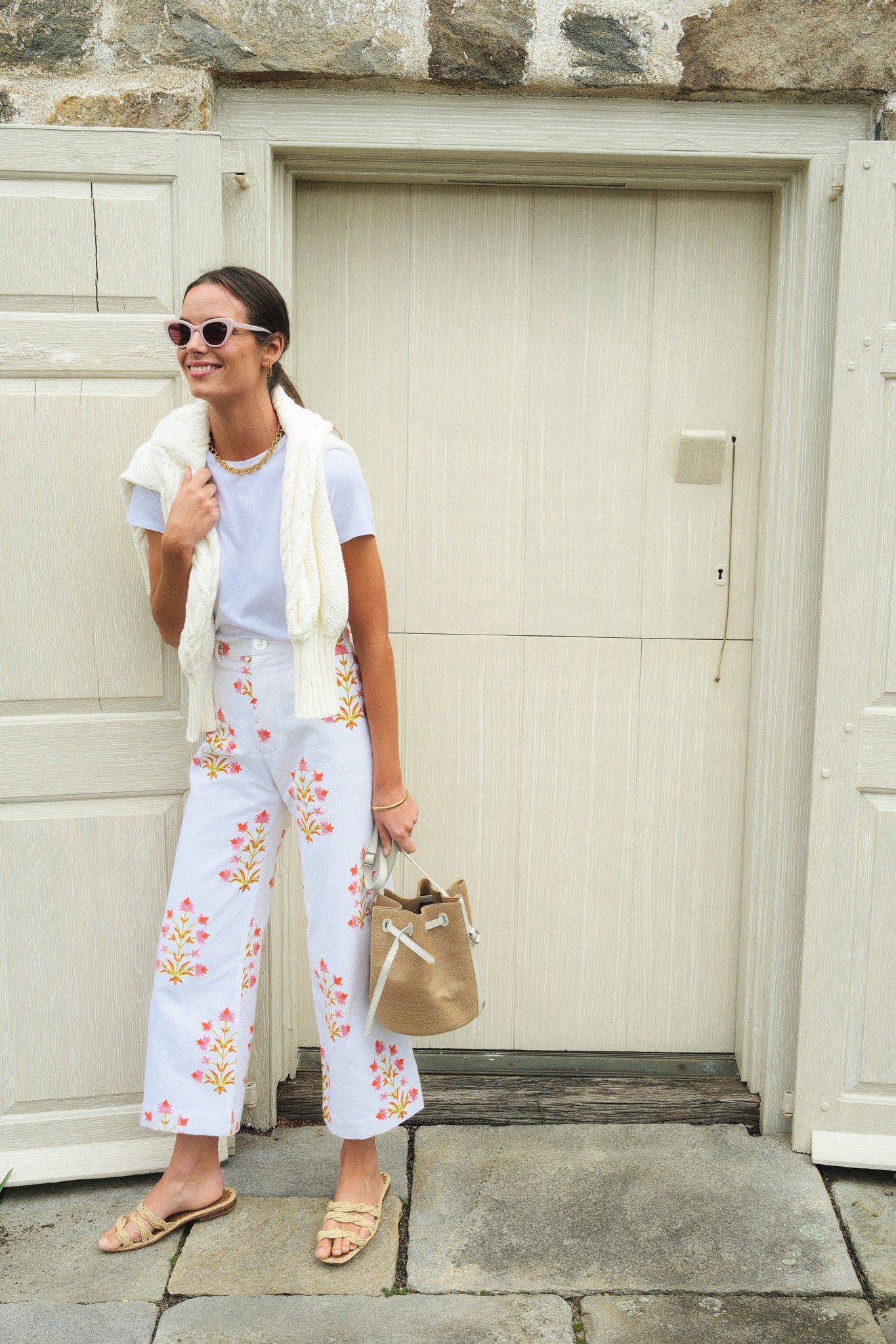 The Soft Rose and Tangerine Lily Print Disco Pants are sure to become your go-to bottoms this season. With a comfortable high rise and a soft cotton canvas composition. these cropped wide leg stunners in a fun block-print will flatter and elongate so you always look and feel your best when wearing them. There are so many exciting ways to wear these flares; we recommend trying it with a sleek blouse and a woven basket tote. with an airy camisole and sunglasses. or with a contrasting printed top and a pair of statement earrings!
