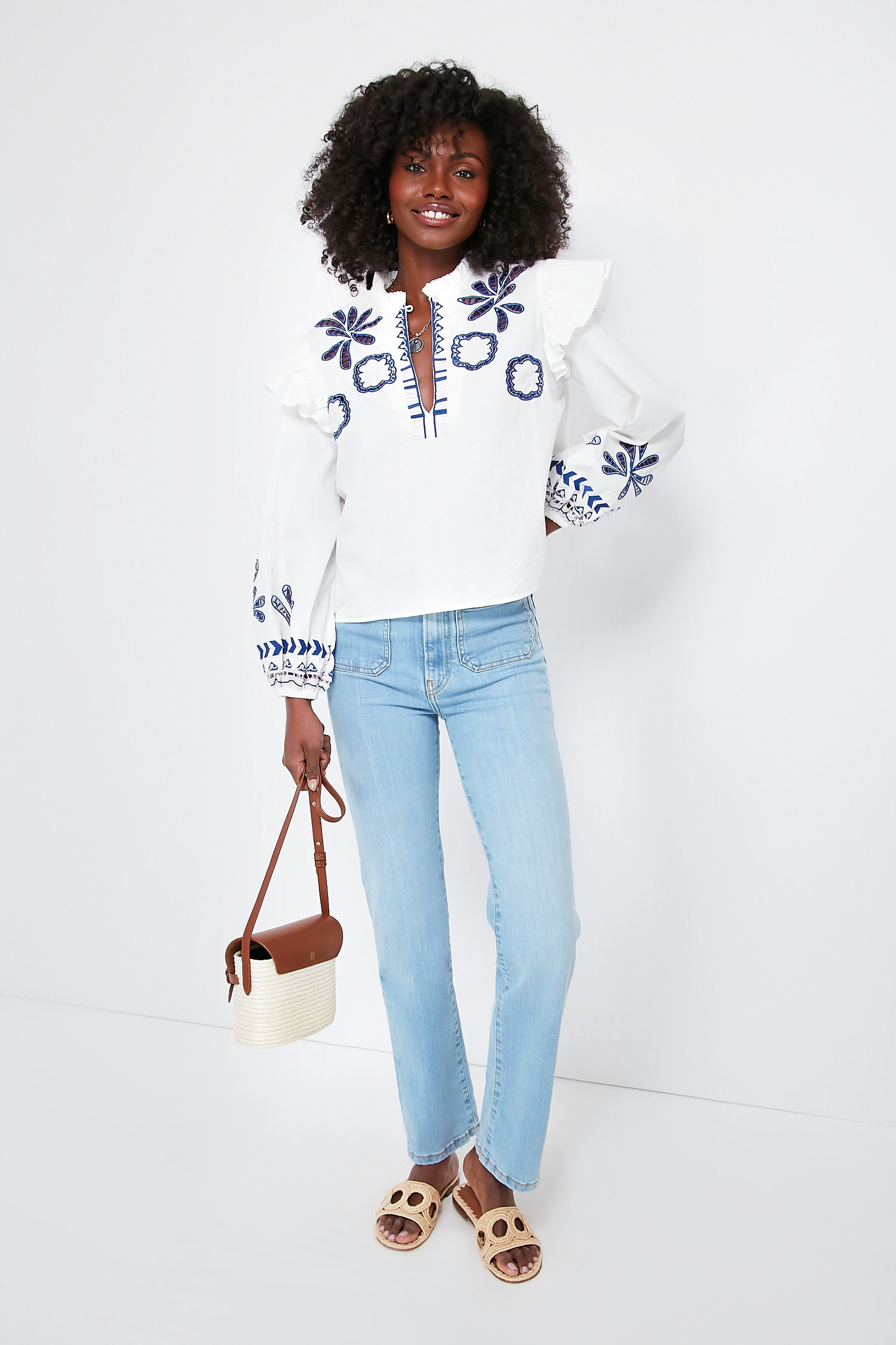 In a darling white and blue color palette. the Soumy Dilli Blouse is the boho style we have been dreaming of. Perfect for sunny brunches. or for seeing the sites in a seaside town. this charming top with a notched neckline. oversized ruffle shoulders. and contrasting cutwork embroidery is effortless yet mindful. Pair with light denim and sandals for an easy outfit formula. and don't forget to accessorize with gold jewelry and a suntan.