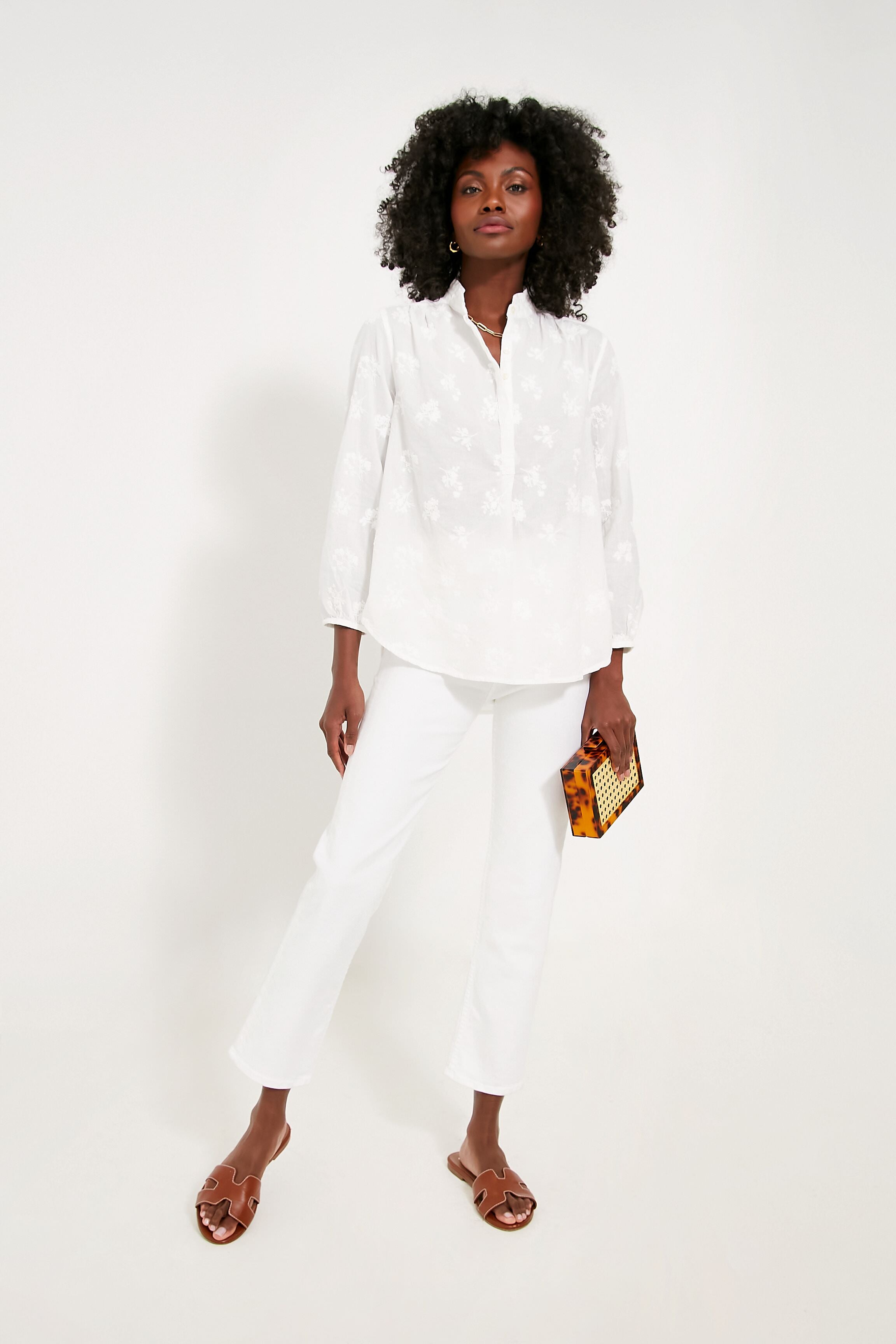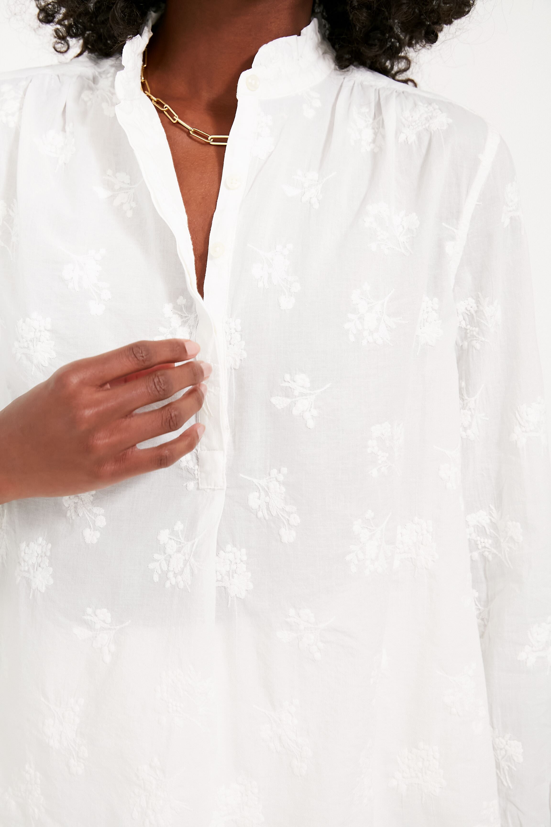 Effortless yet put-together. the Stitched Posy Sara B Henley is a twist on the classic button-down. Feminine and casual. this top features a standup ruffle collar and a hidden button placket. and it's finished with tonal florals that add a poised and prim touch. Pair with denim and flats for casual Fridays at work. or pair with wedges and a clutch to take it from desk to drinks.