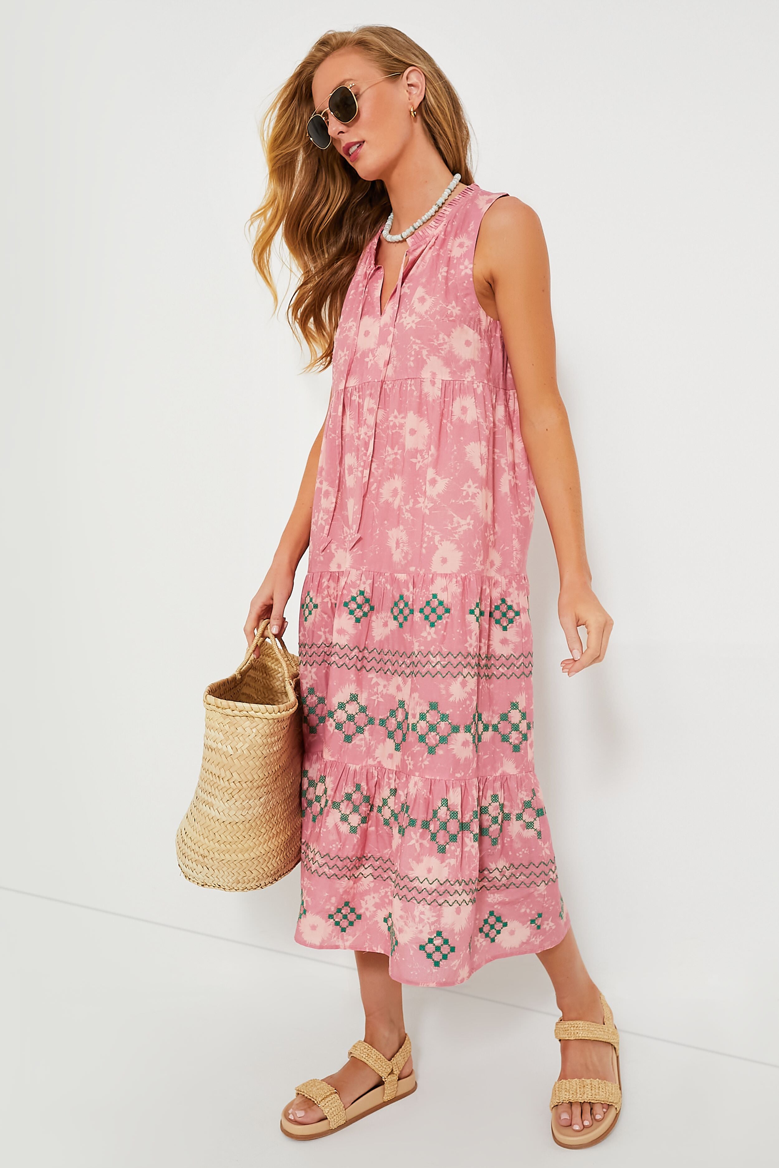 The Strawberry Blossom Embroidered Salty Paloma Caftan is a feminine. beachy style with elevated details. This maxi boasts a V-neckline with tassel self-ties. a tiered skirt. and a lattice cross stitch sourced straight from Parisian vintage markets. Perfect for the beach to the bar. simply pair this with sandals or espadrilles and a tote!