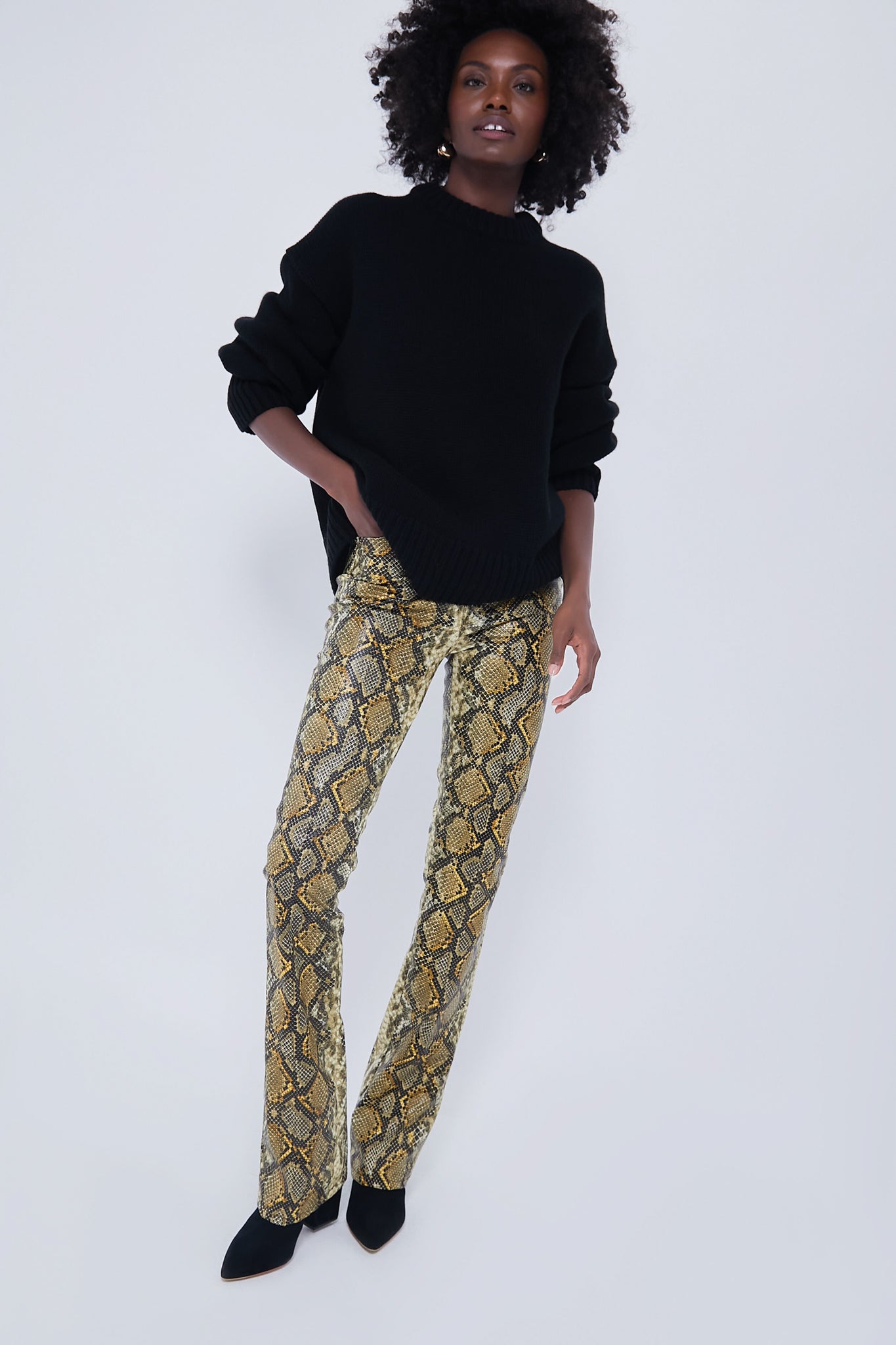 In a yellow and black faux snakeskin. the Striking Beauty Smokin Double Heel features a super high waist. super long inseam. combined with a statement-making flared leg. Ready to bring some sass to your look. these chic trousers pair effortlessly with everything from blouses to sweaters.