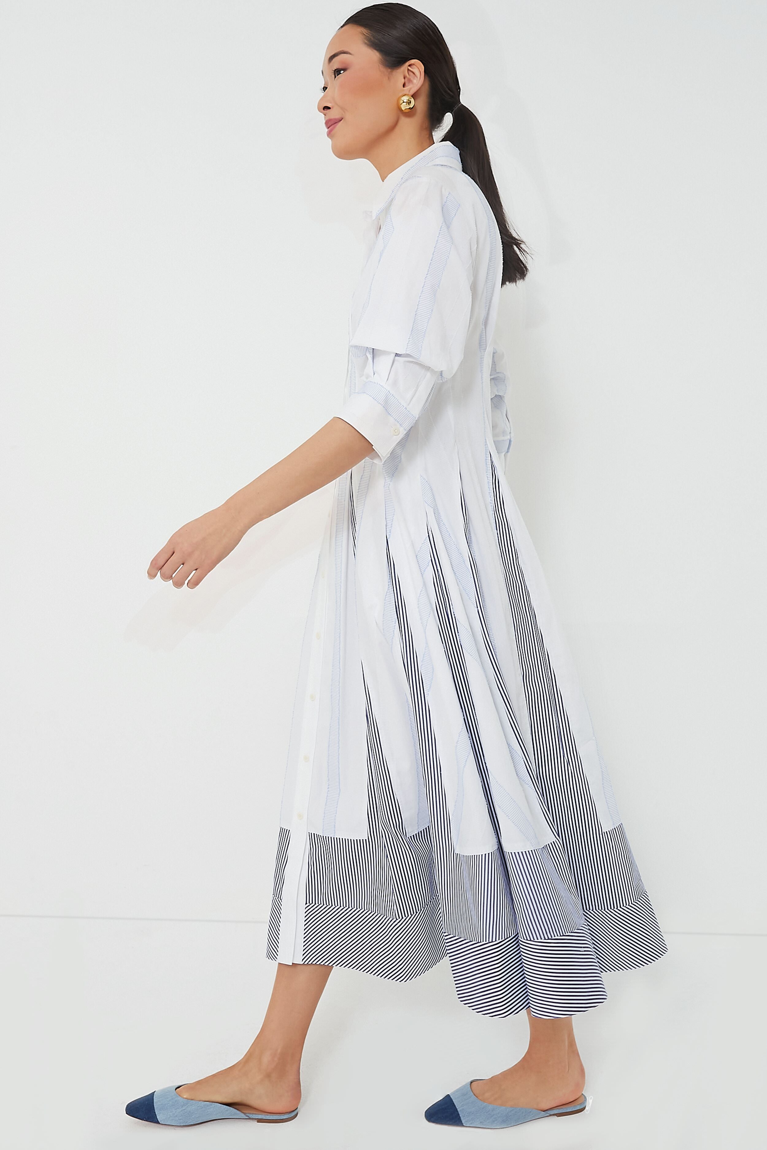 The Stripe Multi Jazz Patchwork Dress is a season-less piece to add to your wardrobe. This fun-to-wear maxi features a classic shirtdress silhouette with a pintucked waist providing a flattering fit and a full skirt promoting effortless movement. Add sandals and some statement jewelry for an effortlessly cool look perfect for anything from beachside brunch to happy hour.