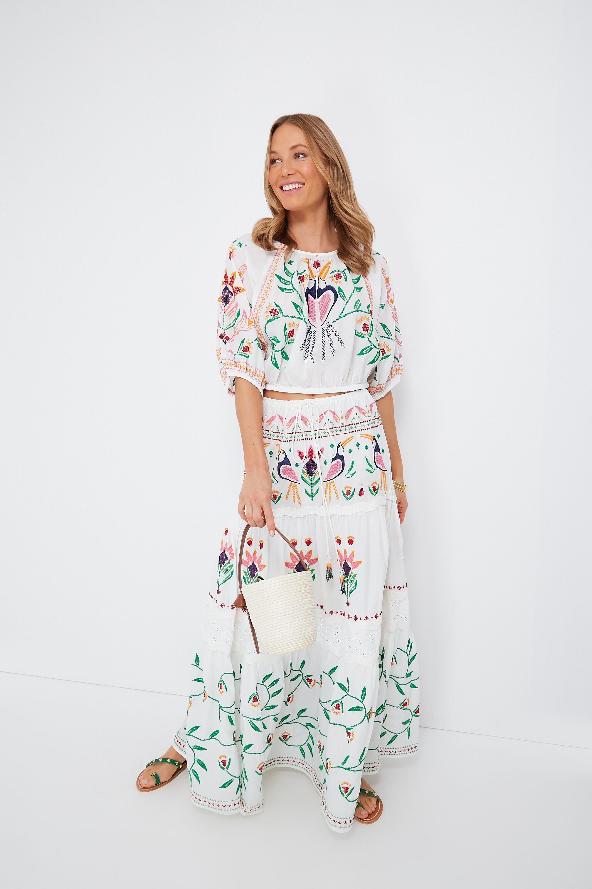 The Summer Garden Embroidered Skirt brings some Brazilian vivacity to your new-season wardrobe. Adorned with intricately embroidered birds and botanicals throughout. this breezy tiered maxi has an elasticated waistline with a drawstring for ultimate comfort and ease. Pair it with the matching crop top and raffia accessories to complete your sun-filled look.