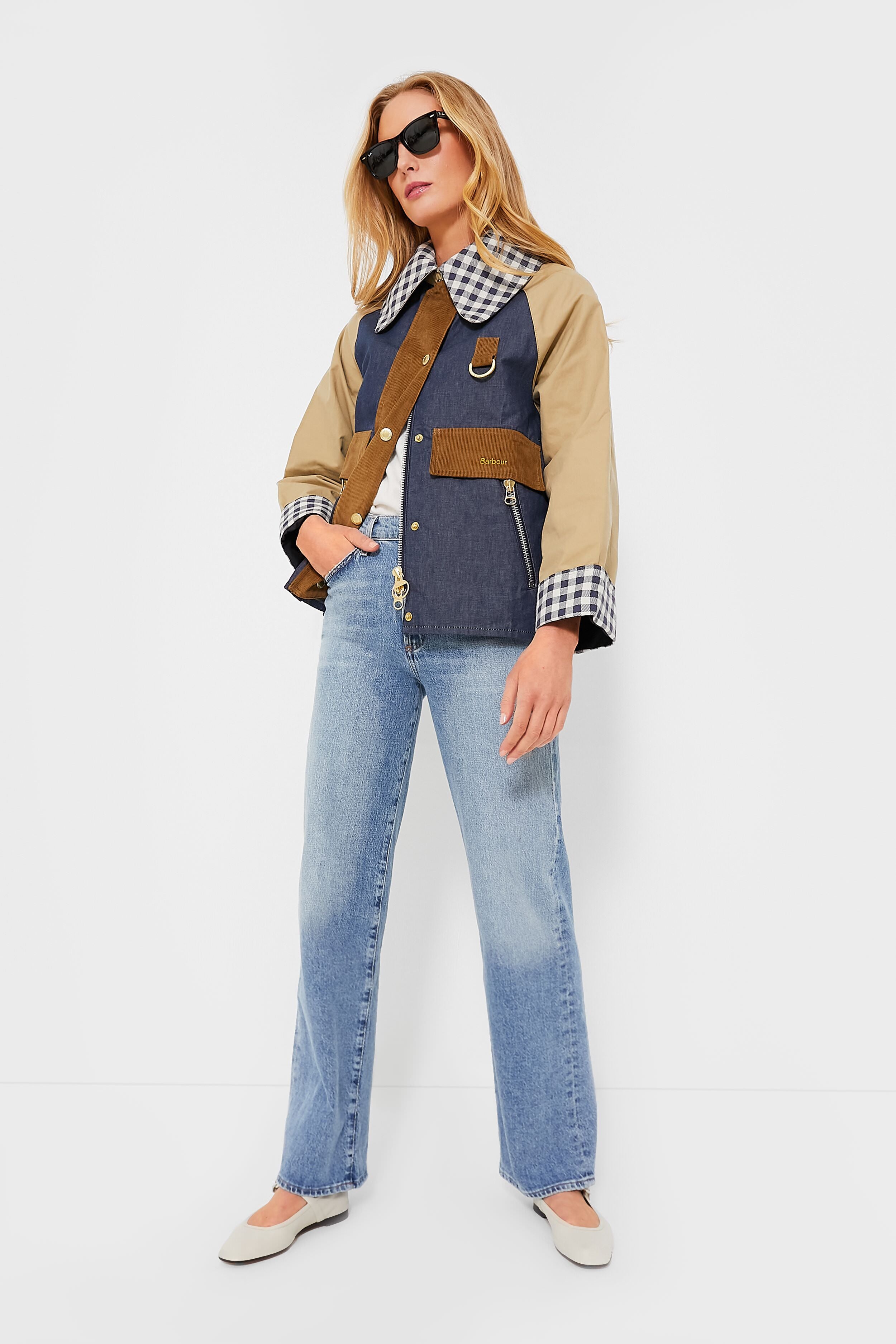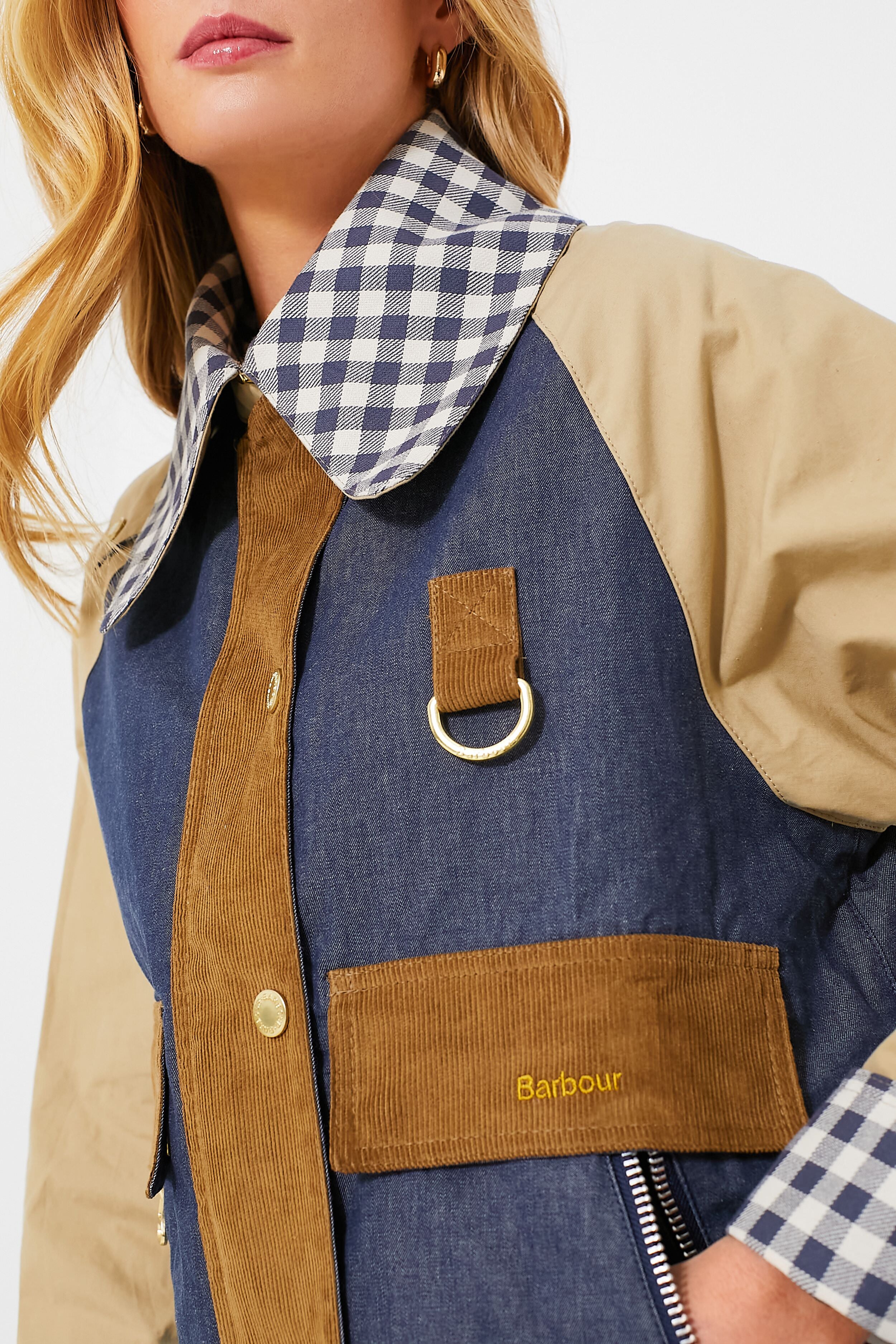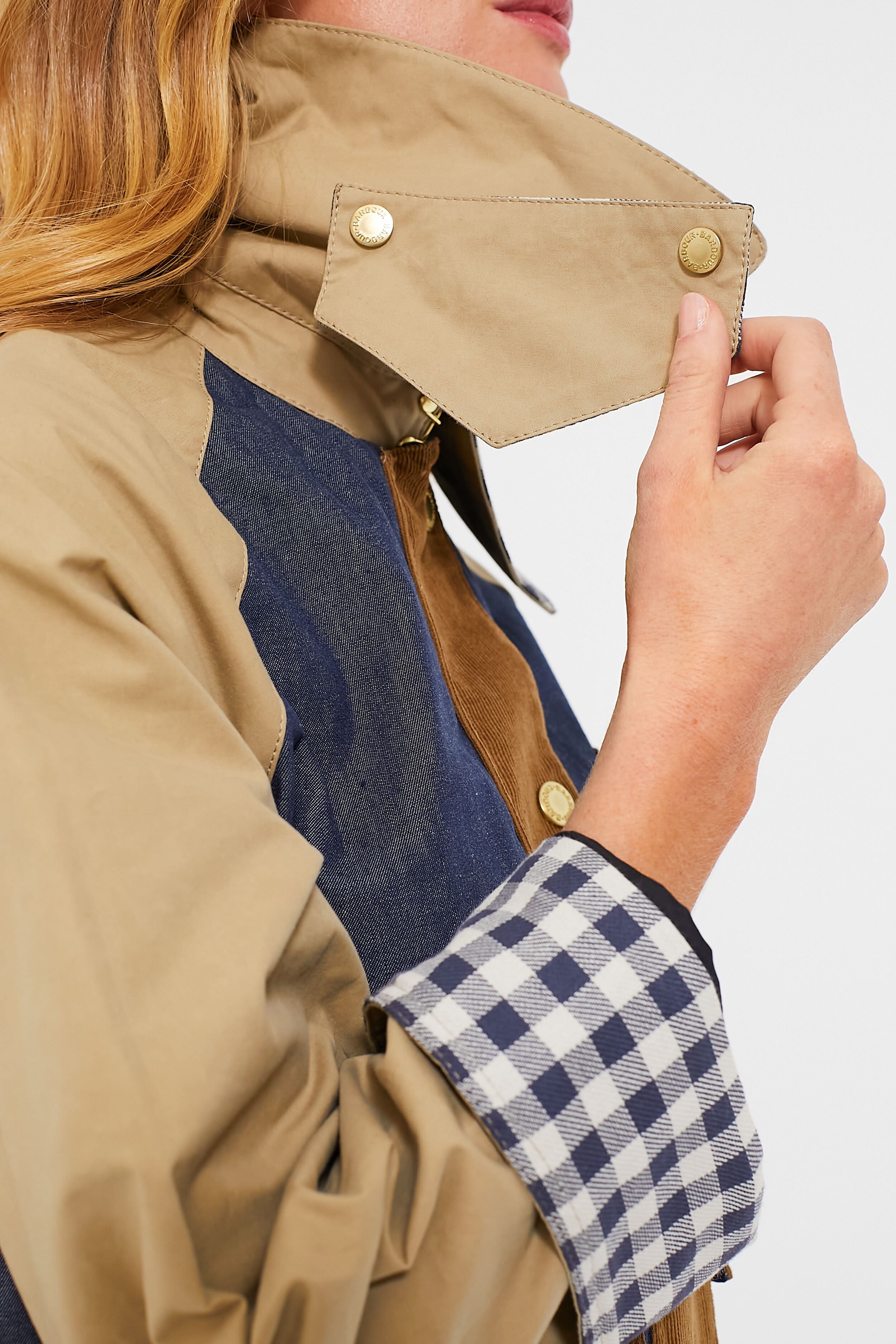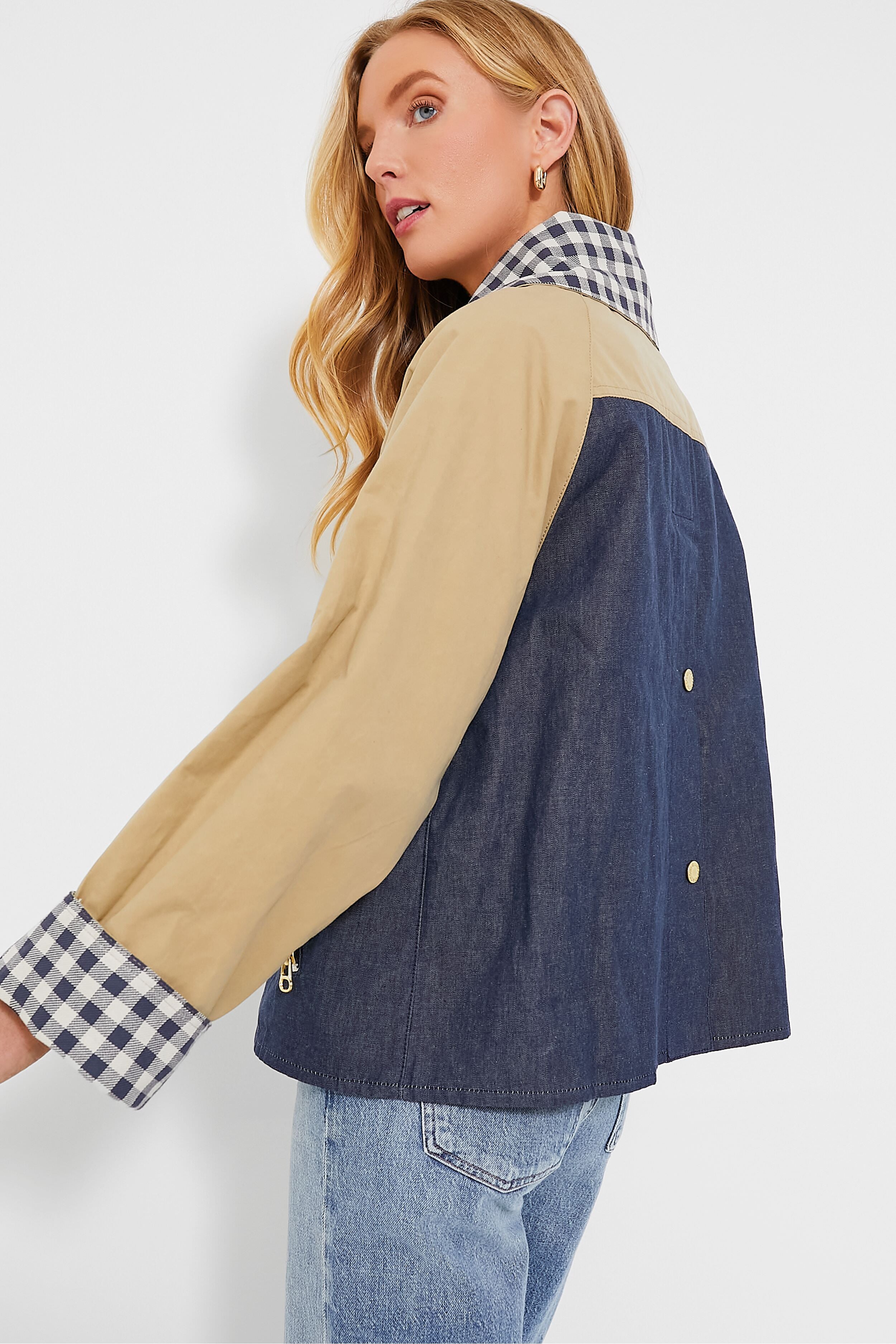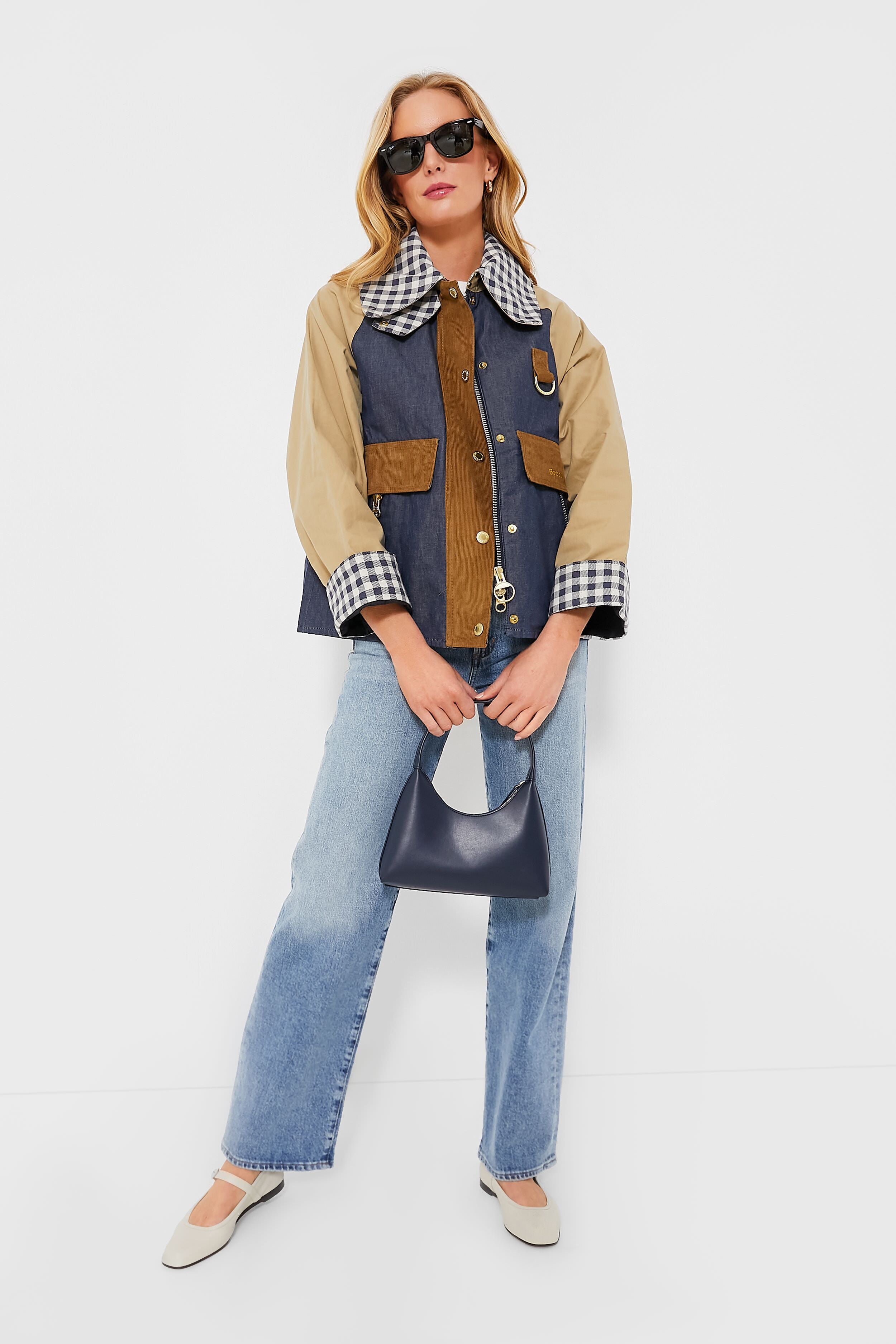 The Summer Navy Northumberland Catton Patch Showerproof expertly plays with proportion. contrasting fabrics. and colorblocking to create an outerwear icon. With statement-making details like an oversized gingham collar. a cropped length perfect for pairing with high waisted bottoms. and plenty of gold hardware in the form of a D-ring. snaps. and zippers. this is a cool-girl take on a classic. Style with a mini skirt and loafers for a flirty styling. or go for straight leg denim and flats for an elevated everyday look.