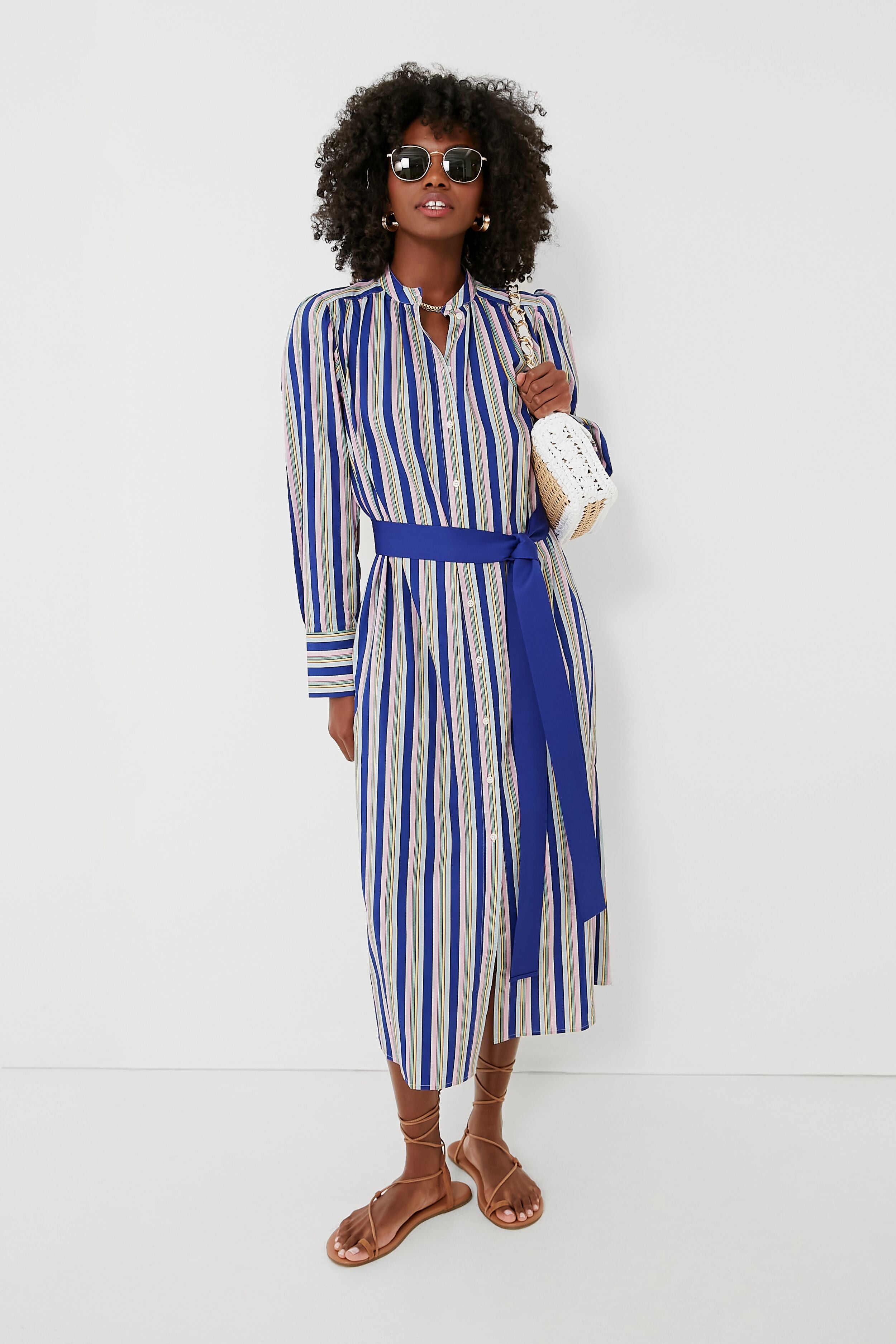 Versatile and ready for day-to-night wear. the Swedish Blue Positano Shirt Dress is a relaxed-fitting silhouette featuring fresh stripes printed on crisp cotton poplin. In an on-trend midi length. this chic number features a full button down placket. side seam pockets. and an optional cobalt self-tie belt that allows you to add definition and shape. Perfect for styling in a number of ways. this stunner can be worn loose with strappy sandals and a tote for everyday. or belted with wedges and a gold jewelry for a sunset dinner party.
