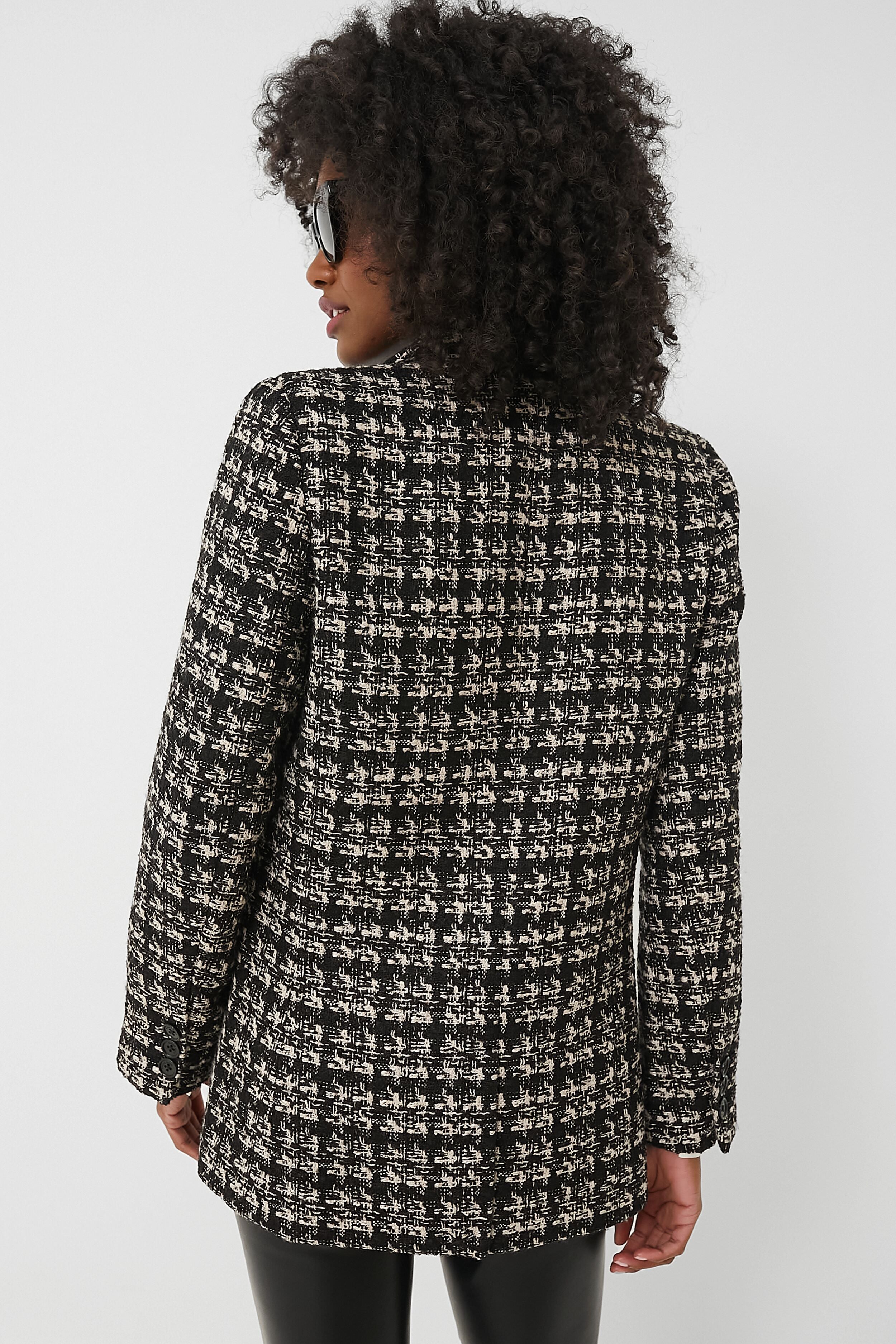 Designed for light layering. the Tan and Black Tweed Madeleine Blazer delivers a universally flattering fit and a super-chic look. Featuring a lapel collar. structured shoulder pads. and a double-breasted front. this timeless statement piece will live in your wardrobe for years to come. Complete with welt pockets at the hips and an interior chest pocket for your small everyday essentials. we are styling this sophisticated silhouette with a tee and denim for an ensemble fit for any occasion!