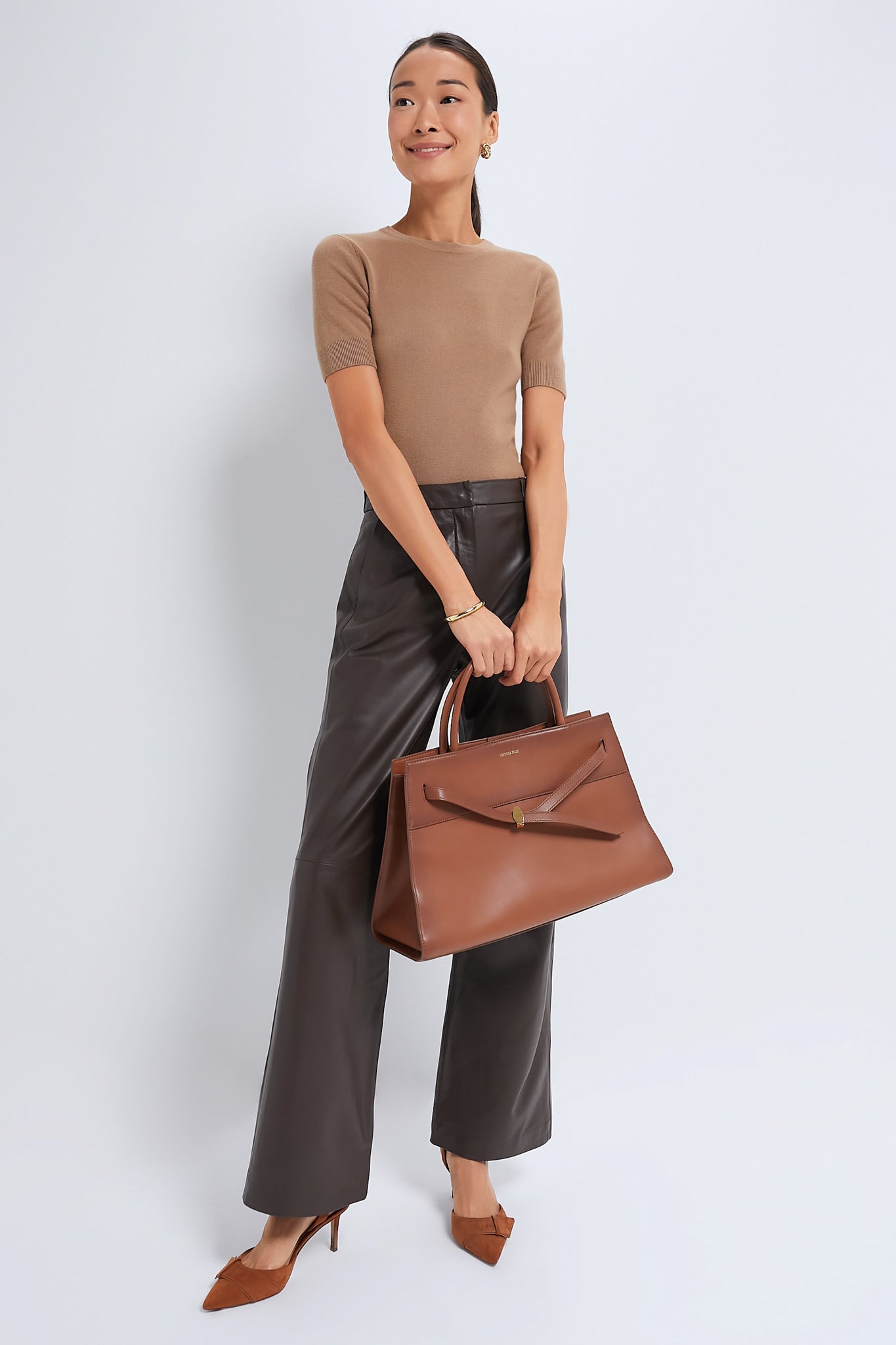 The tee is a true staple for the cooler months. with its sleek figure-hugging silhouette. neutral colorway. and soft cashmere construction. Pair with dark wash denim and boots or a mini skirt and ballet flats!