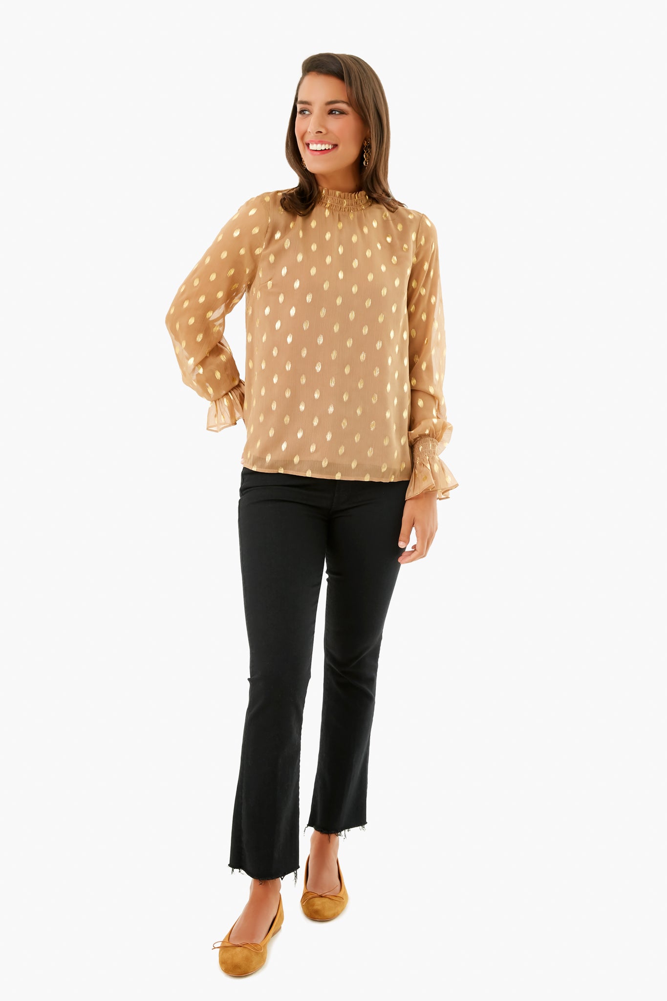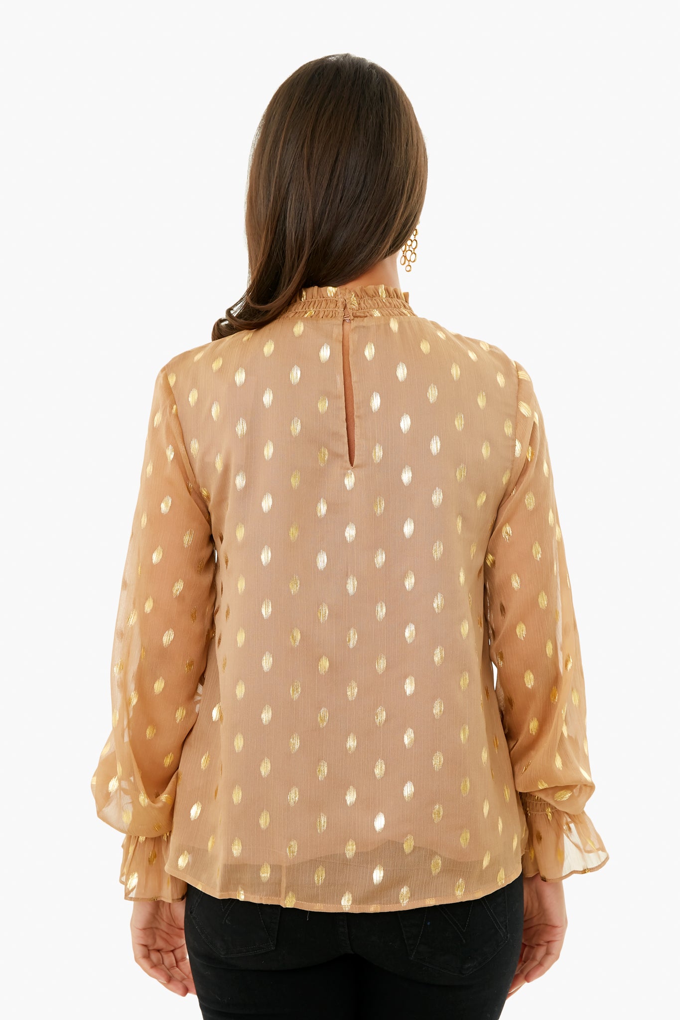 We are loving feminine details this season and the Tan Celeste Blouse does not disappoint. Featuring sheer sleeves. elastic cuffs and neck. and an overall shimmer. this is guaranteed to wow. We are wearing it with denim and flats. perfect for picnics this season!