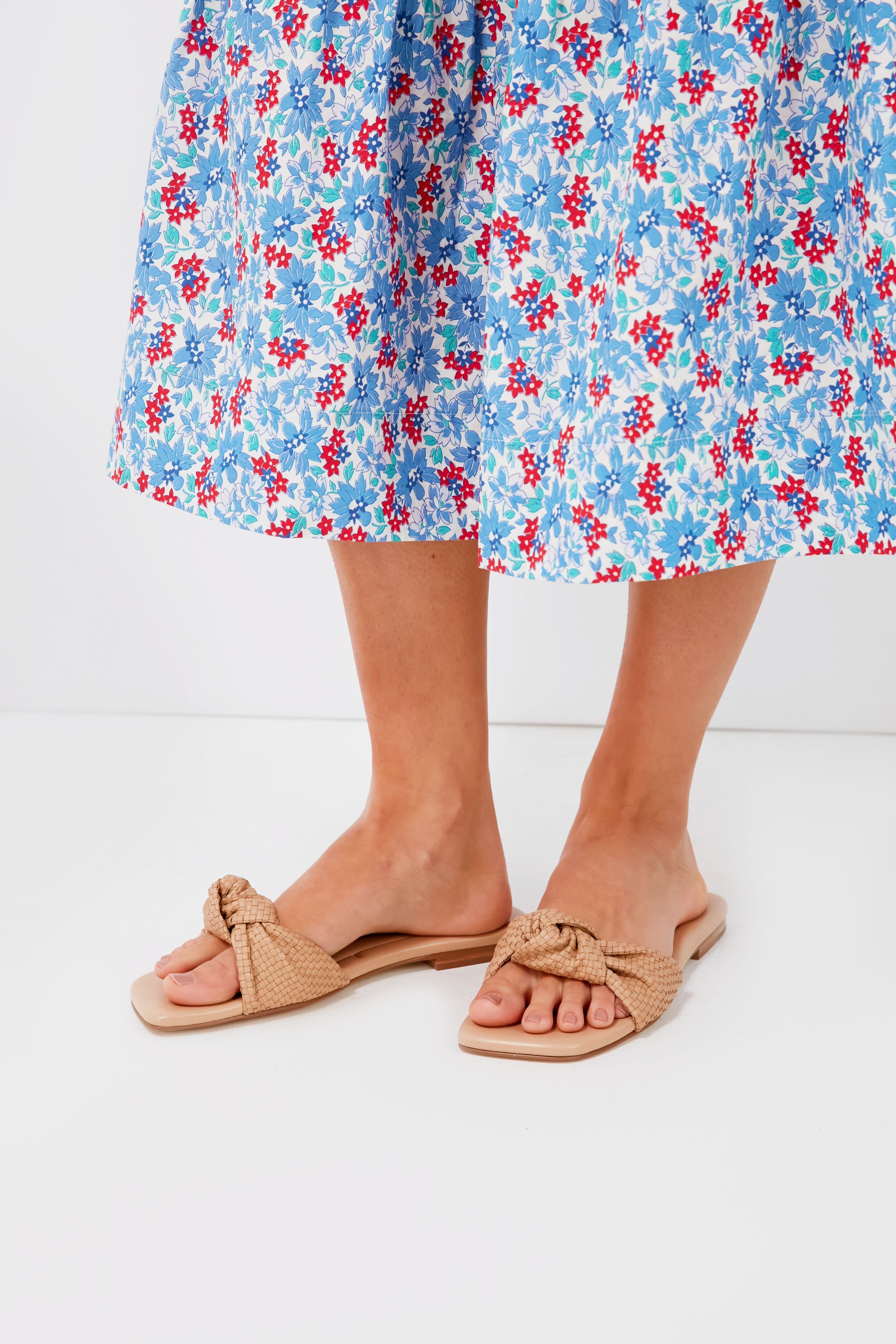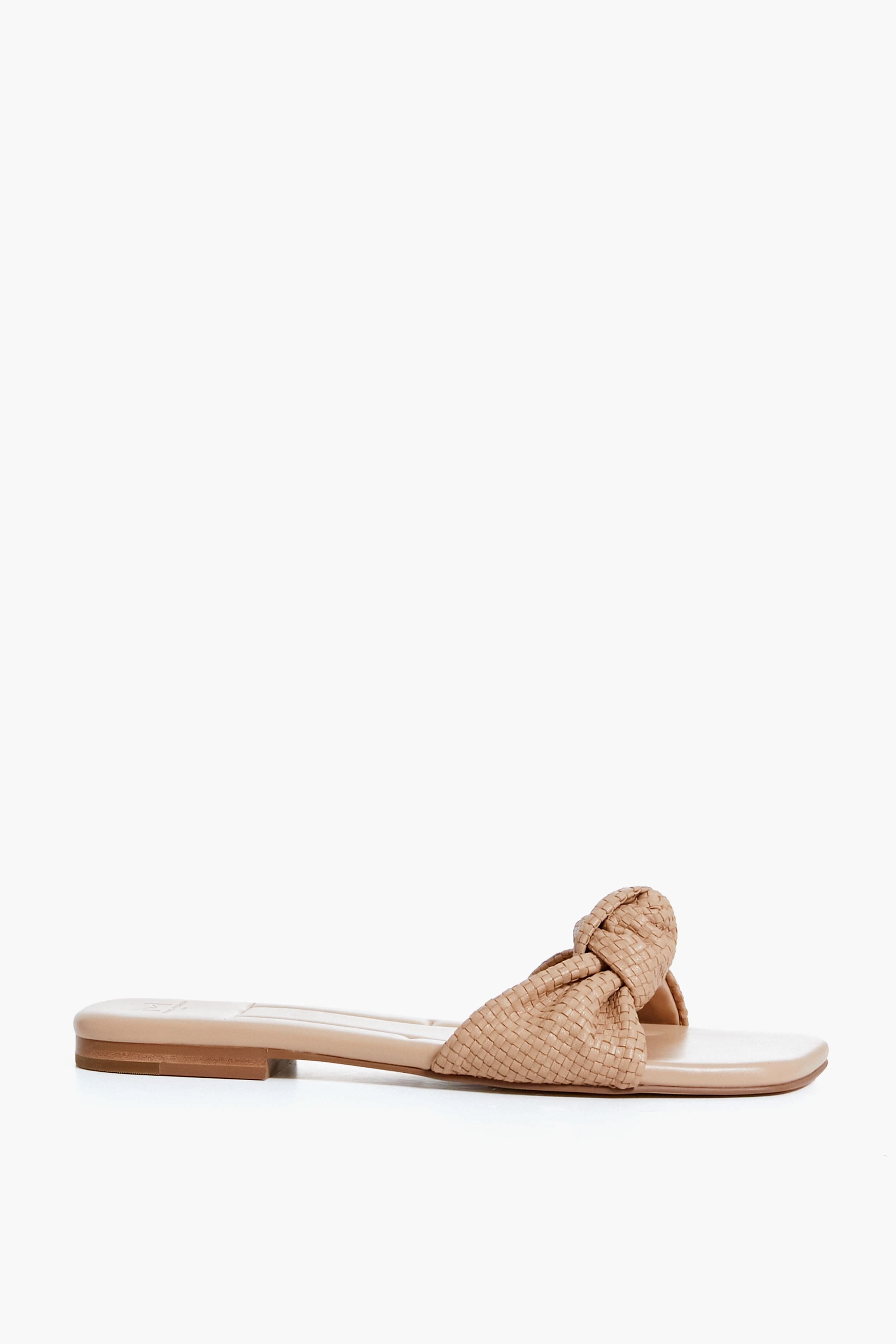 Effortlessly complement any warm weather look with the Tan Marlon Sandals. With a comfortable and super wearable flat heel. as well as a woven upper with a knot detail that was made to stand out from the boring shoes of yore. we know you're going to reach for these over and over again. Contemporary with its square toe. yet classic enough to keep for years to come. we love pairing these with flowing dresses to outdoor dinners. with swimwear by the pool. or with denim shorts to run errands.
