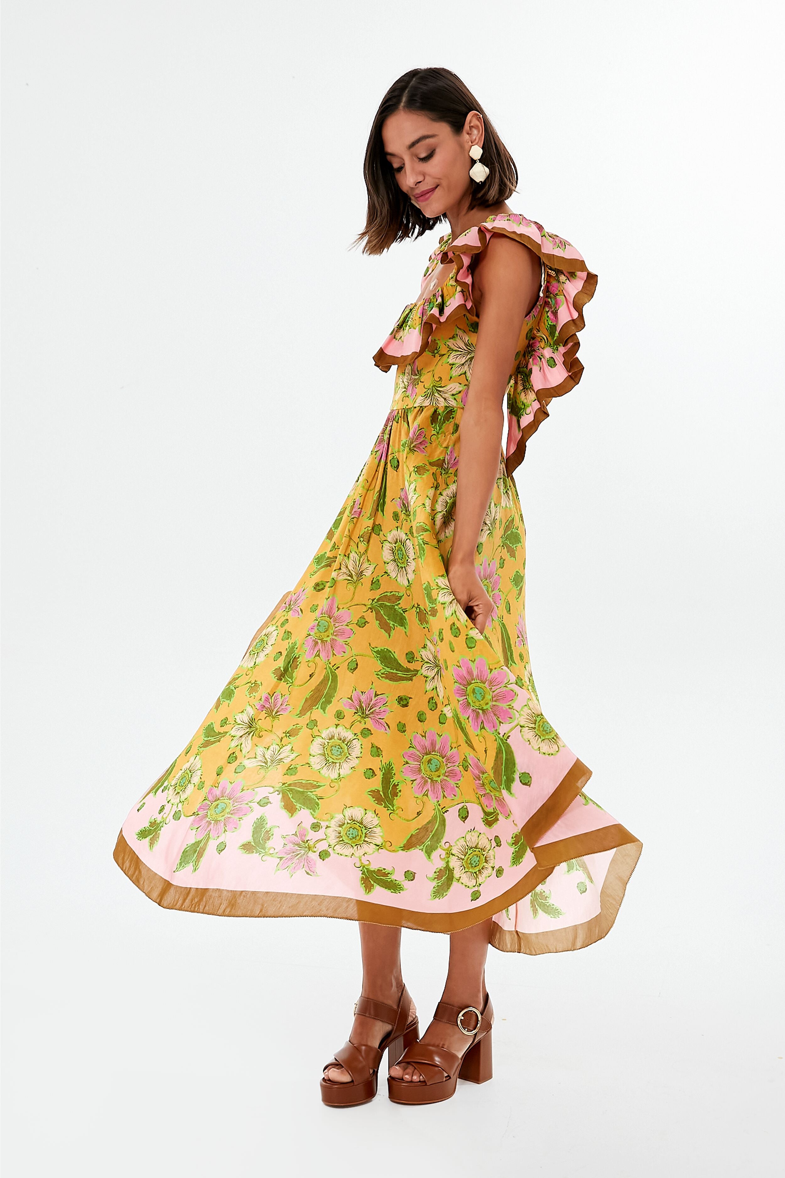 In a fabulous color scheme full of rich browns and vibrant pinks. the Tangerine Winnie Dress just screams vacation dressing. Cut from a luxe blend of airy linen and super-soft silk. you are sure to feel your very best when wearing this stunning silhouette that features a ruffled neckline. a low back with criss-cross straps. and a floaty skirt that catches the warm breeze. Easily dressed up or down. this midi can be worn with flip flops and a sunhat for sunny morning brunches. or styled with heeled sandals and statement earrings for sunset boat cruises.