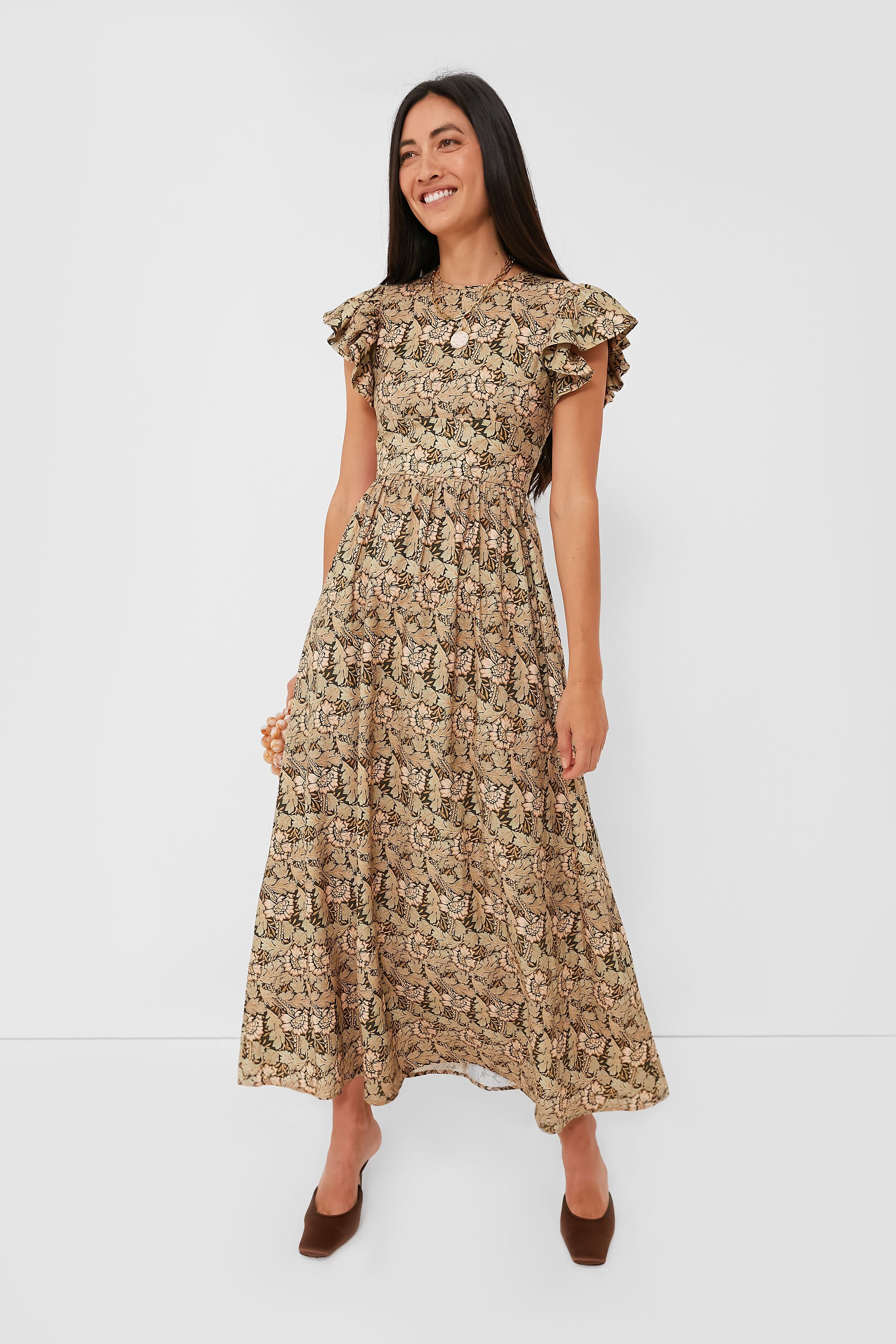 In a darling print full of rich earth tones. the Tapestry Floral Martinelli Dress is a no-brainer. It is chic. made for throw-on-and-go styling. and complete with plenty of special touches — a high round neckline for a hint of polish. voluminous flutter sleeves. and functional side seam pockets. Versatile as ever in a lightweight cotton fabric. this maxi can be paired with crisp white sneakers and gold hoops for weekend brunches. or with satin heels and a clutch for social events!
