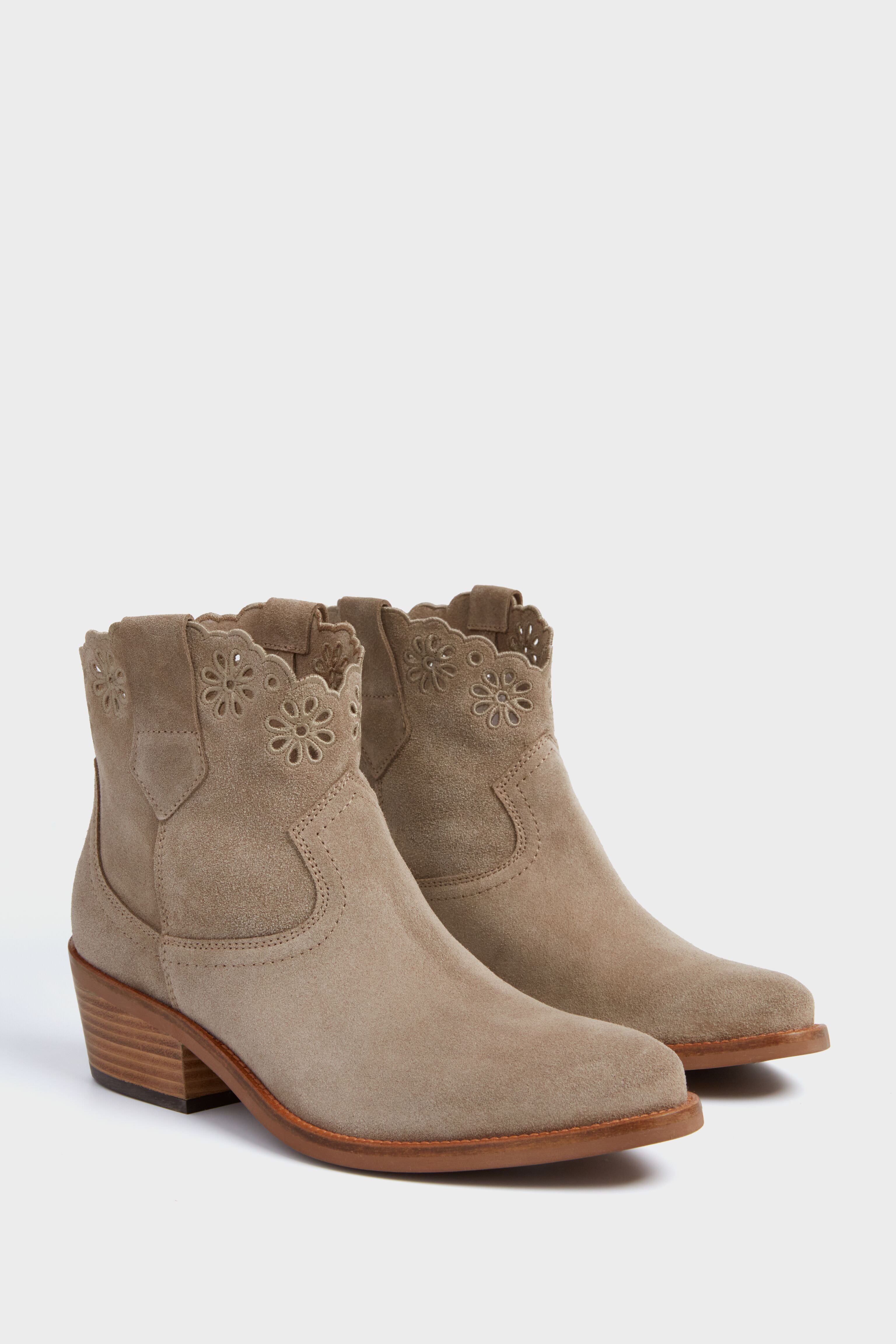Step into the cowboy trend with this stylish take on authentic western style. The Taupe Cali Broderie Suede Cowboy Boots are made from the softest oiled suede upper. cropped to the ankle with a moderate Cuban heel. making them easy to wear all day long. The adorable addition of a feminine cutout detail makes them perfect for styling with jeans and a chunky knit for daytime or with a dress for a more formal evening look.