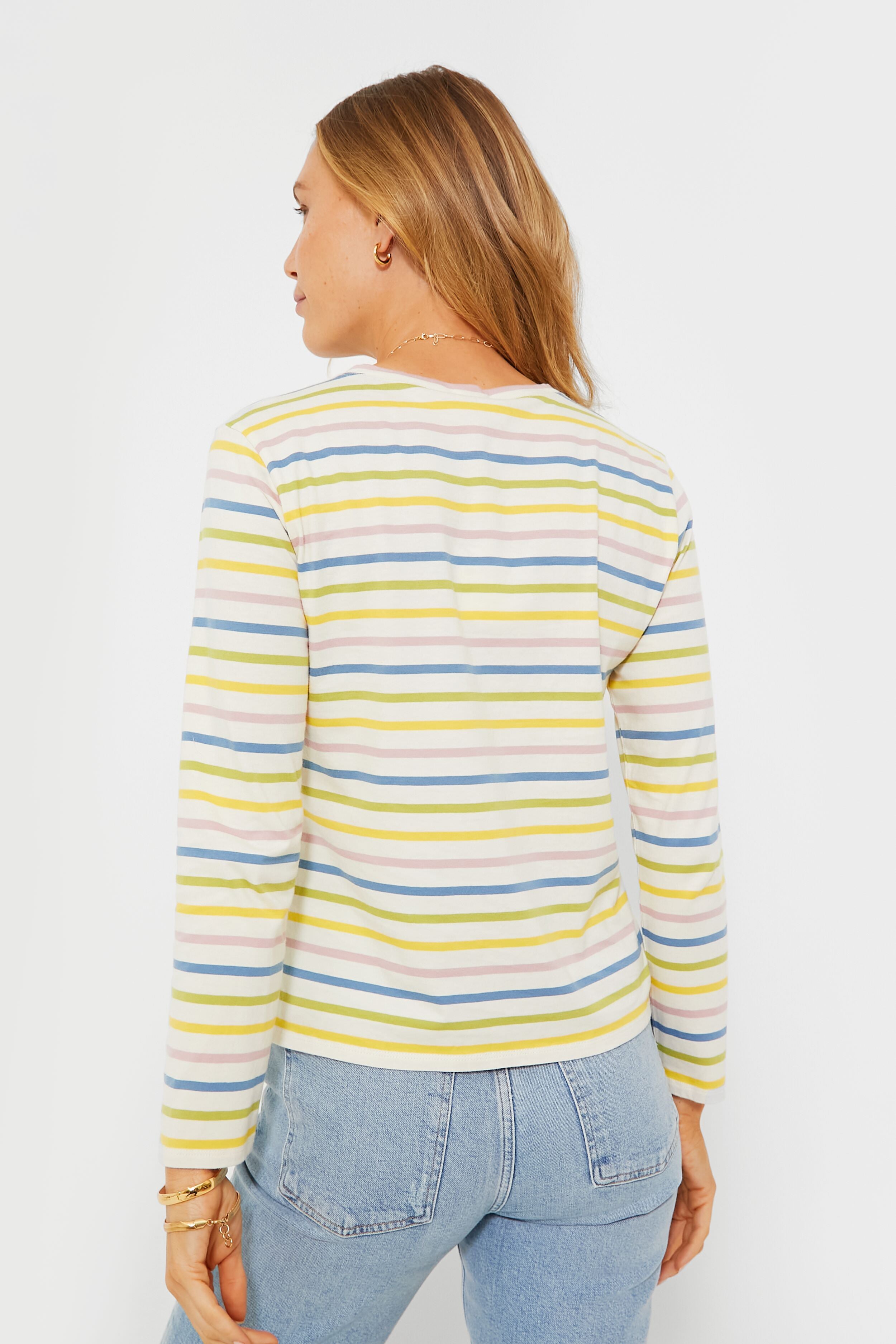 When off-duty. tomboy style gets a polished finish. you end up with the Rainbow Stripes Modern Long. Featuring a fun colorway. horizontal stripes. and a crew neckline. this top is effortlessly cool. Made of super soft cotton. this style is a superb base for so many outfits. Style with denim cutoffs. your favorite sandals. and a baseball cap for a day on the water. or with white denim and gold hoops for brunch — no matter how you wear it. it's the perfect tee.