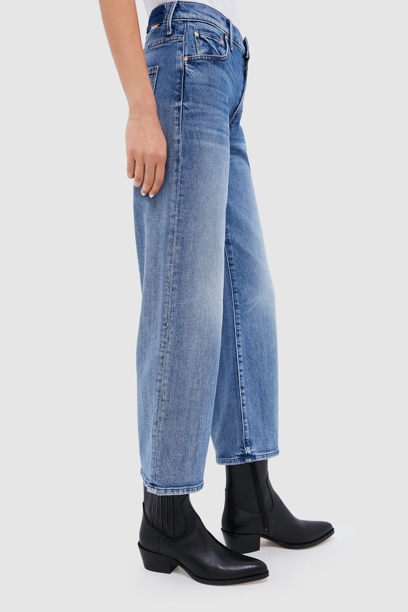 Cut from stretch fabric. this mid-rise wide-leg silhouette features ankle-length inseam and clean hem. With a mid blue wash that will complement any top you style it with. pair with a body suit and heels for a night out. or with sneakers and a top for a casual day around town.