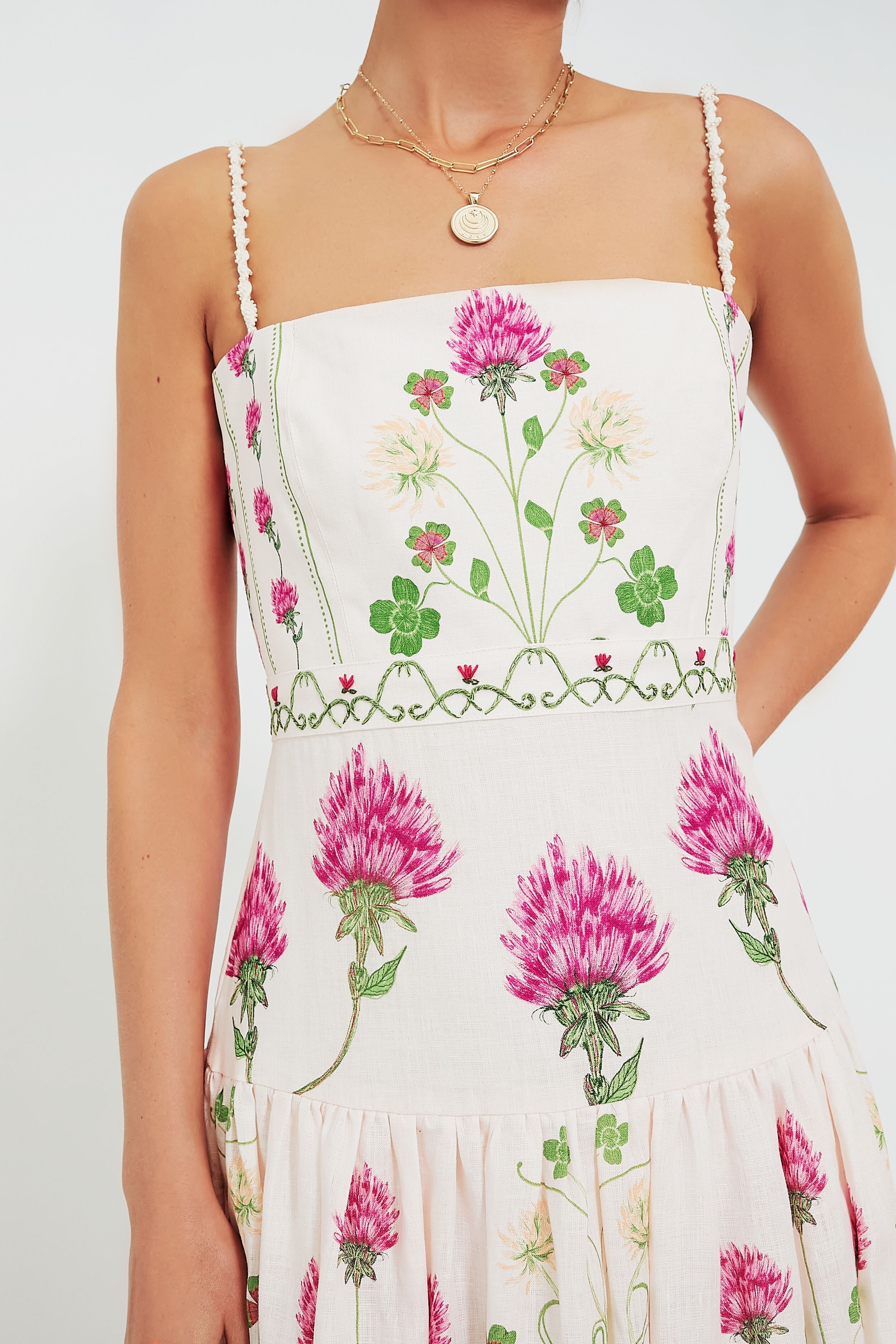 Adorned with painterly florals in vibrant shades. the Trebol Lima Dress is the vacation style of our dreams. Elegant touches like a square neckline. adjustable crocheted spaghetti straps adorned with tiny faux pearls. and a floaty tiered skirt make this silhouette feel ultra-special and totally unique. Breezy linen with a cotton lining ensures that you can keep cool as you wear this magnificent maxi for sunny brunches with sandals and gold hoops. or for beachside celebrations with heels and a clutch!