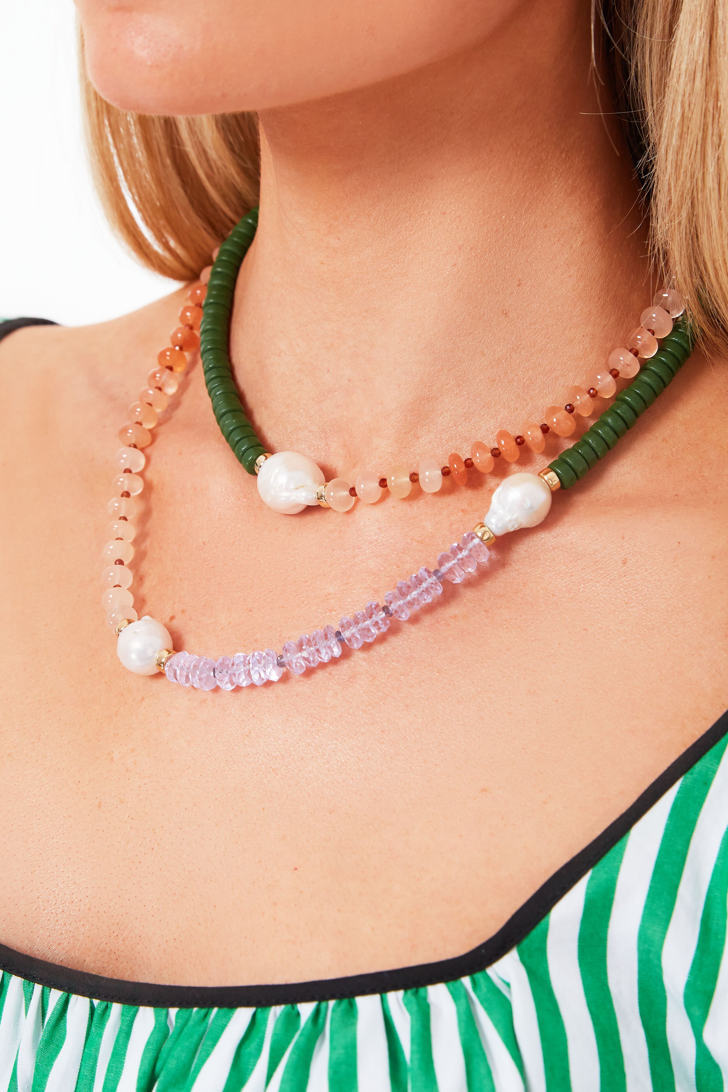Your vacation look will be made in the shade with the Tropic Cabana Necklace. Featuring peach moonstone. hessonite garnet. natural pink amethyst. and dark green Java glass. this multi tone stunner is unlike any other. Dotted with oversized freshwater pearl accents. this strand can be worn long or doubled twice for a versatile style. Add oversized sunnies and strappy sandals for subtle glamour on you next getaway.