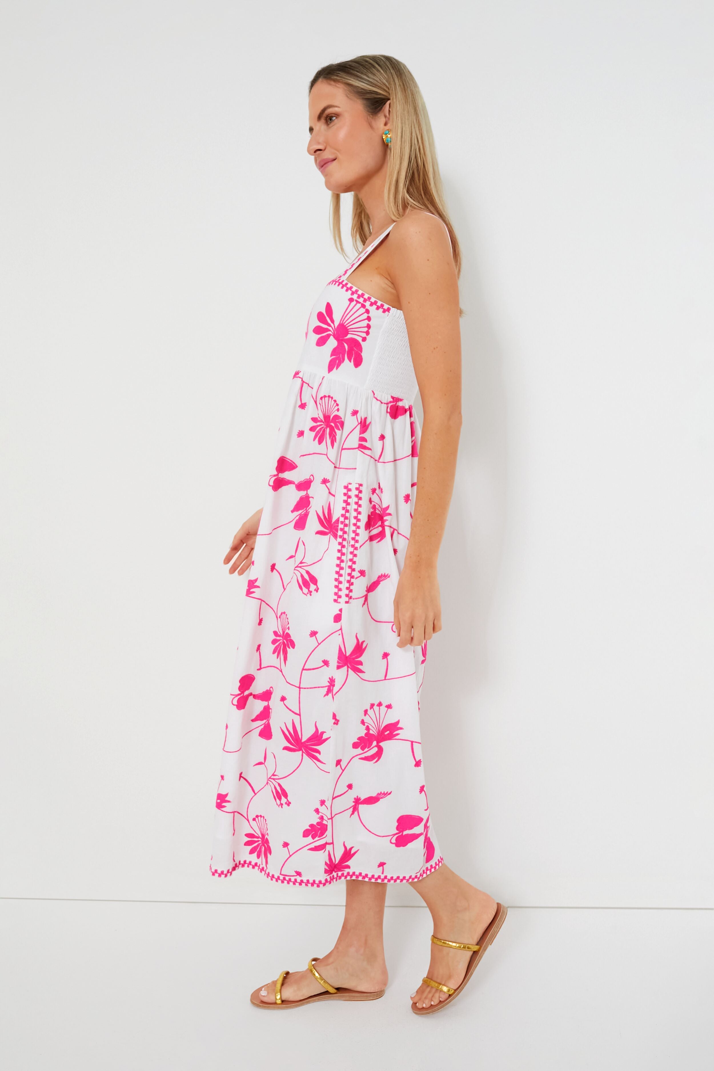 Talk about a bright pop of color! A Morningim exclusive style. the Tropical Flower Pink Agate Dress is made from breezy and sustainable organic cotton embroidered with a stunning floral motif. This sleeveless midi has a relaxed and airy silhouette that is perfect for warm-weather adventures and all kinds of fun in the sun. Pair it with sandals and raffia accessories for a boho-chic look. or elevate it by styling with espadrilles and a clutch.