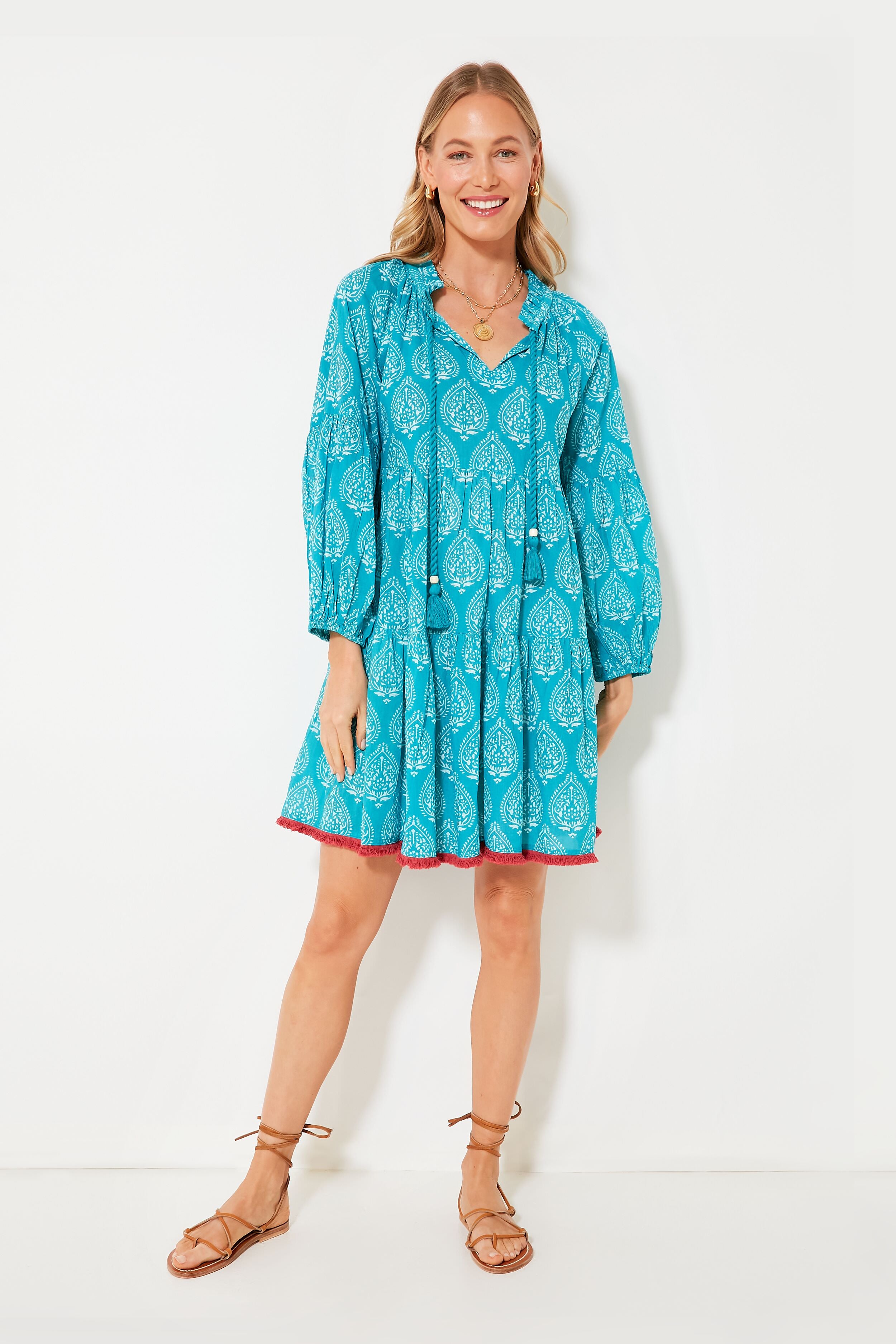 Boho chic meets casual coolness with the Tropical Teal Lantern Tie Neck Coverup. Dainty white block print motifs decorate the body and is vibrantly accented by red fringe along the hem and corded tassel neckties allow you wear this style open or done in a bow. With long sleeves to keep you protected from the sun but won't leave you overheated and tiered silhouette for a breezy feel. we are wearing this everywhere from backyard BBQs to walking the boardwalk. just grab a pair of sandals and sunnies are you're all set.