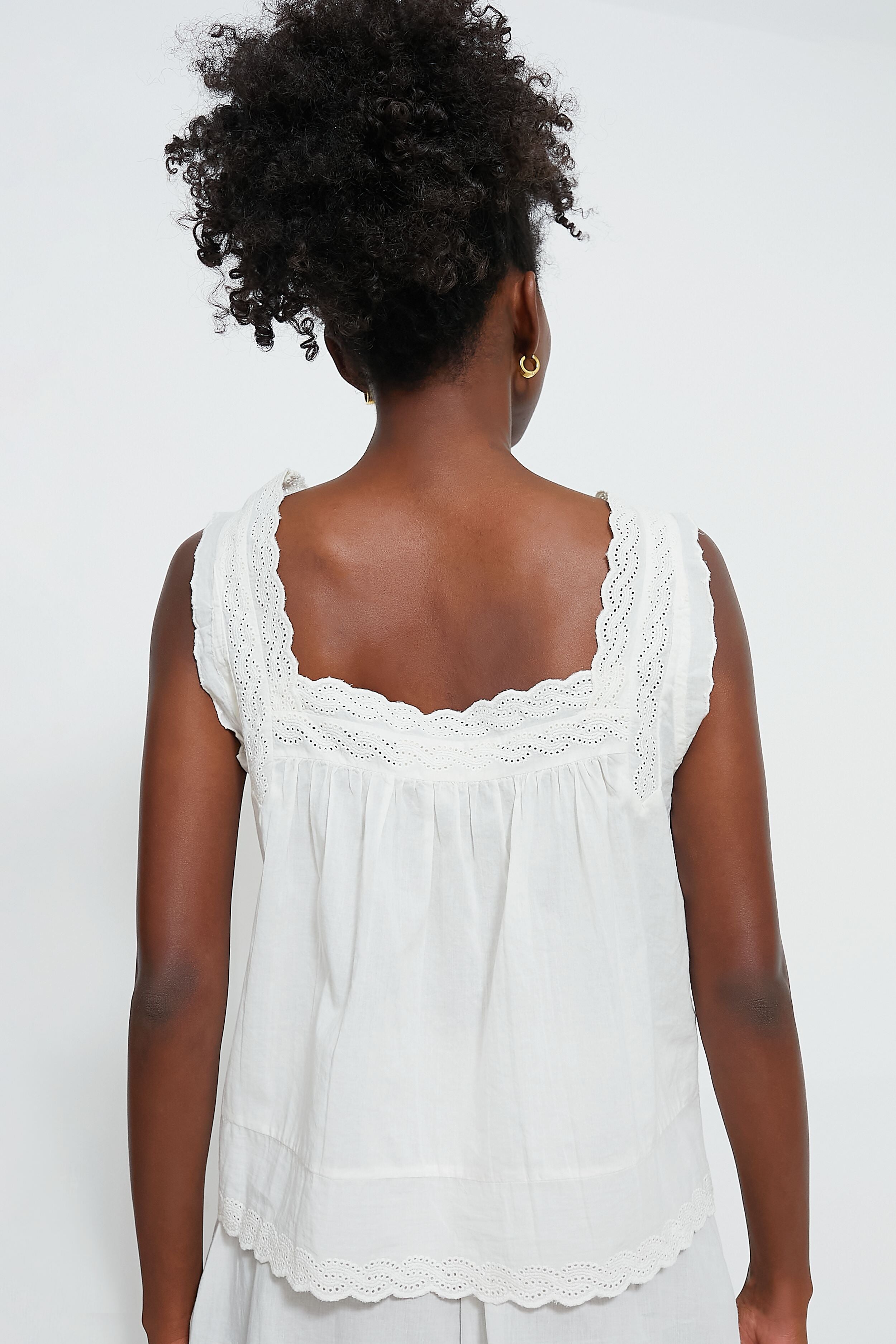 Elegance without effort. The Eyelet Ruffle Tank is crafted from super soft. lightweight cotton voile fabric. The flattering. flowy silhouette features a scooped front and back neckline. dainty shoulder straps. and a swingy hemline for added movement and swing that you'll want to take from day to night. Pair with The Eyelet Tap Short and slippers for a movie night at home. or with denim and sandals for a warm summer day.